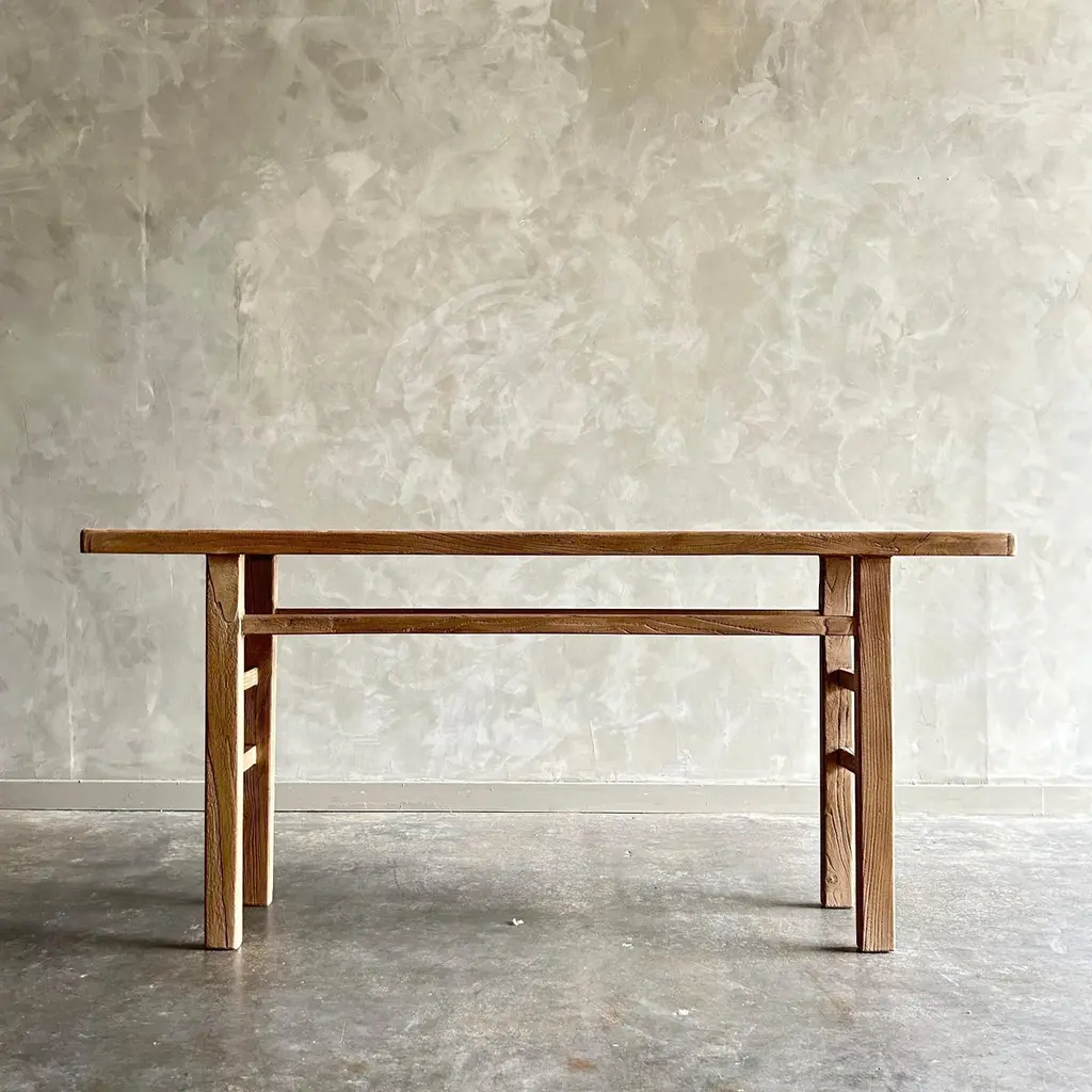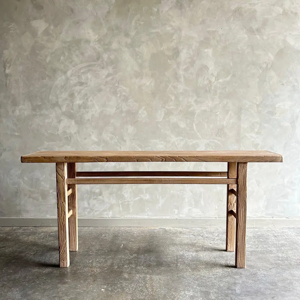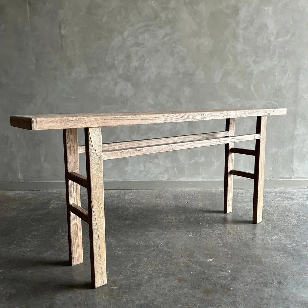 Reclaimed Elm Wood Console Table. Beautiful antique patina, these are solid and sturdy ready for daily use, use as an entry table, sofa table or console in a dining room. Great in a living room with baskets or ottomans stored under. -Each piece is truly unique and one of a kind with different characteristics in the wood. Please note with all reclaimed wood items, there may be imperfections which is considered normal and only adds character to the pieces. Solid elm woodFinish: Natural / Wax75”w x 14”d x 33.5”hCare Instructions : Avoid direct sunlight; avoid exposure to heat; avoid excessive moisture. Use coasters and trivets to protect the surface from wet or hot cups or dishes. Avoid sharp objects. Address spills immediately by wiping with a soft, dry cloth.