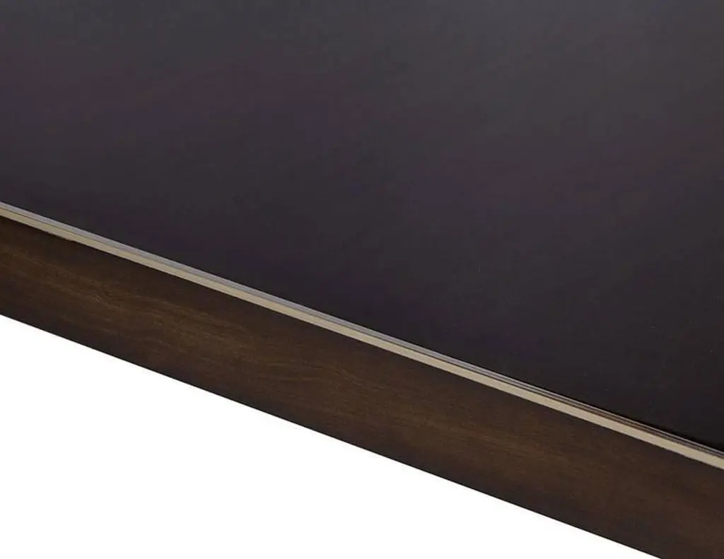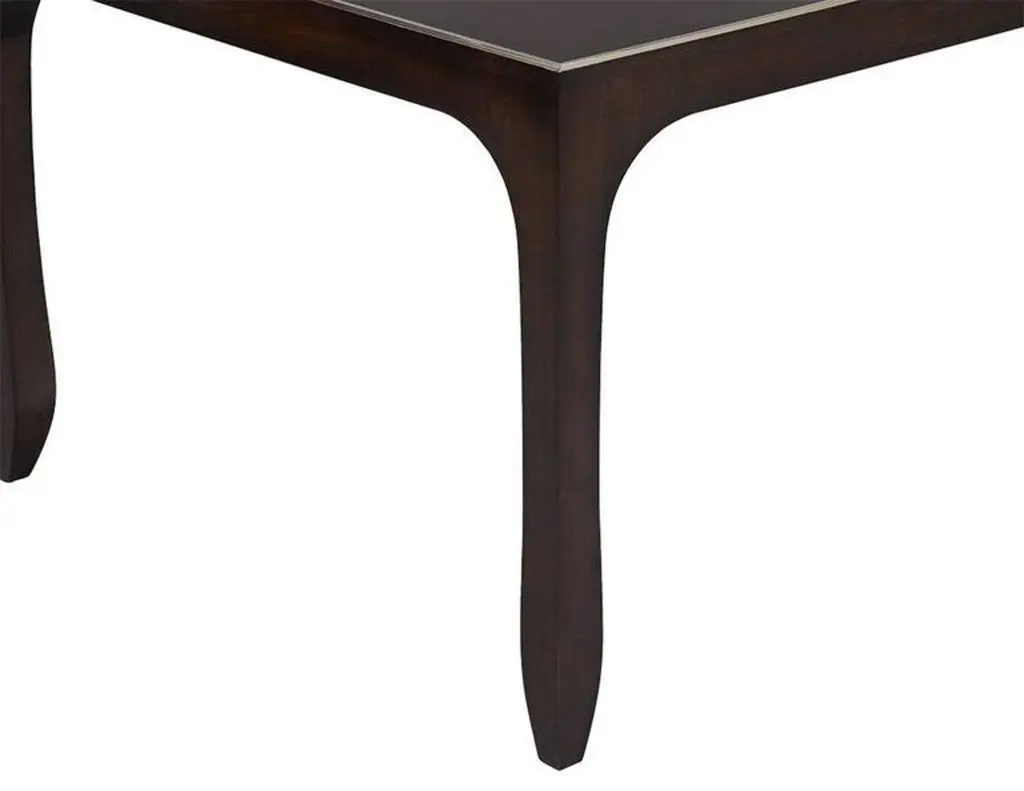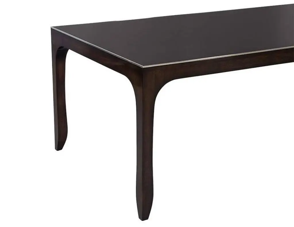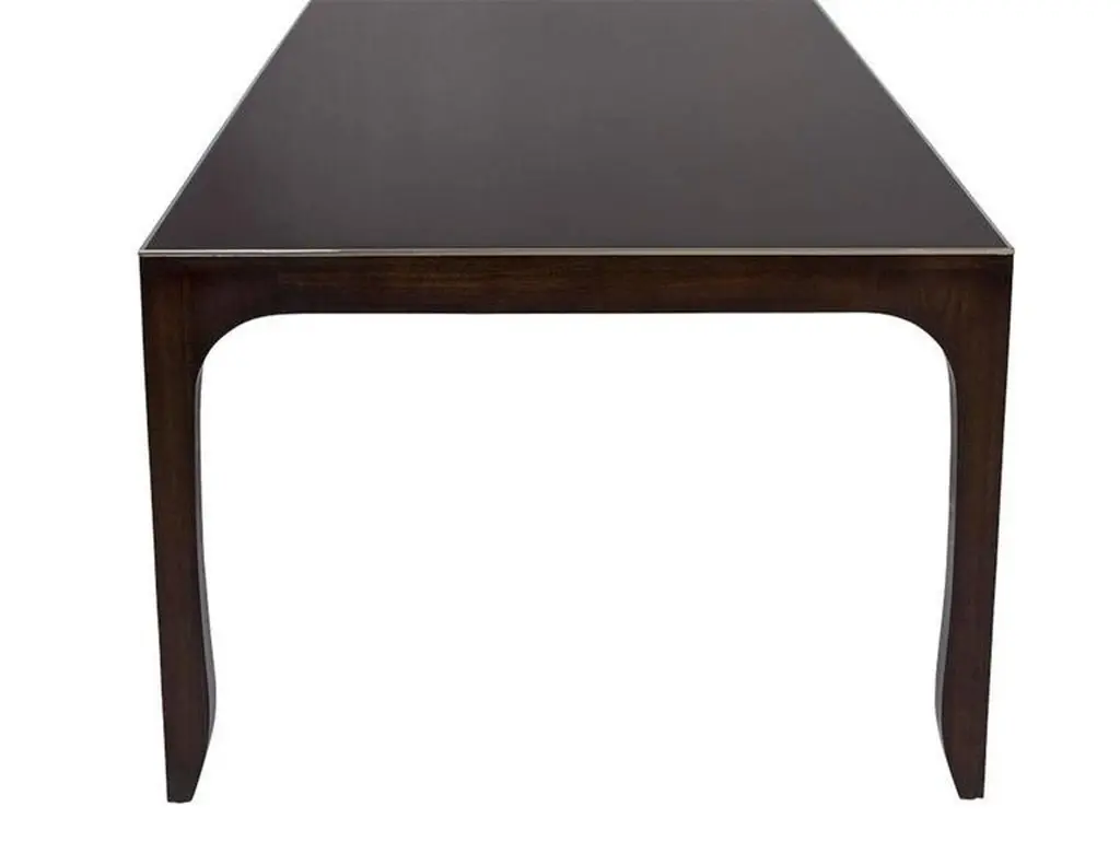 A stunning linear appeal with Classic modern aesthetic, this custom walnut dining table is a perfect drop of design. An overall simplicity captures the eye with a filleted transition from the apron to the legs, a rift cut walnut veneered top slightly beveled around the perimeter featuring unique metal trim and a rich dark Espresso satin finish. As an item in our custom program, you can order this table to the dimensions and finish required for your space. Listed price is for table as seen.Price includes complimentary curb side delivery to the continental USA.