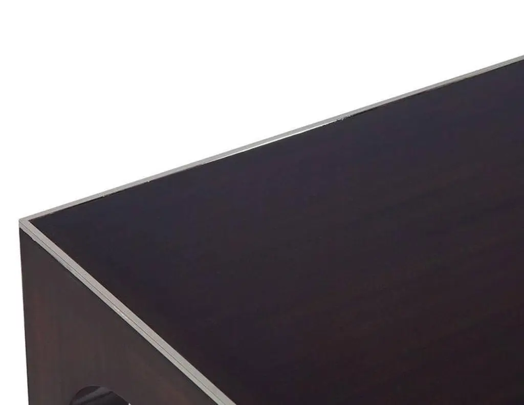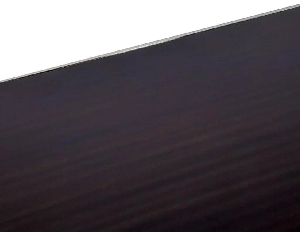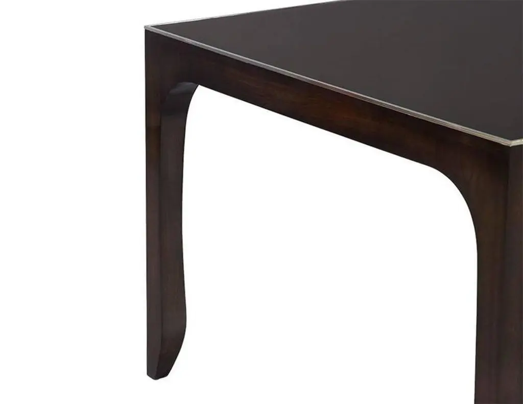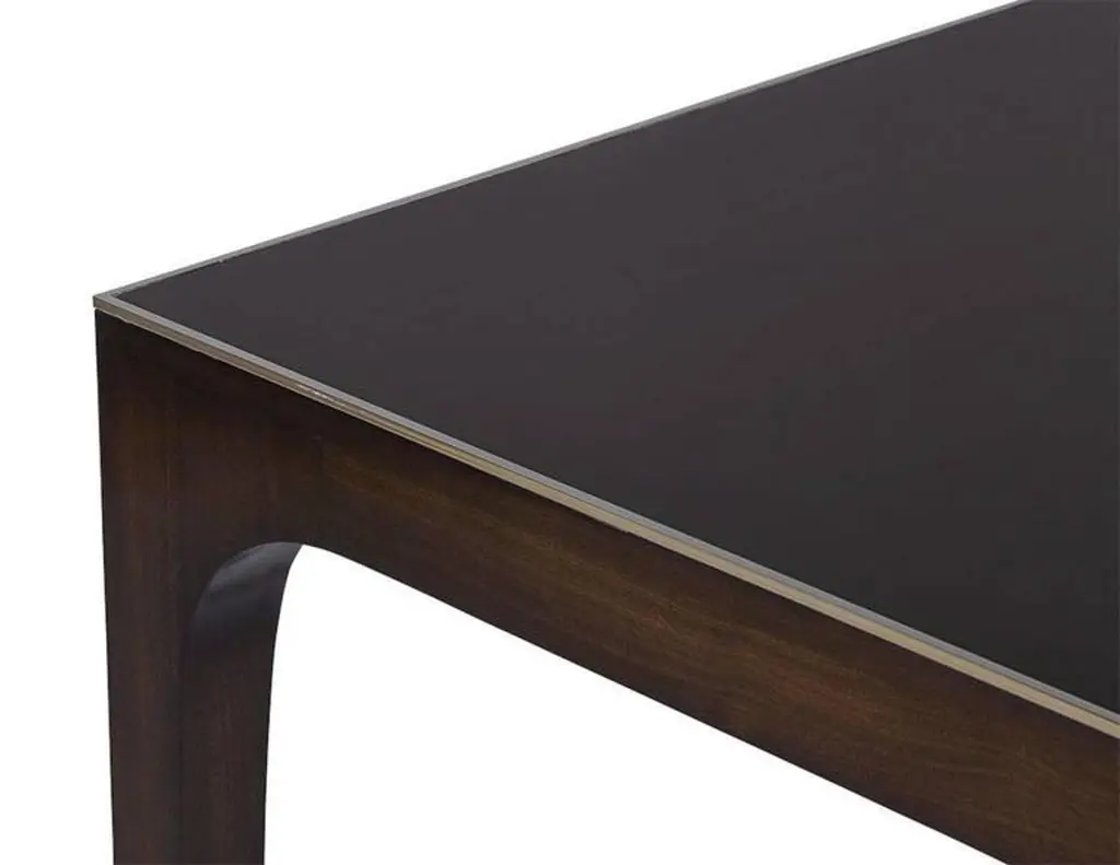 A stunning linear appeal with Classic modern aesthetic, this custom walnut dining table is a perfect drop of design. An overall simplicity captures the eye with a filleted transition from the apron to the legs, a rift cut walnut veneered top slightly beveled around the perimeter featuring unique metal trim and a rich dark Espresso satin finish. As an item in our custom program, you can order this table to the dimensions and finish required for your space. Listed price is for table as seen.Price includes complimentary curb side delivery to the continental USA.