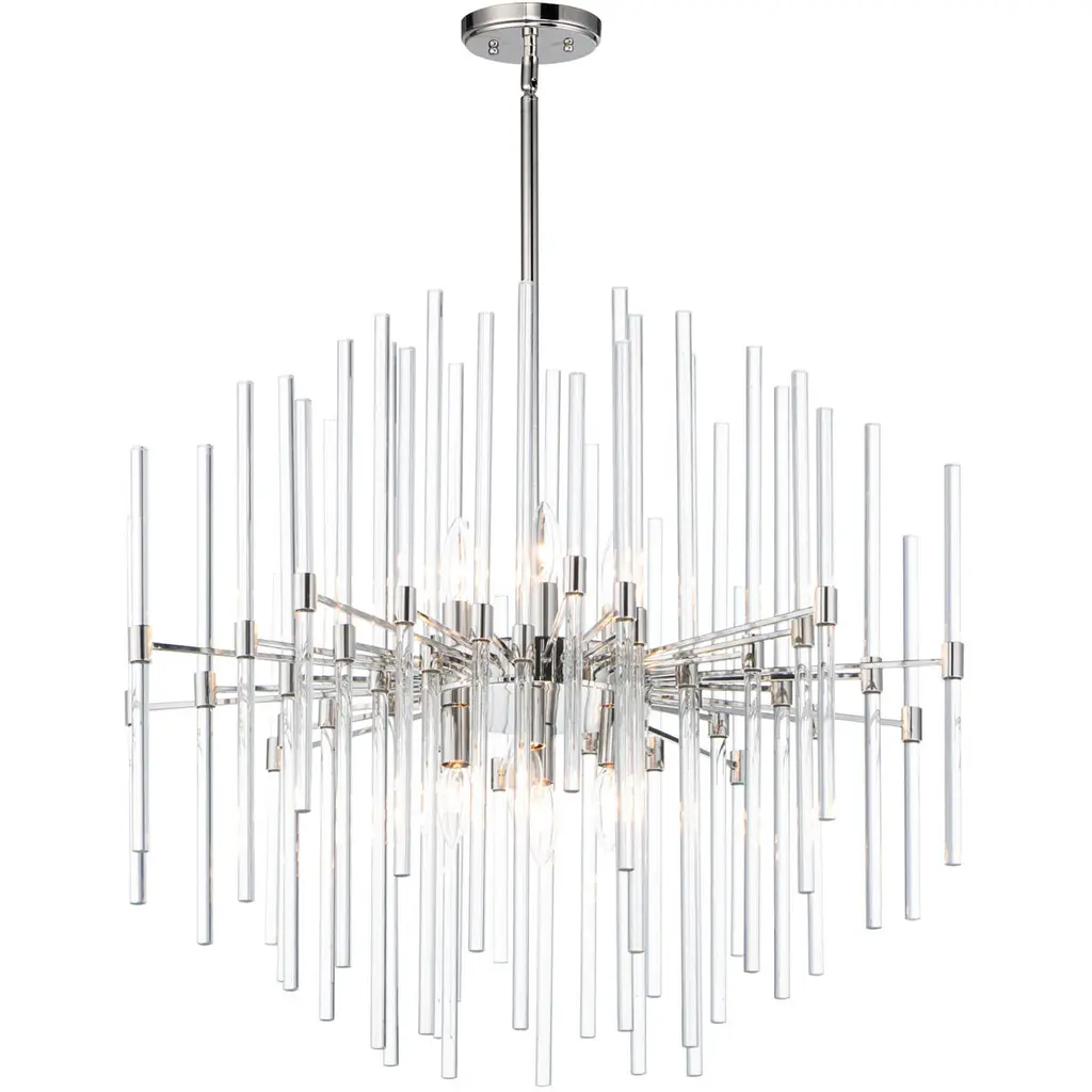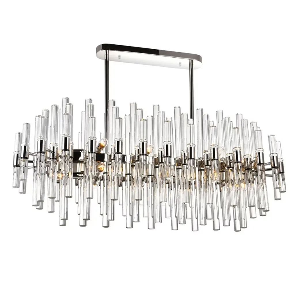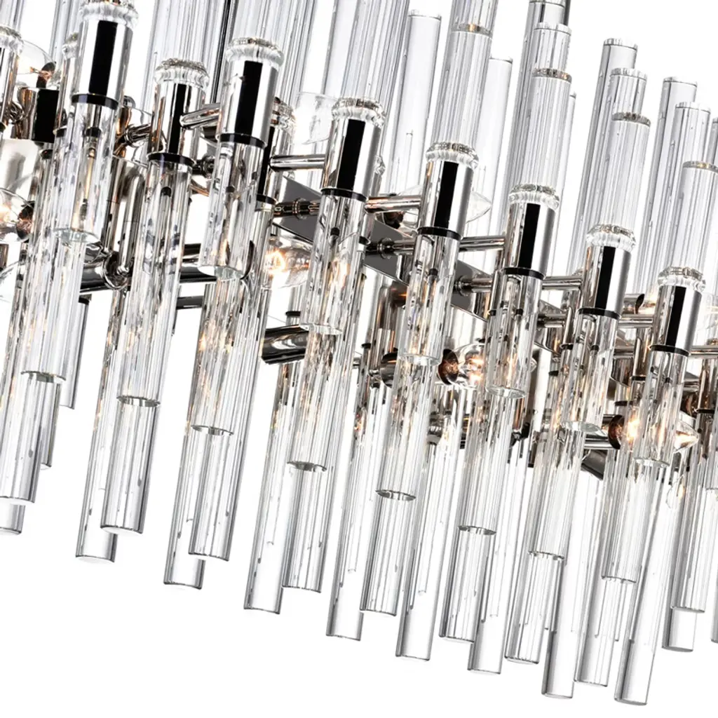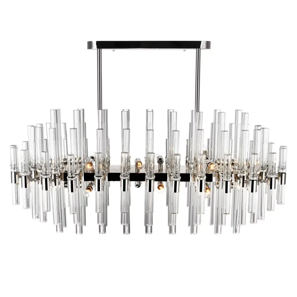 The Miroir 16 Light Chandelier displays a clean, sparkling aesthetic while radiating modern minimalist elegance. This linear chandelier measures 40 inches long and features vertical clear glass tubes extending above and below the polished nickel central base. Hang this over your long, rectangular dining table and watch it cast an inviting atmosphere that will impress your family, friends, and guests