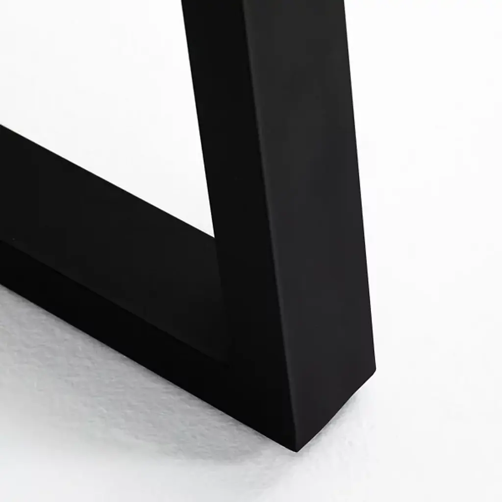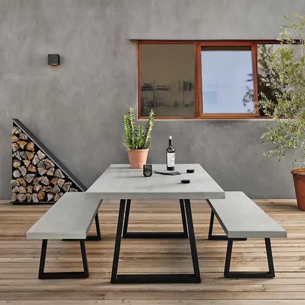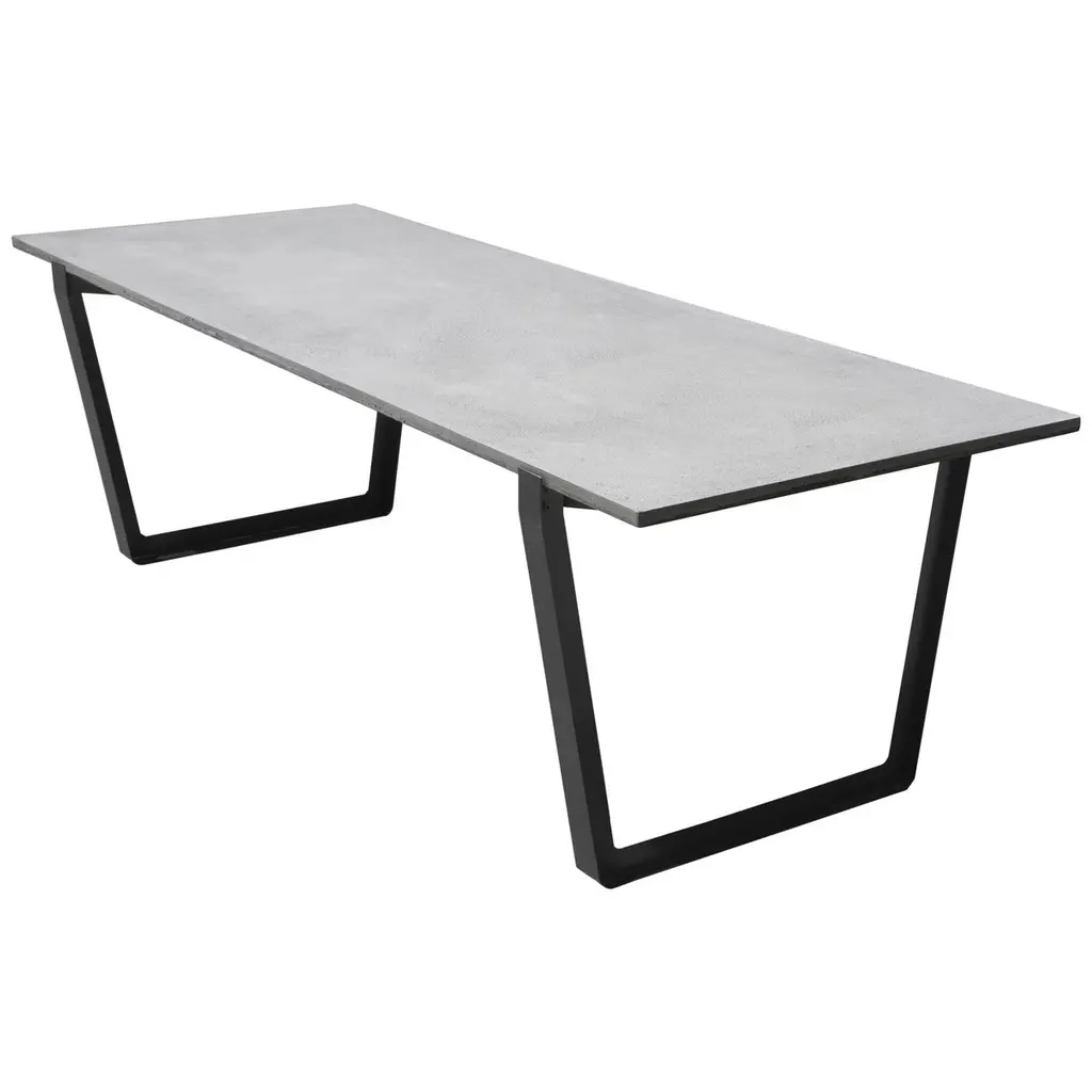 The Cyrus Outdoor Dining Table from Four Hands combines natural elegance with architectural style. The poly-resin top, crafted from river sand, is polished to a sleek sheen and sits atop an angular black iron base, adding a bold, modern touch. Slight color variations enhance its organic lava stone-inspired character, making each piece unique. Perfect for outdoor gatherings, this table should be covered or stored indoors during harsh weather or when not in use, preserving its striking appeal year-round.