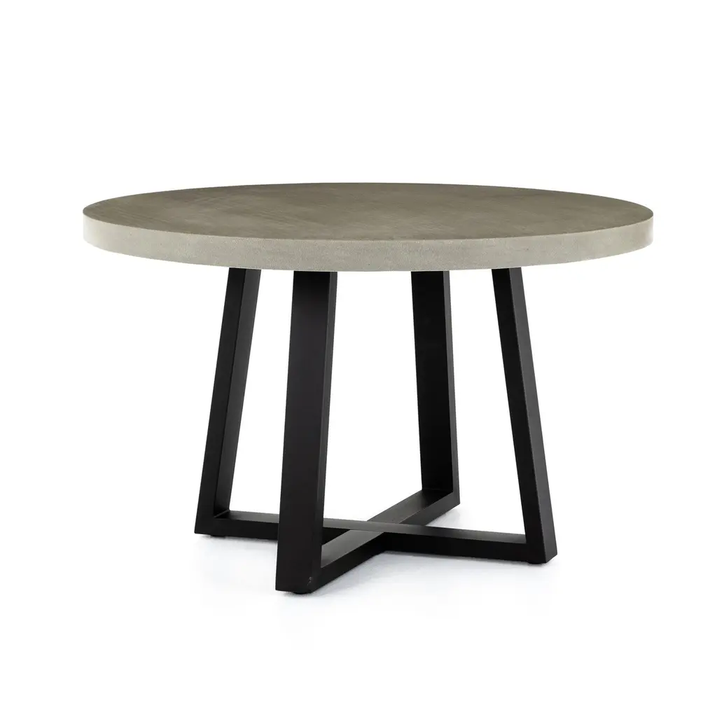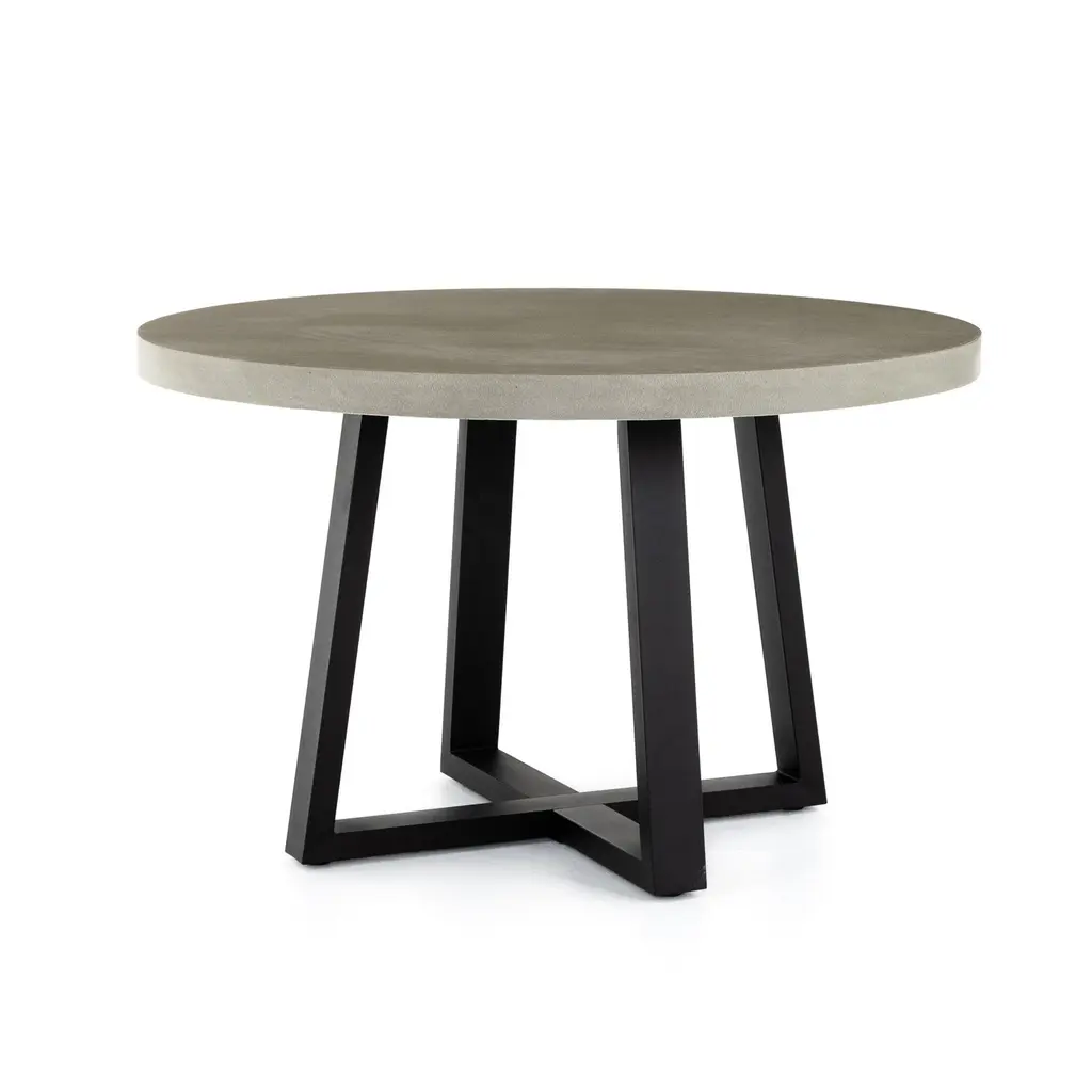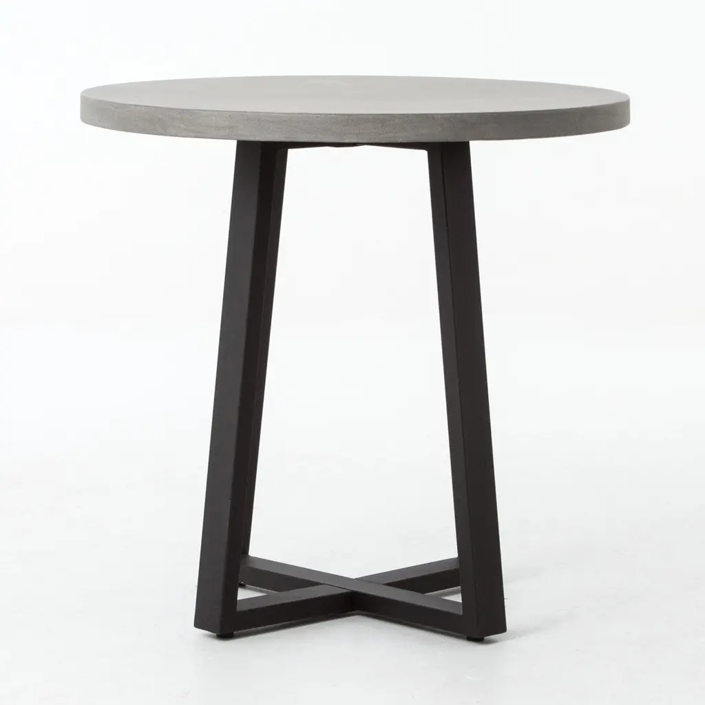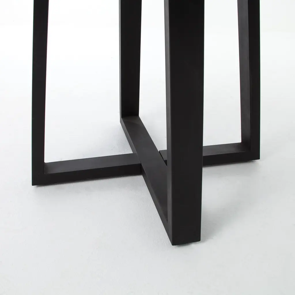 A strikingly simple poly-resin top derived from river sand is polished to a smooth sheen. An angled, matte black iron base adds architectural appeal to this small-scale dining table. Slight color variance is to be expected, and speaks to lava stone's organic nature. Cover or store indoors during inclement weather and when not in use.