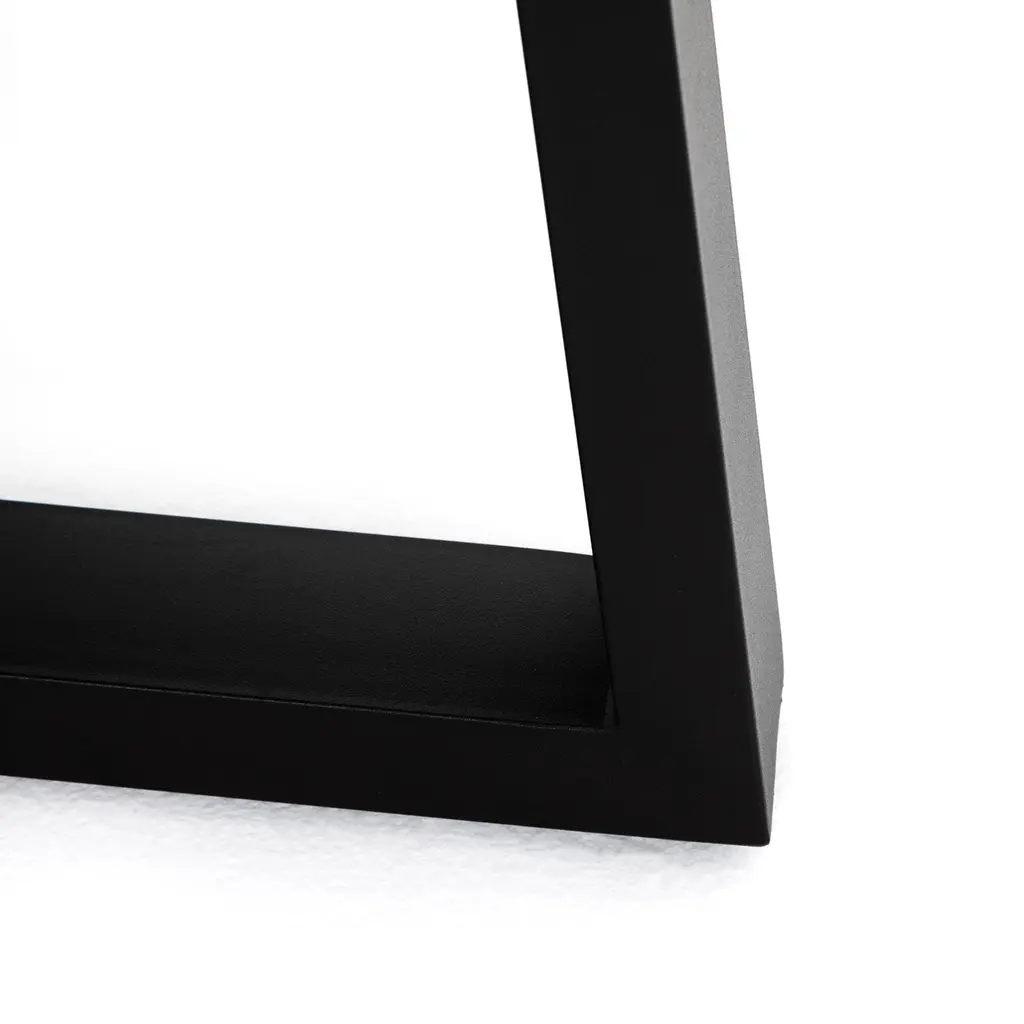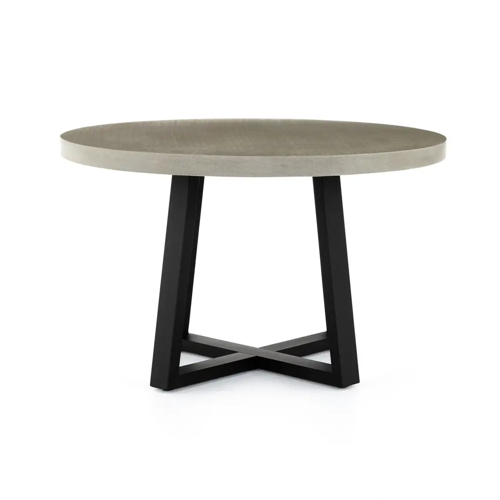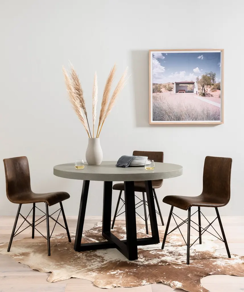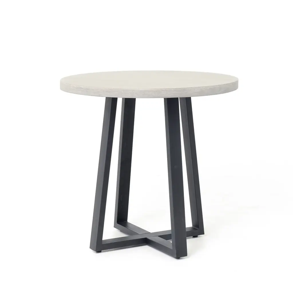 A strikingly simple poly-resin top derived from river sand is polished to a smooth sheen. An angled, matte black iron base adds architectural appeal to this small-scale dining table. Slight color variance is to be expected, and speaks to lava stone's organic nature. Cover or store indoors during inclement weather and when not in use.