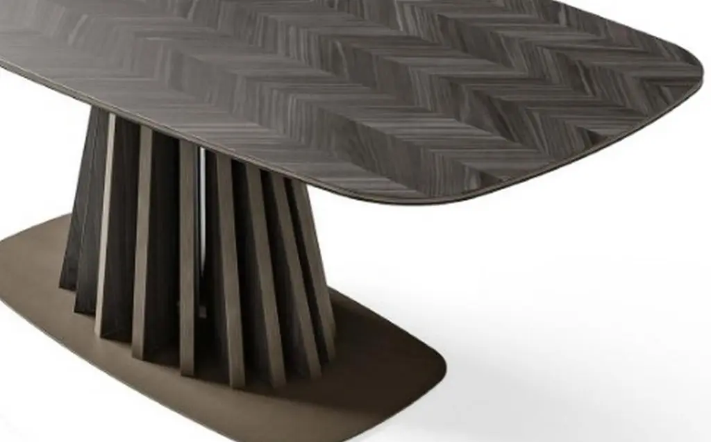 Chic, organic influences shape in the inlaid dining table.On a tree-shaped base in walnut wood, available in a dark or light stain, the table stands on a metal plate and is topped with wood veneer in a gorgeous Hungarian herringbone pattern. Topped with a sheet of glass to preserve the wood for the years to come.