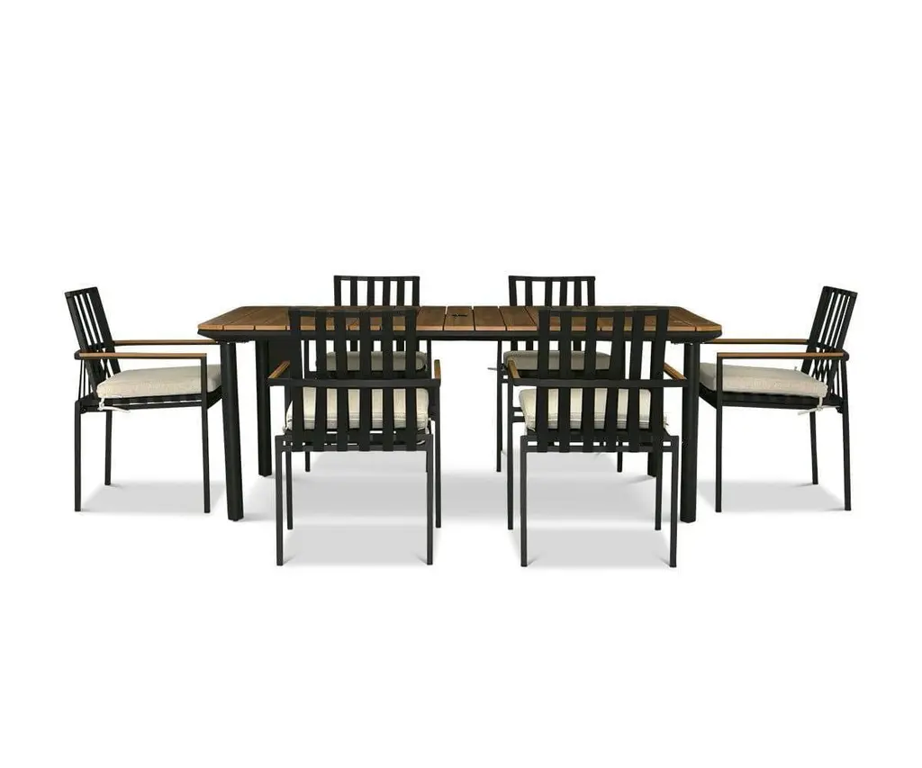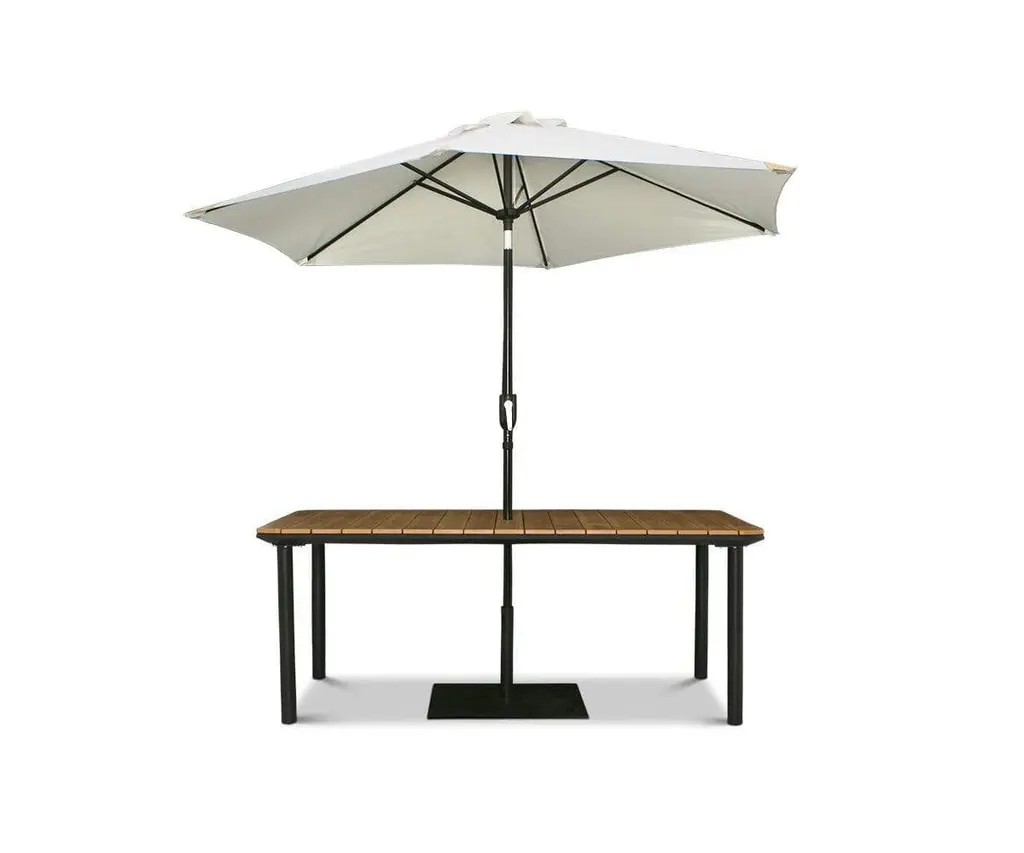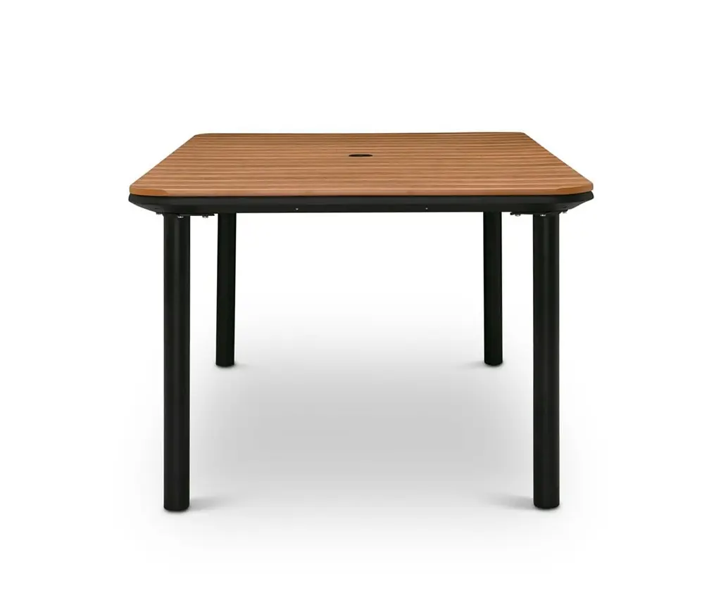 Our philosophy: enjoy every meal you can in the sun! The Da Costa Outdoor Dining Table fits that concept perfectly. The faux-teak tabletop hearkens to tropical relaxation, while the black powder coated frame offers stunning visual contrast. Plus, the handy umbrella hole lets you add shade with ease. Shown with Da Costa