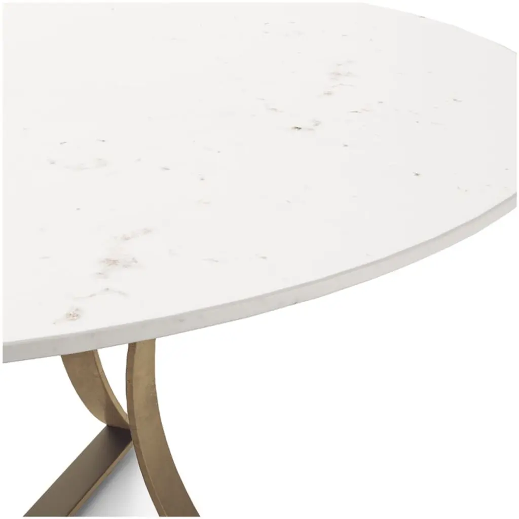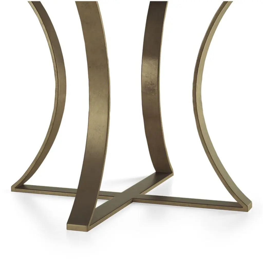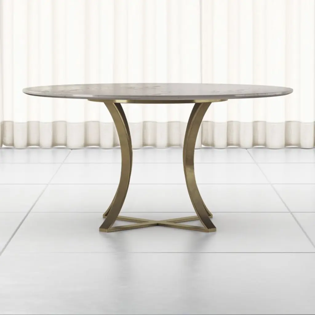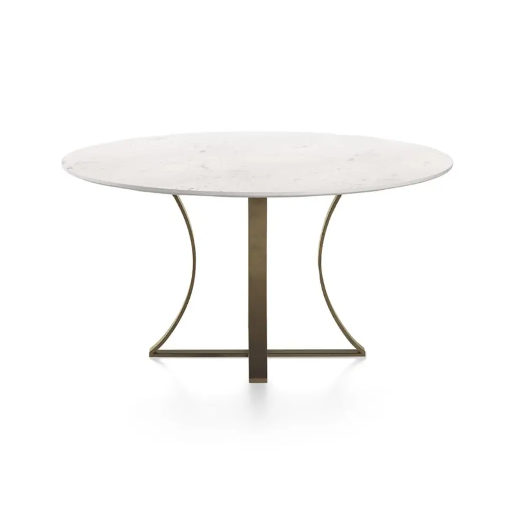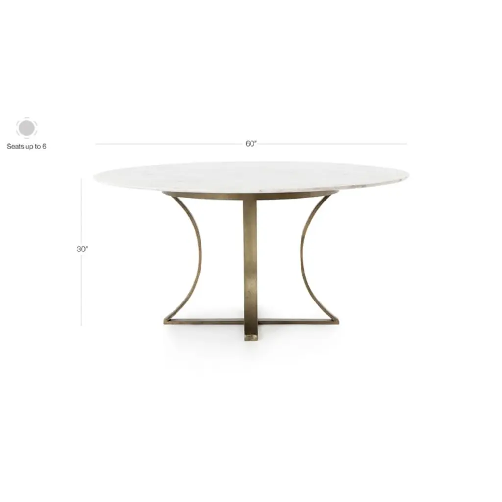 Sophisticated materials engage in modern geometry to shape this elegant dining table. Brass-finished iron curves the open pedestal base that supports a round top of beautifully veined white marble. At home in the modern or classic dining room, the Damen table seats six.