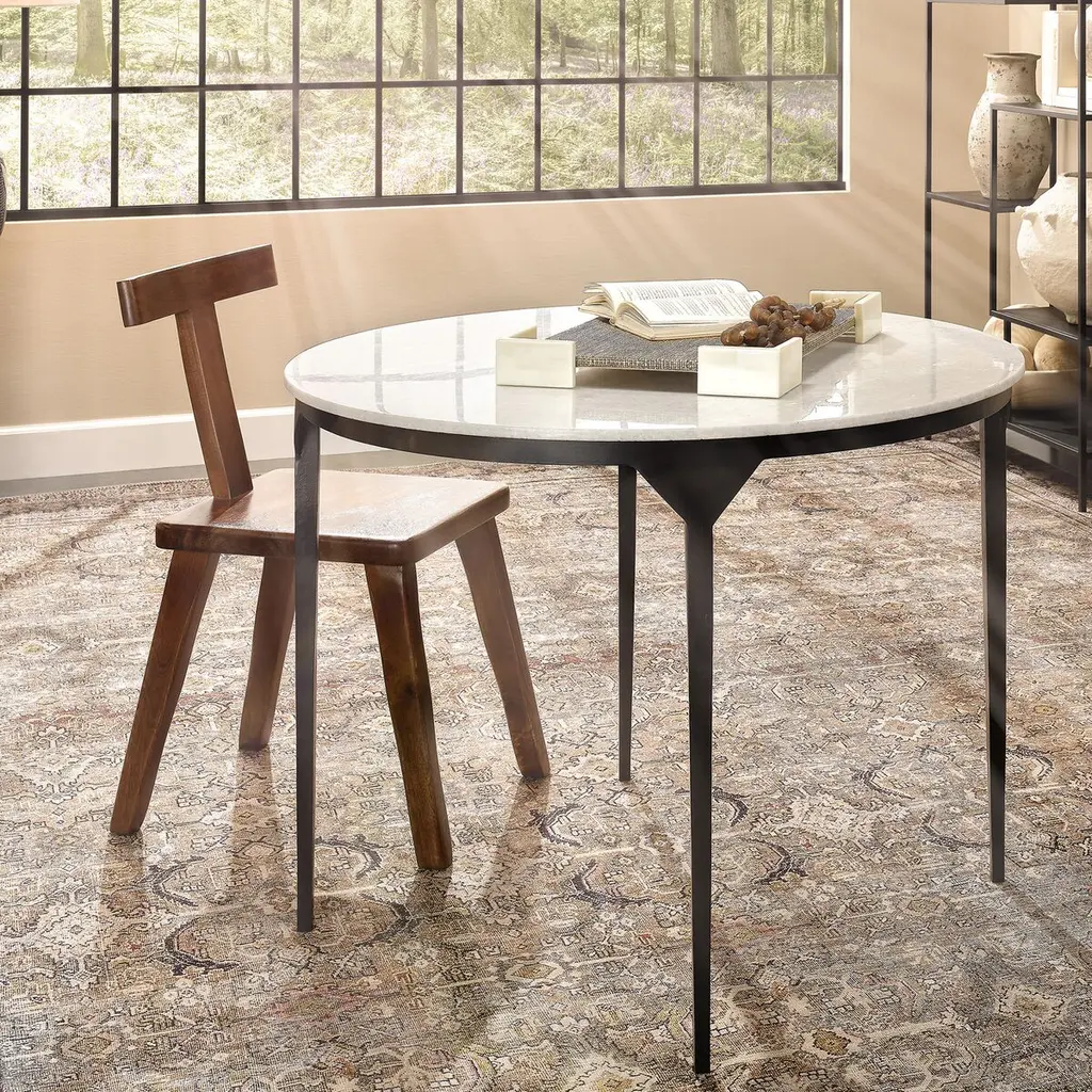 Forged from iron and topped with a circle of pure creamy white marble, this refined dining option is distinguished by the elegance of its lines and the skill of the artisans who craft it. The delicacy of its slim legs belies their strength, and the simplicity of the classic design makes it an easy, instant update for most contemporary decors.