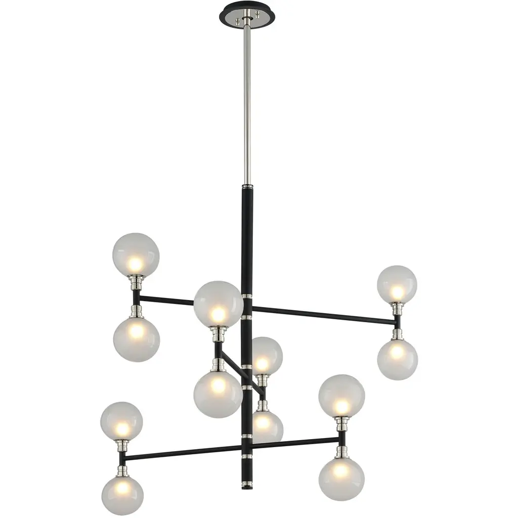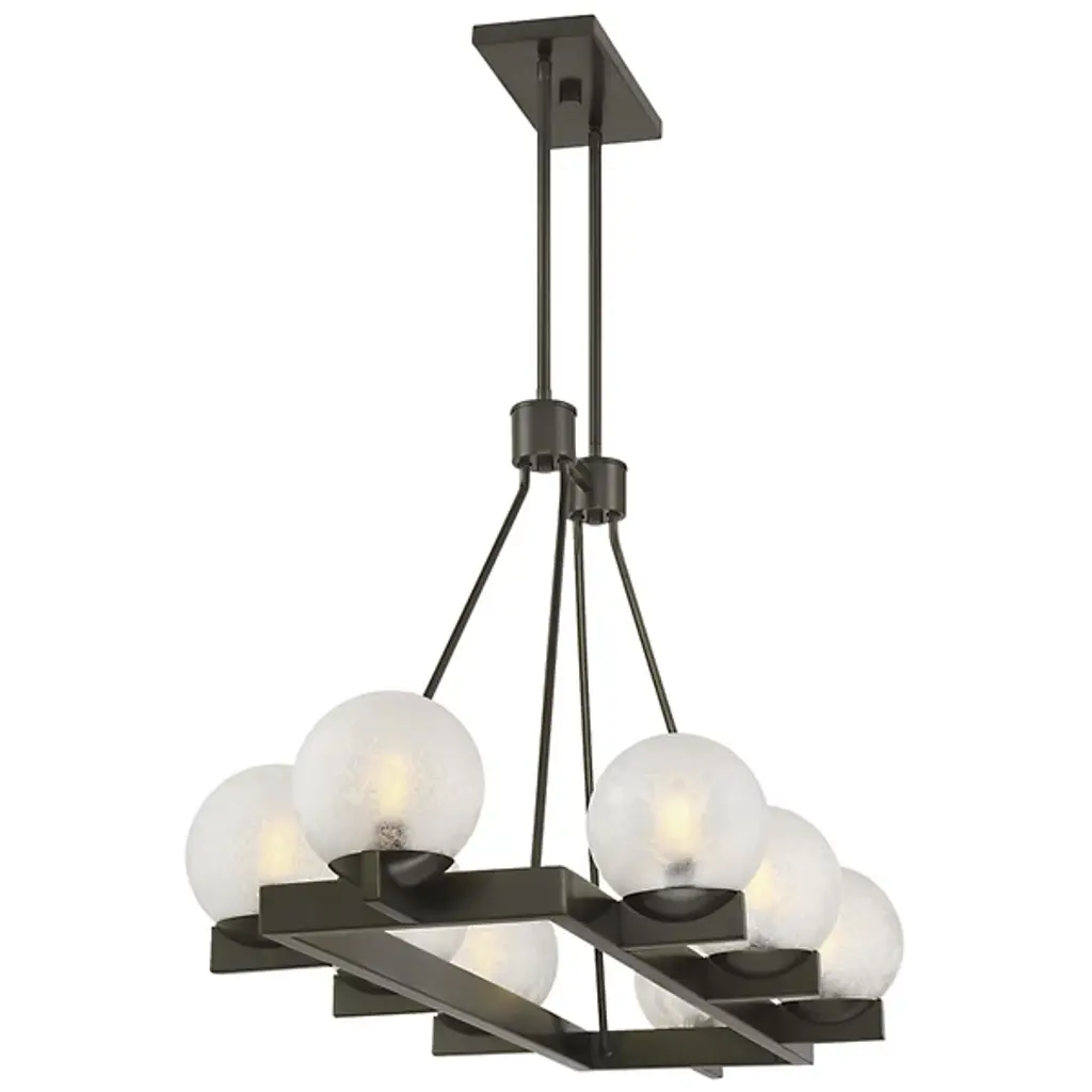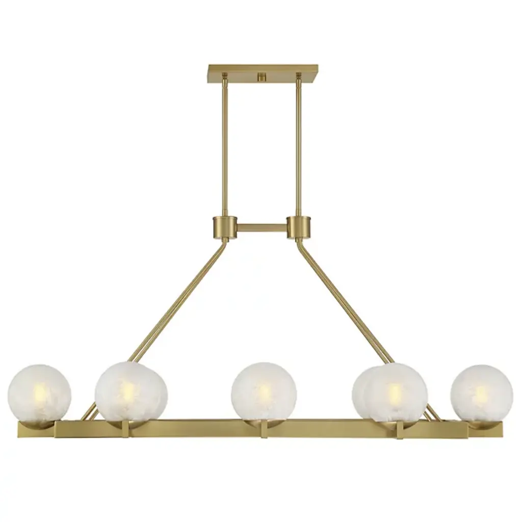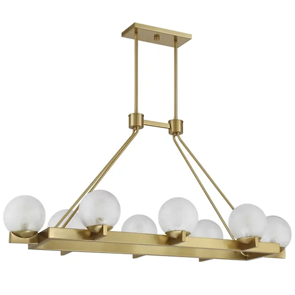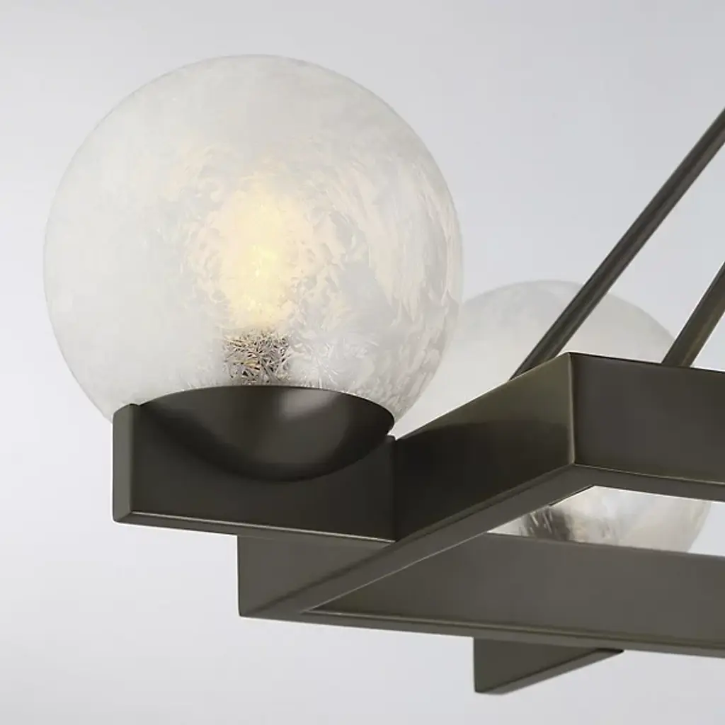 The Darien Linear Suspension from Savoy House aligns eight textured ice glass globes in a row, creating a horizontal lighting solution ideal for long dining tables or kitchen islands. Each frosted sphere sits within the elongated metal frame, producing a consistent pattern of light across its length. The fixture's height can be adjusted during installation to work with different ceiling heights. When illuminated, the textured glass diffuses light evenly while revealing intricate frost patterns throughout each sphere. This dimmable design allows you to change the mood from bright task lighting to subtle ambient illumination.
