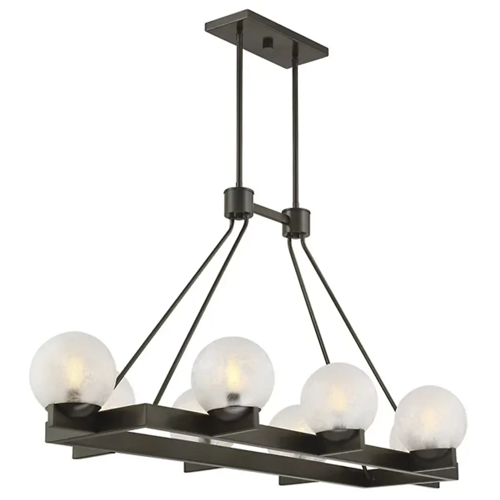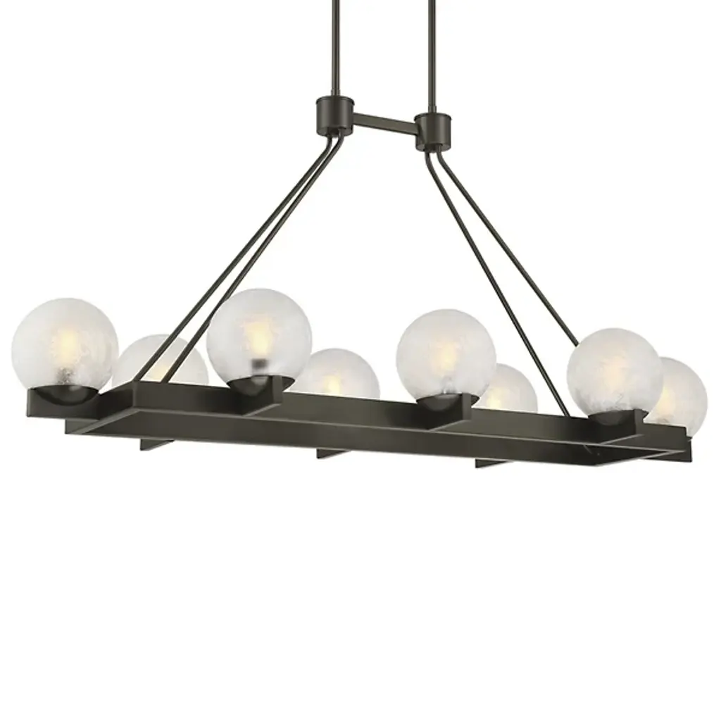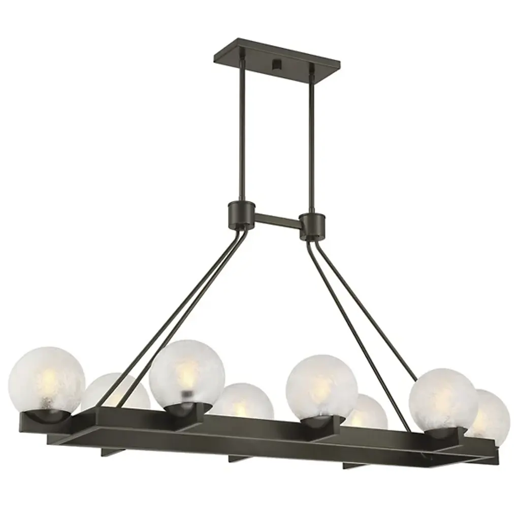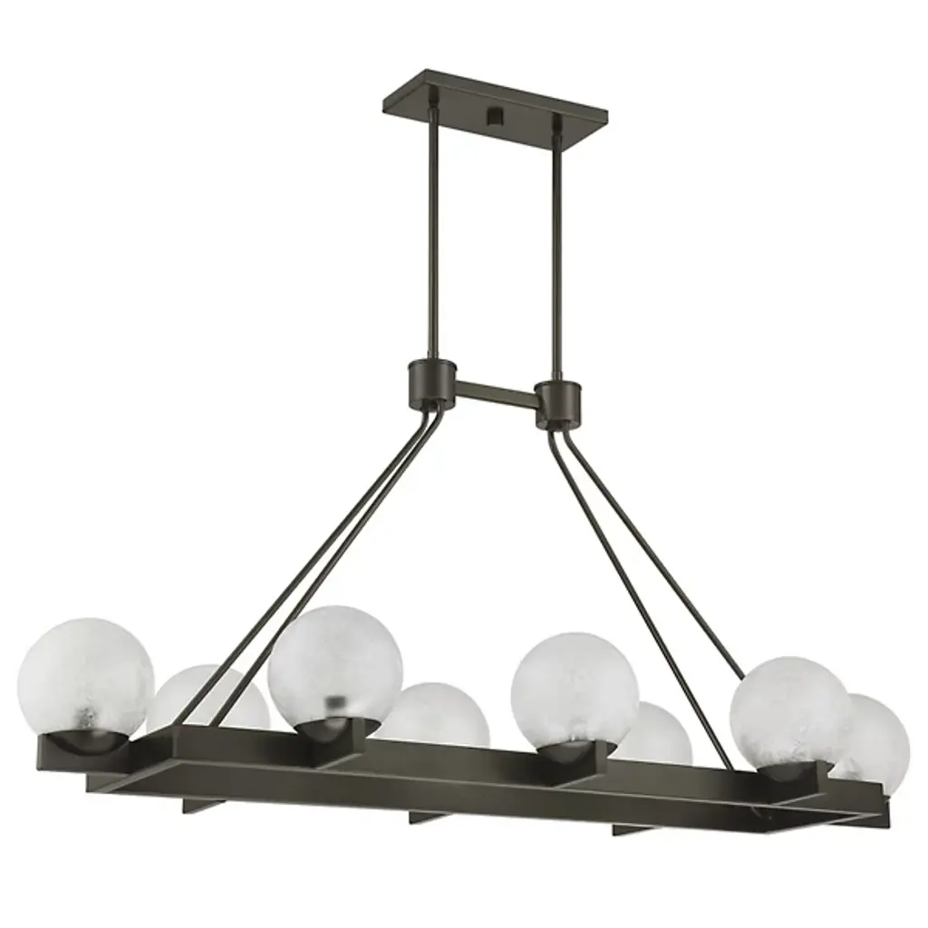 The Darien Linear Suspension from Savoy House aligns eight textured ice glass globes in a row, creating a horizontal lighting solution ideal for long dining tables or kitchen islands. Each frosted sphere sits within the elongated metal frame, producing a consistent pattern of light across its length. The fixture's height can be adjusted during installation to work with different ceiling heights. When illuminated, the textured glass diffuses light evenly while revealing intricate frost patterns throughout each sphere. This dimmable design allows you to change the mood from bright task lighting to subtle ambient illumination.