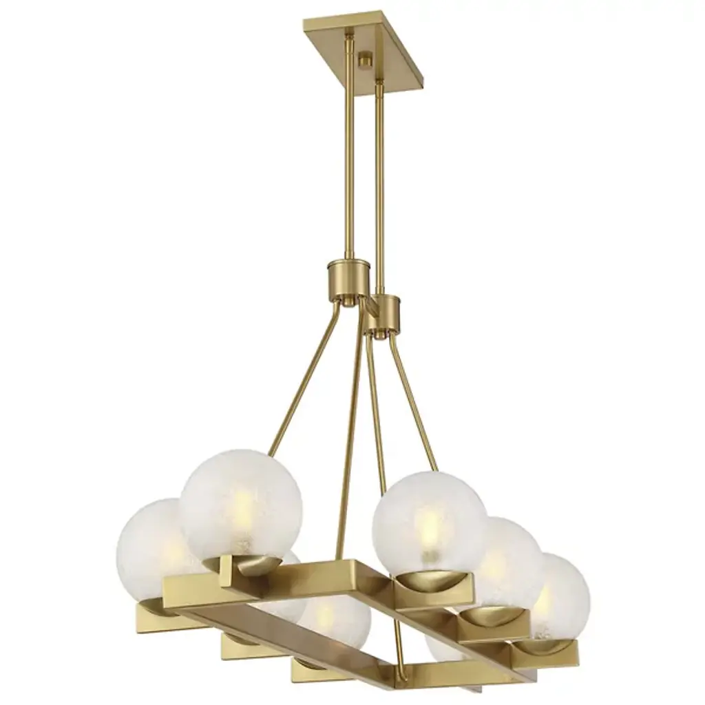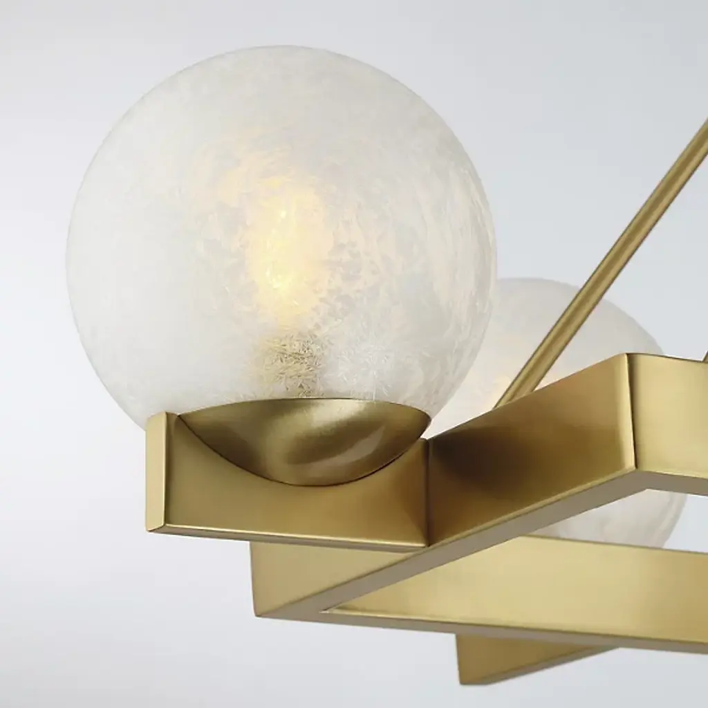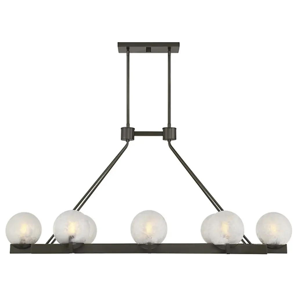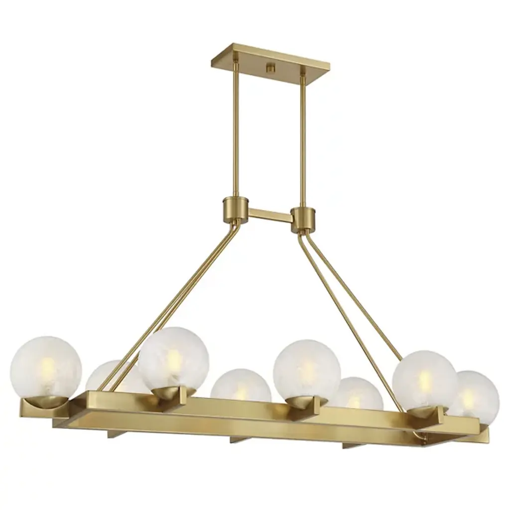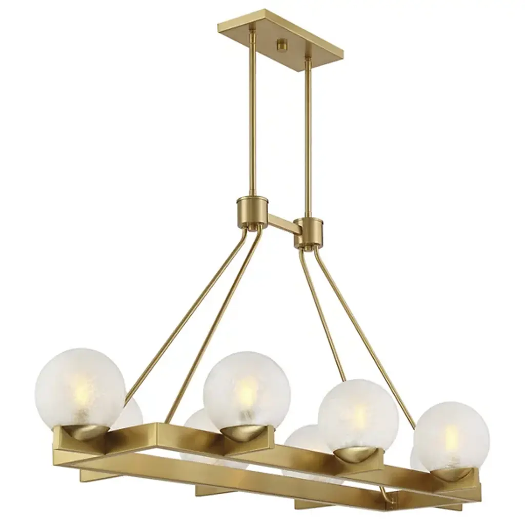 The Darien Linear Suspension from Savoy House aligns eight textured ice glass globes in a row, creating a horizontal lighting solution ideal for long dining tables or kitchen islands. Each frosted sphere sits within the elongated metal frame, producing a consistent pattern of light across its length. The fixture's height can be adjusted during installation to work with different ceiling heights. When illuminated, the textured glass diffuses light evenly while revealing intricate frost patterns throughout each sphere. This dimmable design allows you to change the mood from bright task lighting to subtle ambient illumination.