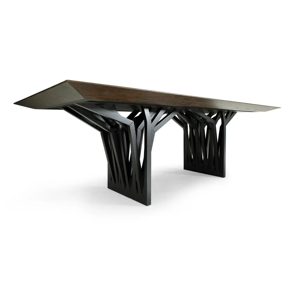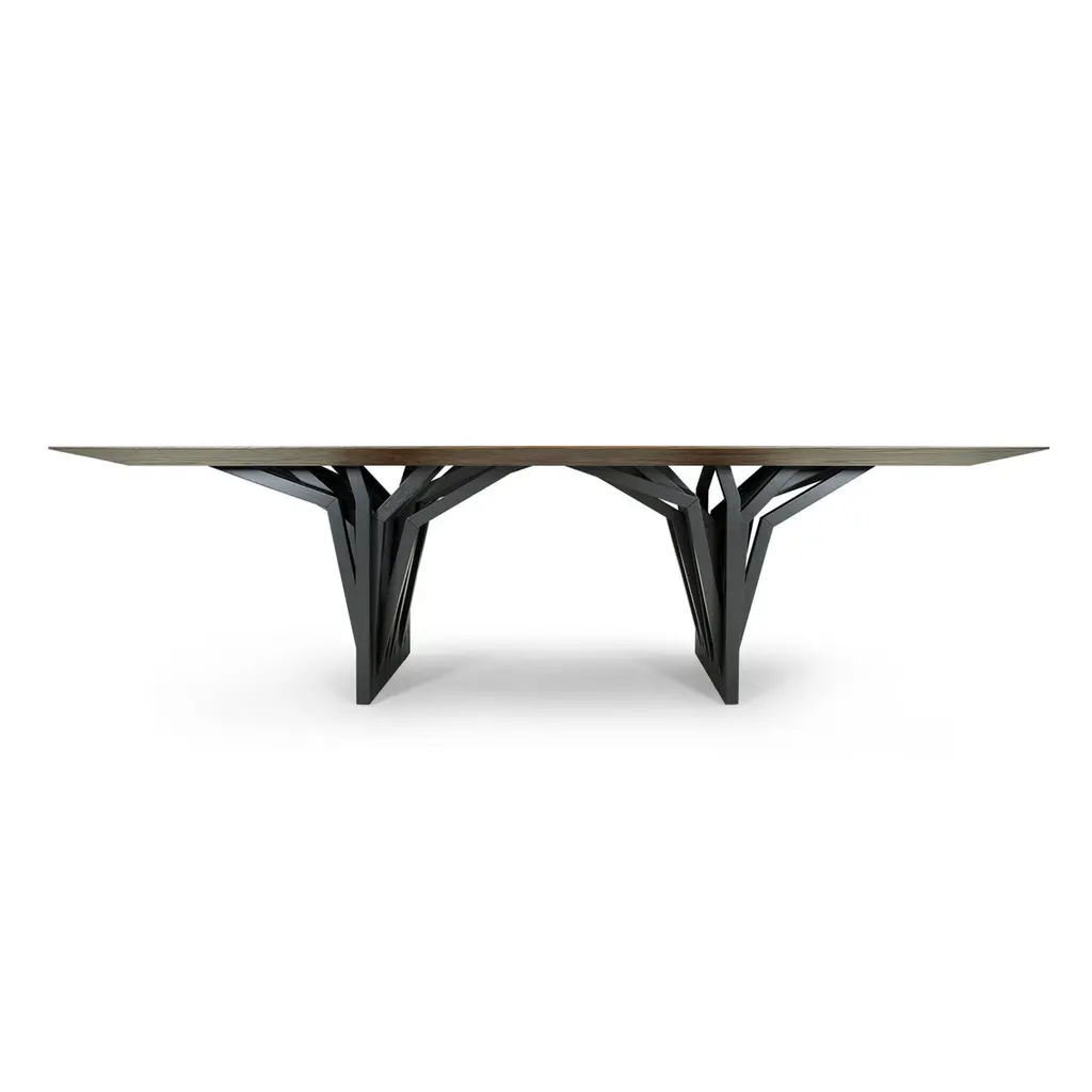 Designed by Sérgio Batista for Uultis, the Radi dining table features a 98-inch top in dark oak veneer and a sculptural matte black base inspired by architectural roofing anchors and the organic lines of tree roots. The result is a bold yet refined form—visually striking from every angle, while grounded in functional stability.The top’s rich oak grain brings warmth and natural elegance, subtly contrasting with the angular base structure. With its generous proportions and strong linear silhouette, the Radi table offers versatility in a variety of interiors, from minimalist to industrial, contemporary to transitional.Perfect as a focal point in a dining room, this signed piece easily seats eight to ten depending on chair style and spacing, making it ideal for entertaining, large family dinners, or even stylish commercial use in hospitality or office spaces. Pair it with sculptural wood or upholstered dining chairs for a cohesive setting.Sustainably crafted and finished with a matte protective coat, the Radi table is designed for durability as well as aesthetic impact. It ships flat-packed with clear, step-by-step assembly instructions for easy setup.This piece reflects Uultis’s commitment to thoughtful Brazilian design, environmentally conscious materials, and timeless construction.