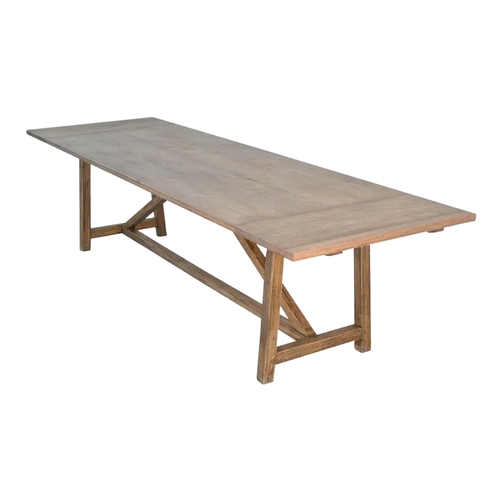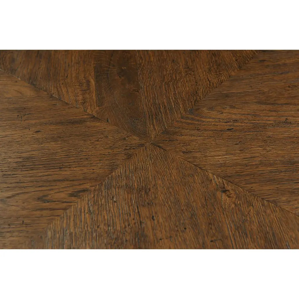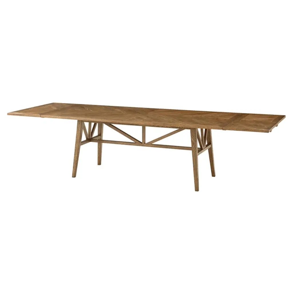 A dark oak parquetry extending dining table with finely tapered oak legs. This beautiful table is crafted from rustic oak with a herringbone parquetry design. It offers two extension leaves and over a flat truss. Shown in Dusk FinishDimensions120" W x 40" d x 30" H Fully Closed 84" W x 40" D x 30" h.