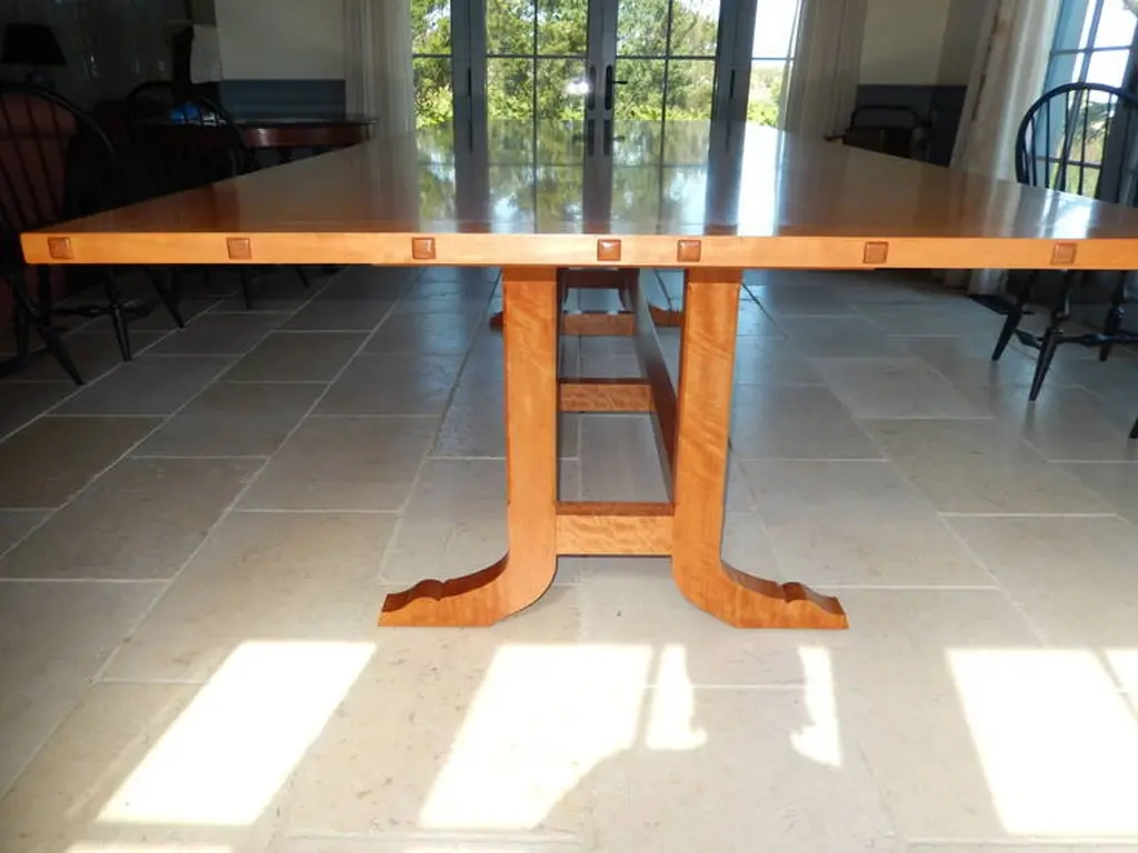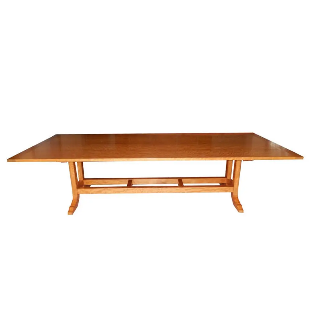 A magnificent one of a kind dining room table or conference room table by studio Craft artist David N. Ebner. This table is cut from one continuous length of solid Makore wood from Sierra Leone, Africa.The table seats 12 to 14 people very easily.There are no veneers, crafted of solid Makore wood.Please see the newly published book "David N Ebner Studio Furniture" by Nancy Schiffer.Through the use of stripped down Classic forms, David Ebner has updated and extended the mode of furniture solidified by Wharton Esherick, George Nakashima, Sam Maloof and the early Wendell Castle.Mr Ebner's works are in permanent collections in the Smithsonian Institute. The Museum of Fine Arts in Boston, The Art Institute of Chicago and have been featured in The New York Times, art and antiques and more.As a designer he says, "I like to find the essence, remove the embellishment and get down to the spirit of a line or design.".