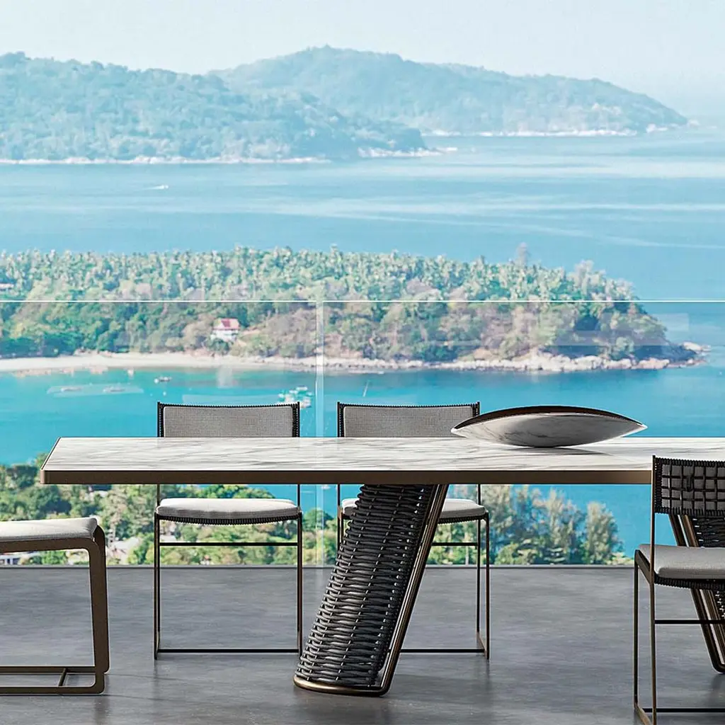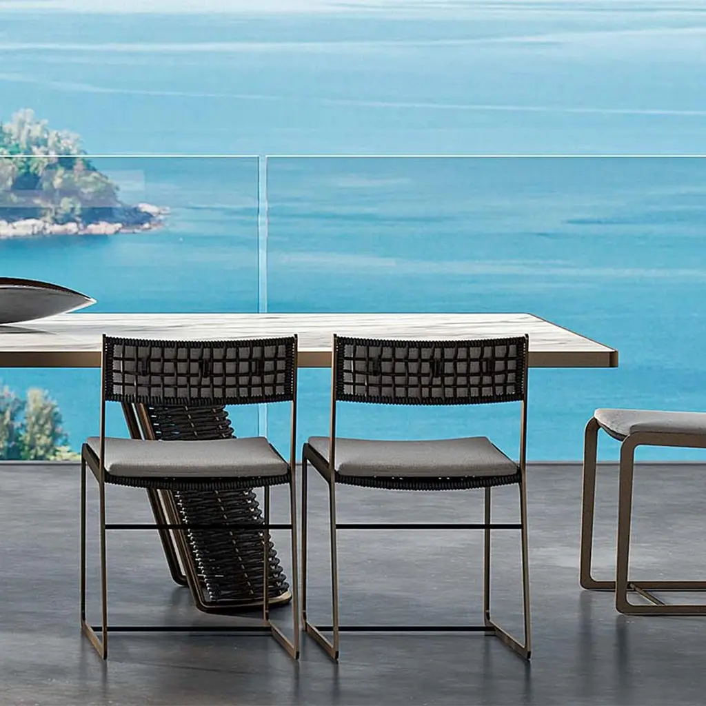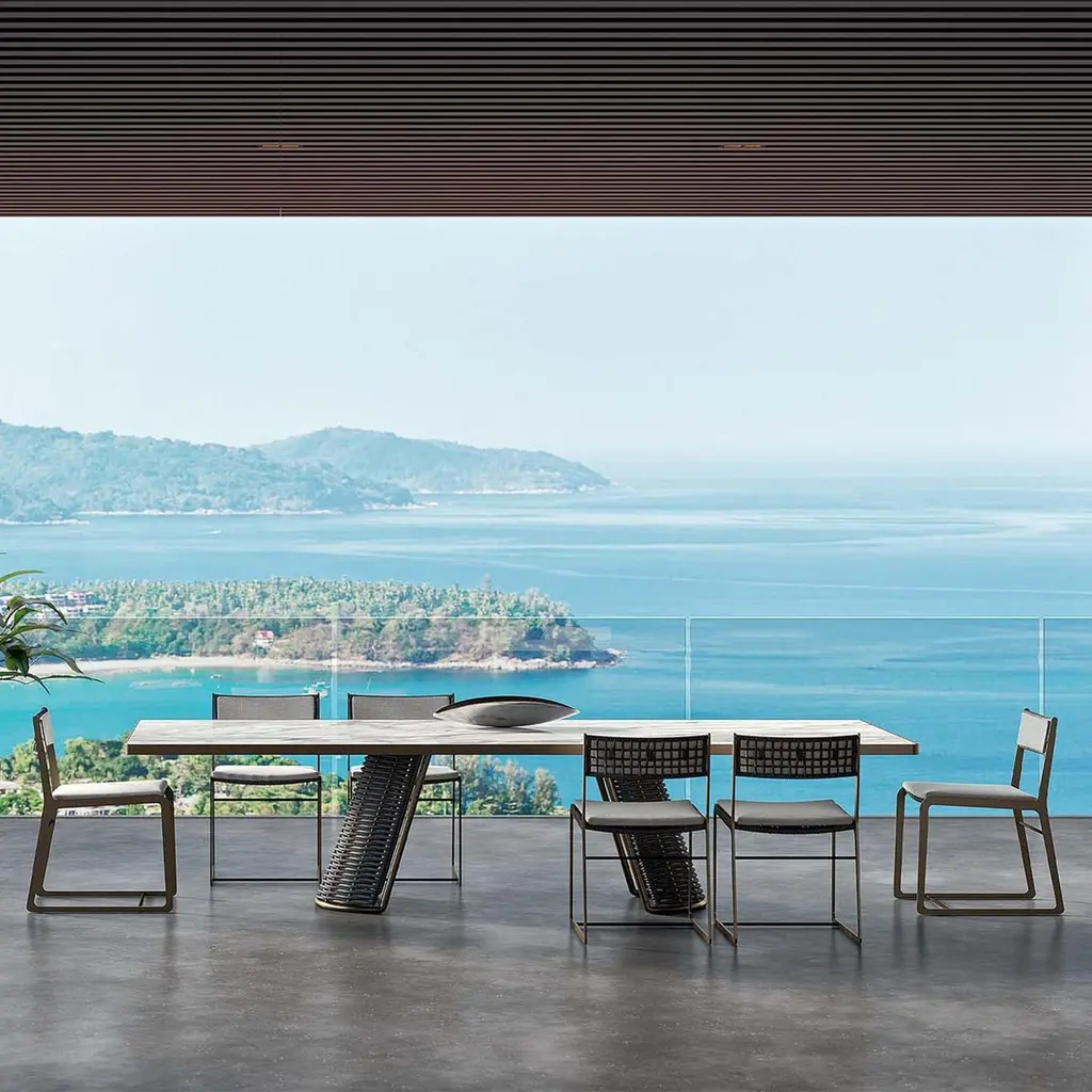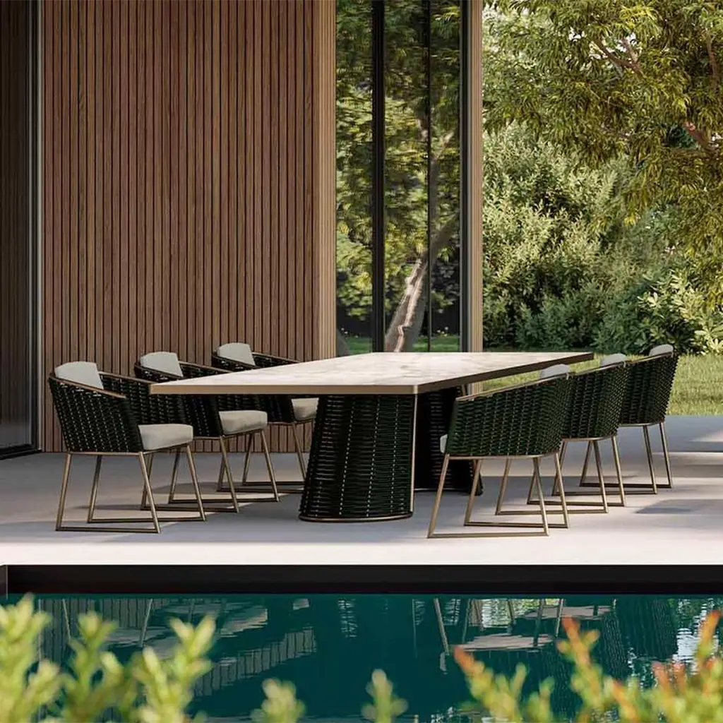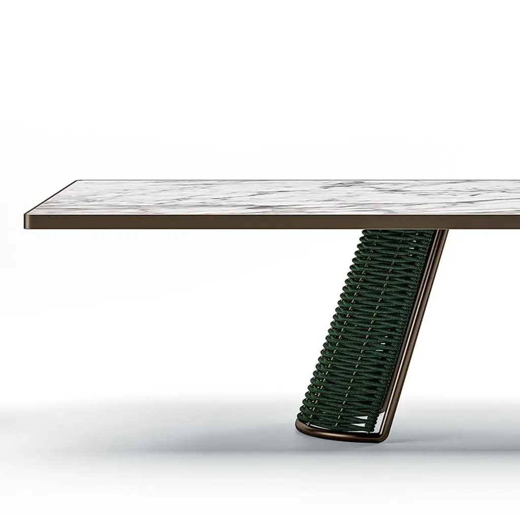 Dining table dawn outdoor with ceramic top in calacatta marble finish with frame structure in stainless steel outline profile in bronze finish. With 2 bases with stainless steel structure in bronze finish made with woven green rope.Also available on request in:Measures: L 230 x D 120 x H 75 cm, price: 17500,00€.We recommend you to purchase the protective cover to protect this table,on request, for the table in 300cm width, price 1300,00€.