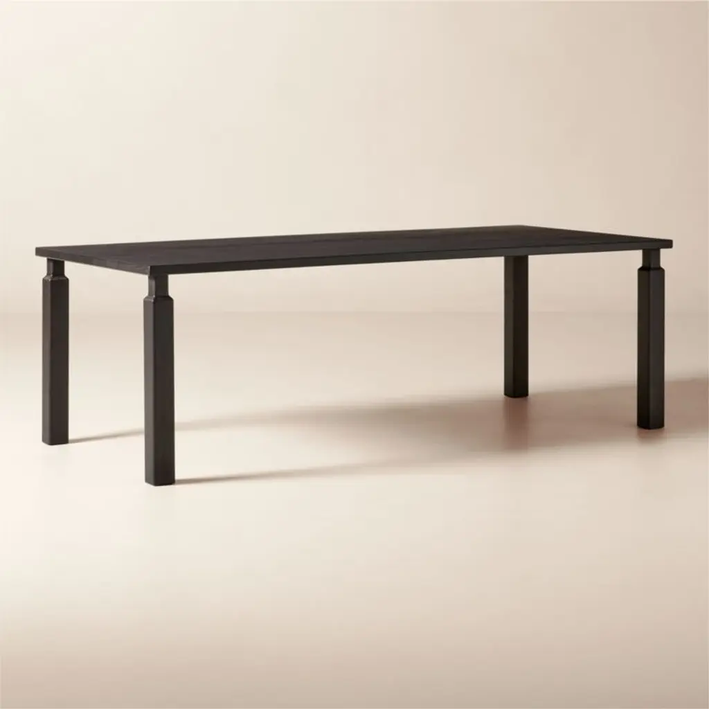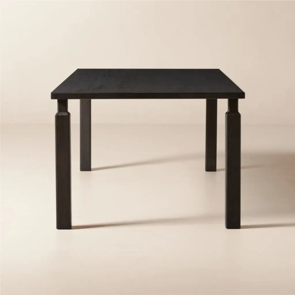 Dining table by AD100 designer Kara Mann marries classic form with modern details. Finished in ash wood certified sustainable by the Forest Stewardship Council (FSC), its matte dark brown stain is timeless. Clean lines continue with details such as mitered corners and legs that taper at the top. CB2 exclusive.