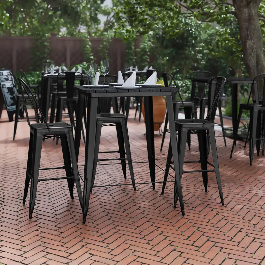 Instantly up your commercial or residential dining or lounge spaces with the upmarket look of this 31.5" square bar height dining table. The slatted poly resin top paired with a steel frame lends a contemporary yet rustic look to any decor from industrial to farmhouse. Create a cozy spot to have drinks or dinner for 4 in your restaurant or pub or take the fun outdoors to your patio dining areas. Designed to stand up to the rigors of the hospitality industry, as well as busy households, this commercial table boasts a polystyrene top that will not rot, chip or peel and a 20 gauge steel frame that will hold up to 300 lbs. static weight capacity. Stainless steel hardware is rust resistant making this patio table ideal for year round use both indoors and out. Assembly takes less than 10 minutes with the included tools and cleanup is a snap with a damp cloth for quick seating turnaround. Adjustable floor glides ensure a stable, level surface and protect your indoor flooring from damage. Pair this table with other sizes or shapes in our collection for a cohesive look throughout your home or business.
