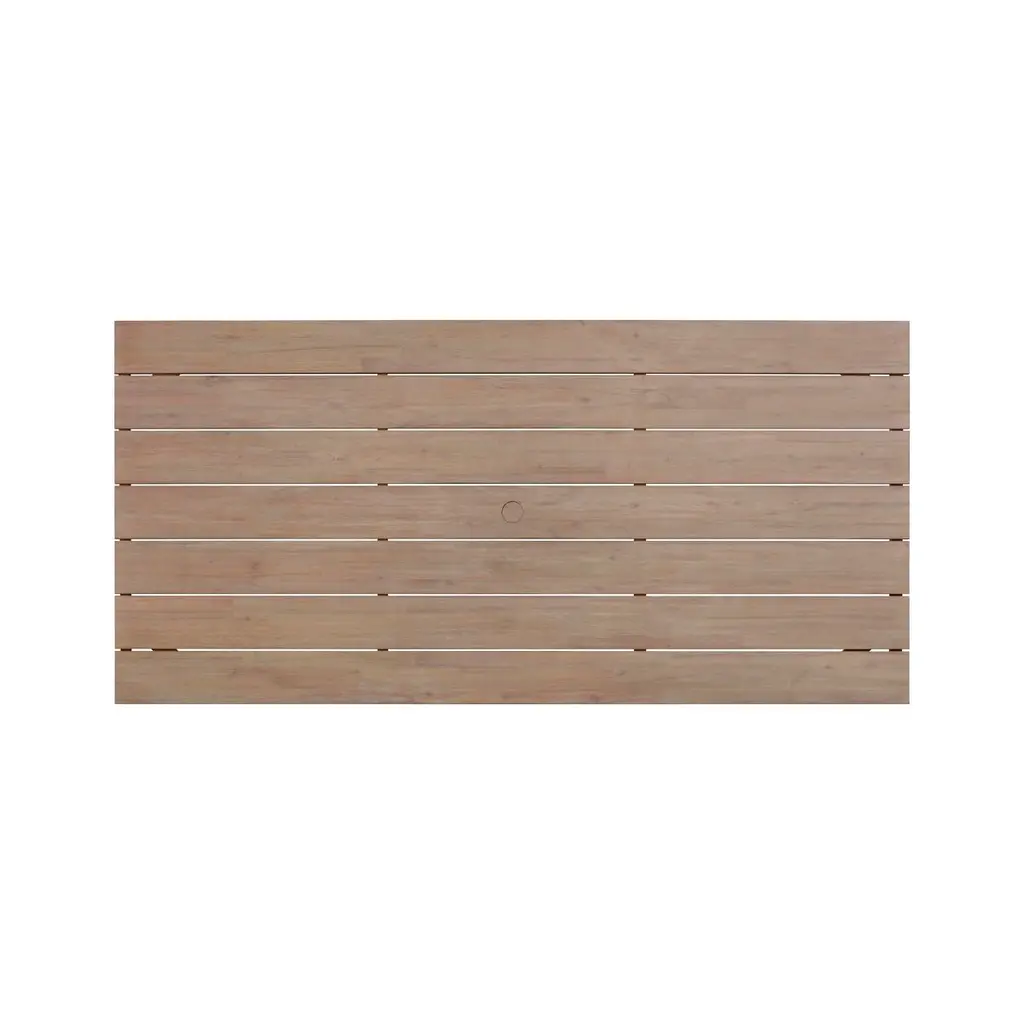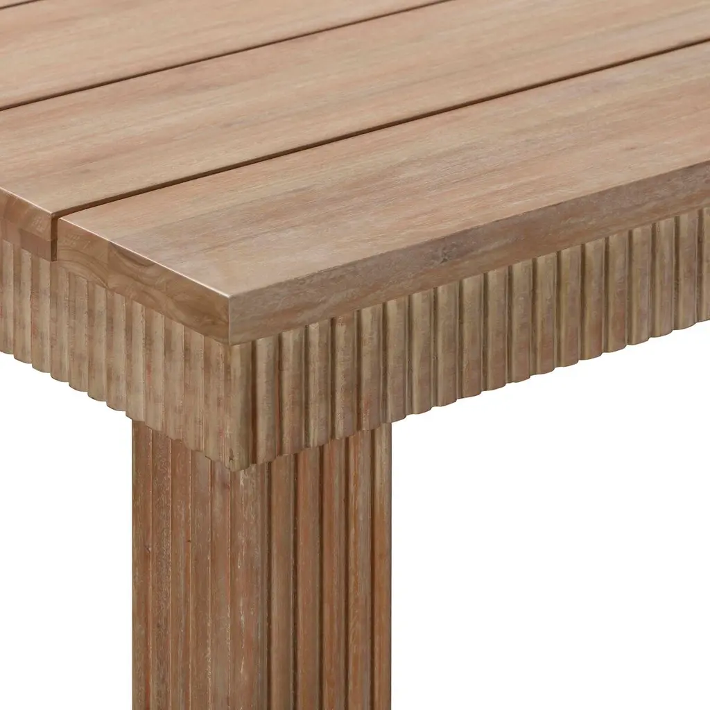 Transform your backyard into an oasis with the outdoor collection. Crafted from sand-blasted, washed Eucalyptus wood, this collection is built to withstand the rigors of the outdoors. Experience durability and style with outdoor-grade materials and waterfall-fluted detail. The slatted construction ensures efficient water drainage and a built-in umbrella standhole adds practicality to your outdoor setting. Combine with the Outdoor Dining Chairs to complete the look.