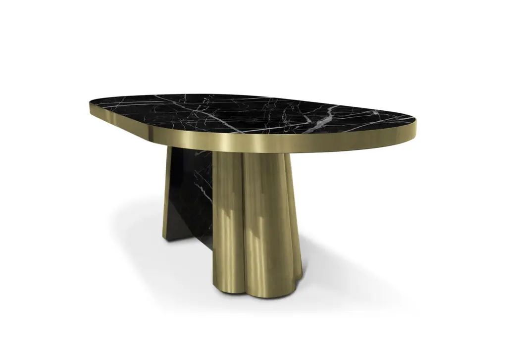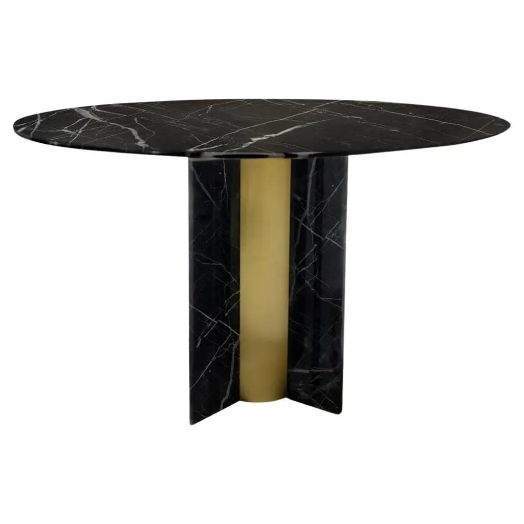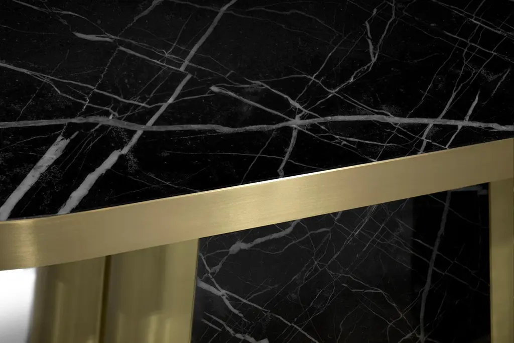 Coupled with a stunning satin brass base, the striking, marble top conveys a sense of bold elegance to any dining area. Dine lavishly in the presence of Decodiva.Materials & Finishes: Base: Nero Marquina MarbleTop: Nero Marquina MarbleDetails: Satin BrassClean & Care: Never use cleaners with alcohols or solvents on metals. Only used fine cotton or extra soft cloths. We recommend that tarnished metals be professionally cleaned. Use a clean soft cloth in marble parts. Too much cleaner or soap may leave a film and cause streaks. Do not use products that contain lemon, vinegar, or other acids on marble or limestone. Rinse the surface thoroughly after washing with the soap solution and dry with a soft cloth.