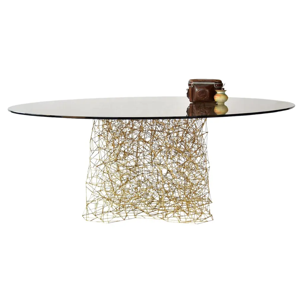 Completely customizable, this round dining table from Bau Design is a true work of art to display in a wide open space. On an iron vase with an aged gold leaf finish, the table is topped with a wood surface, coated with polyester varnish. Choose both the base and surface colors as well as the shape of the base.