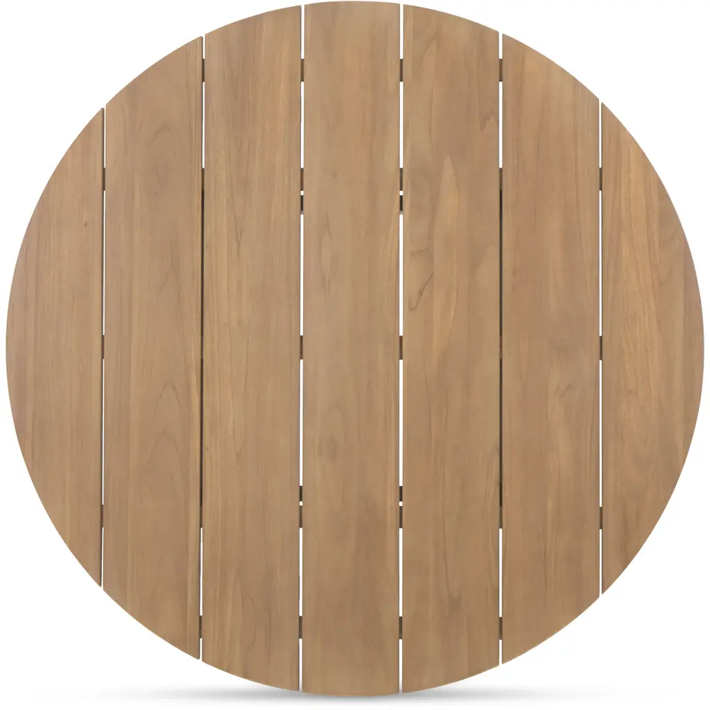 Embodying contemporary sophistication, this solid teak table celebrates natural material. The Delta outdoor dining table's angular legs provide a striking contrast to the round, curved top, creating a minimalist yet elegant aesthetic. Over time, the table embraces a unique silver-grey patina as the teak and oils naturally weather. Though the process lends to its character, a teak sealer can be applied to maintain its original allure.