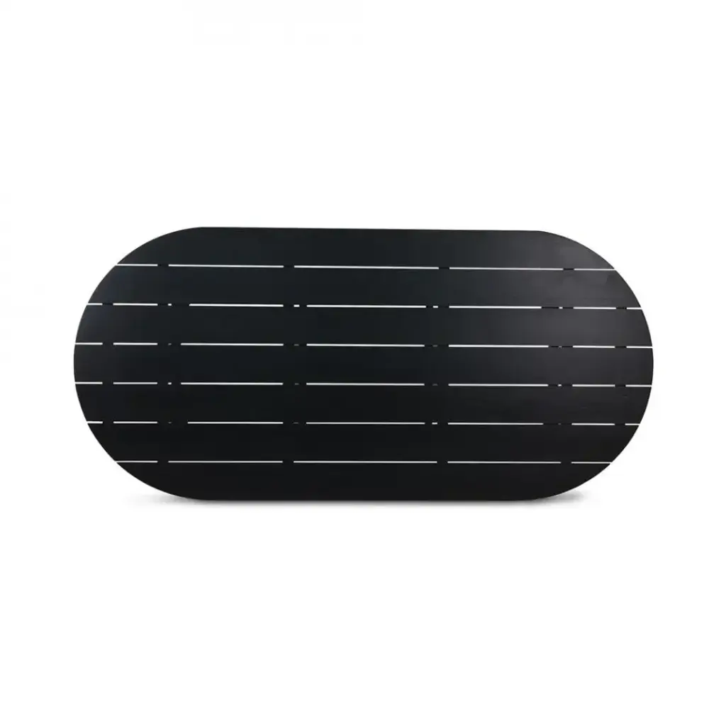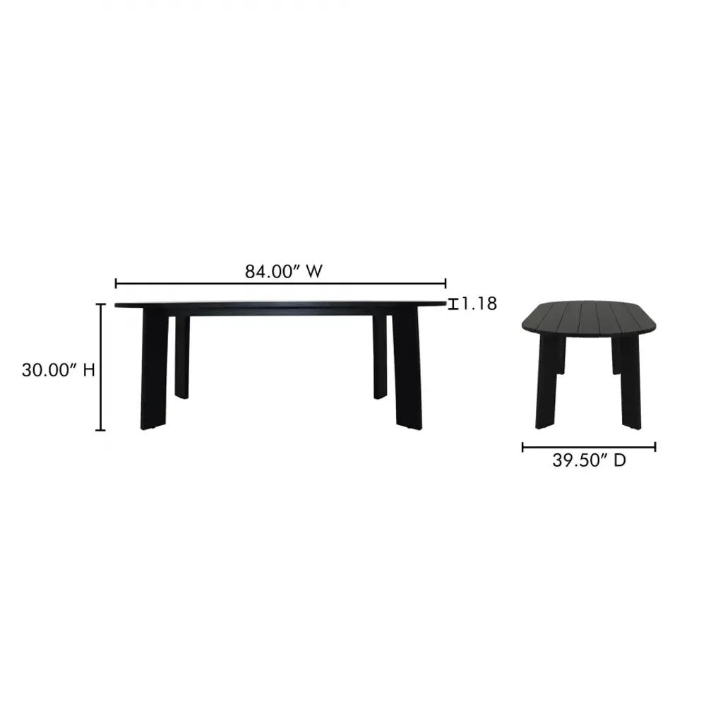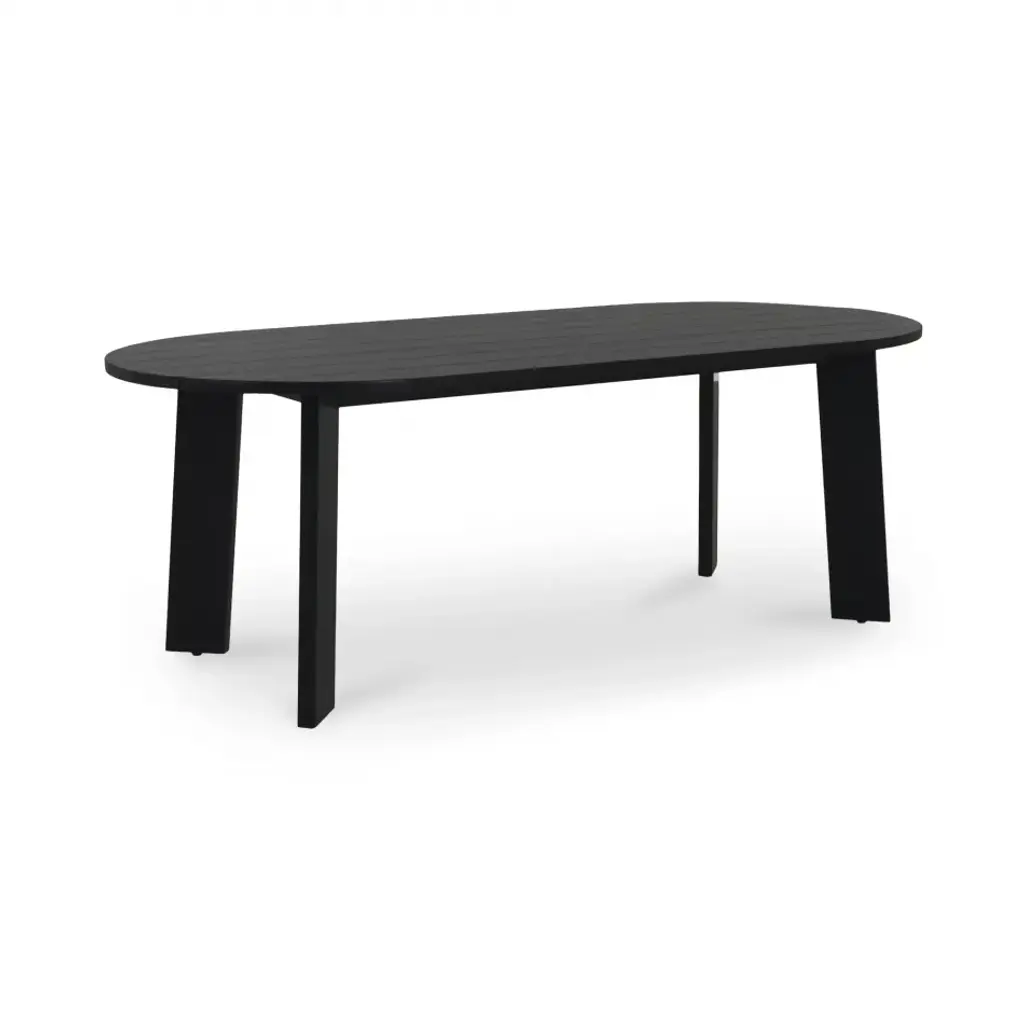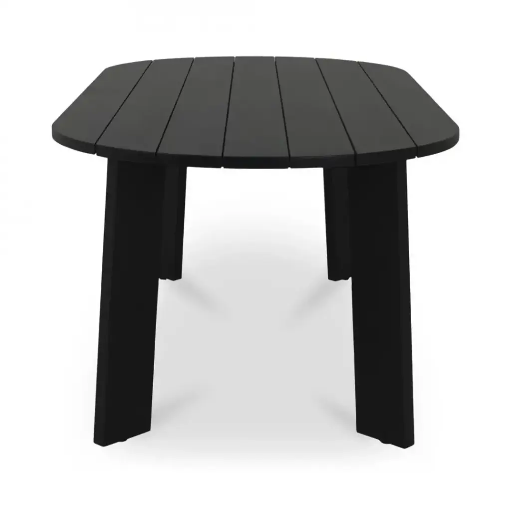 Embodying contemporary sophistication, this solid teak table celebrates natural material. The Delta outdoor dining table's angular legs provide a striking contrast to the oval, curved top, creating a minimalist yet elegant aesthetic. Over time, the table embraces a unique silver-grey patina as the teak and oils naturally weather. Though the process lends to its character, a teak sealer can be applied to maintain its original allure.