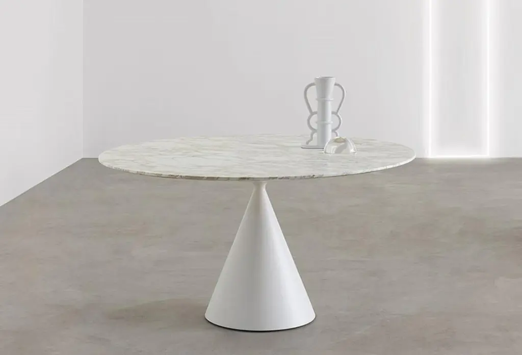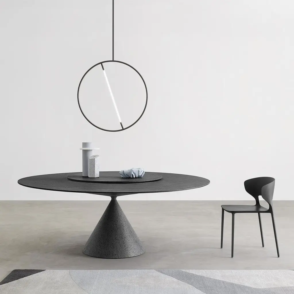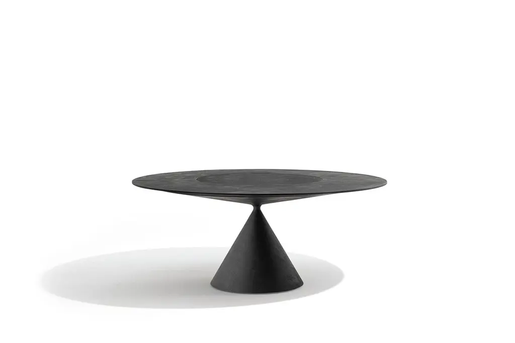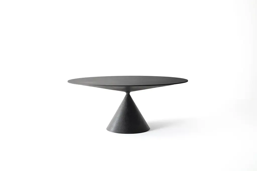 A table capable of expressing the perfect synthesis between sculpture and proportions, design harmony and high-level craftsmanship. Clay is a table with pure aesthetics, capable of communicating personality wherever you decide to place it: in a dining room, living space or more. The top and the base are grafted onto each other with a daring game of balance thanks to a section reduced to a minimum. The special lava stone cladding amazes and fascinates with its dark shades, rich in porosity that make the entire structure more lively and distinctive.Also available in oval version in dimensions: 110x160 cm, 120x180 cm, 120x200 cm, 120x218 cmAvailablein different options:Matt lacquered base:• B13 sabbia• B22 bungee brown• B34 light grey• B42 grafite• B62 white• B82 greyGlossy lacquered base:• F50 whiteBase in "Marble" finishes:• D62 court greyBase in "Concrete" finishes:• D55 blue reale concrete• D56 ardesia concrete• D57 ochre concrete• D58 ghiaccio concrete• D59 cacao concrete• D60 red mattone concrete• D61 white concrete• D65 grey luna concrete• D66 black concreteBase in "Stone" finishes:• D64 tufo stone• D67 lava stoneTop P1:• D85 cemento ceramic • D86 asfalto ceramic• D87 lava ceramic • D93 Sahara ceramic• D94 industrial white ceramic• D95 industrial grey ceramicTop P2:• D84 white calce ceramic• D90 glossy white statuario ceramic• D92 glossy black marquina ceramicVersion: Round, OvalDIMENSIONS:Ø 120 cmØ 140 cmTable height: 73,5 cm.Price refers to the Ø 120 cm Round version in B62 white base and • D84 white calce ceramic top.