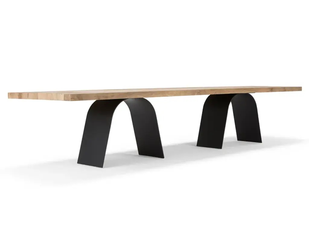 Table made in multiply with a 1 cm. veneer of antique reclaimed oak, aged between 80 and 350 years, left in a raw state, ancient, where veins, cracks, knots and imperfections become the specific and characterizing feature of this table. At a first glance, the table conveys values such as: tradition, craftsmanship and authenticity, words which are in keeping with Amura brand.The top is divided in two parts, and supported by one or more bases, depending on the size. The varnished metal bases hark back to the “A” for Amura, clearly recognizable in the logo, and further to the curves of the traditional cobblestones street of the South of Italy. This table is a daring furniture element, with a unique scenic effect. Its particular design makes it perfect either for rustic, modern or ultra-contemporary ambient. The absolute protagonist of the kitchen or the dining room. TOP: Antique oakBASE: Metal
