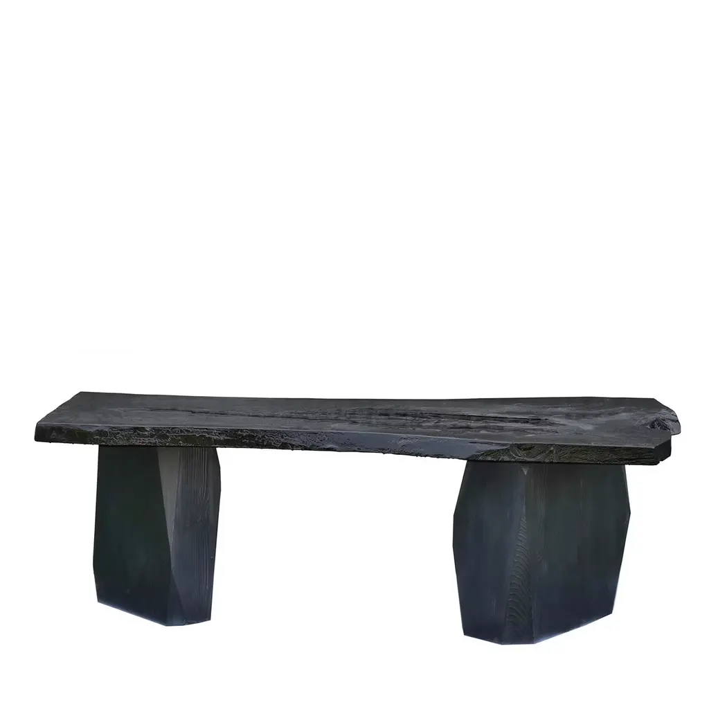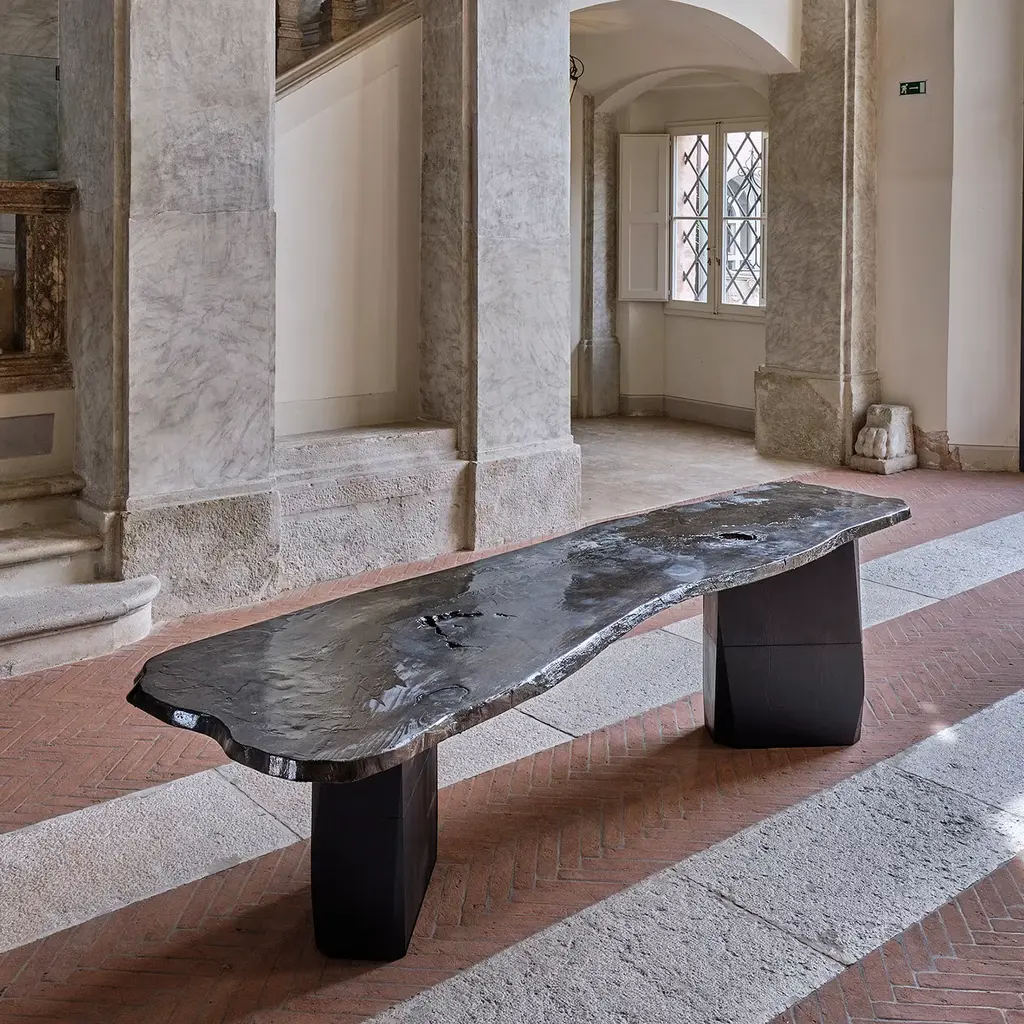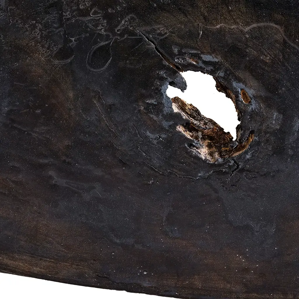 Inspired by dolmens, this table in elm wood with fir wood legs, evokes the timeless presence of ancient stone tables, with oversized legs and a weathered top with natural veins and imperfections that recalls an archaeological artifact. The hand-sculpted legs and multi-layered color and resin finish create a unique rock-like texture, highlighting the beauty of aging and wear. This piece blends prehistory with contemporary craftsmanship. The raw materials used may exhibit natural variations that should not be considered flaws.