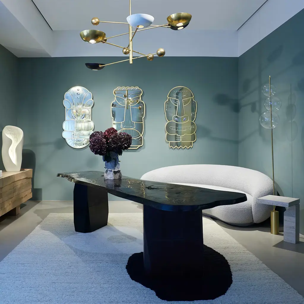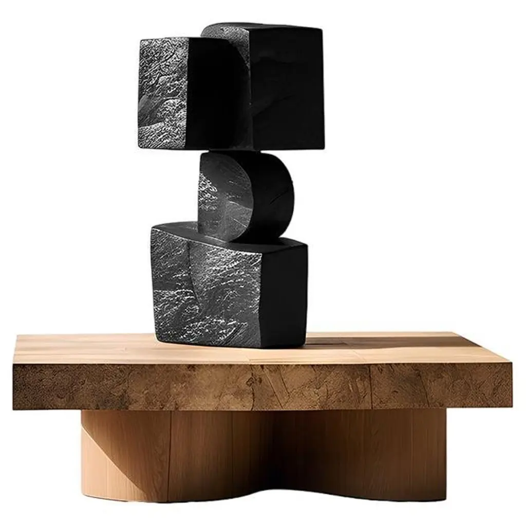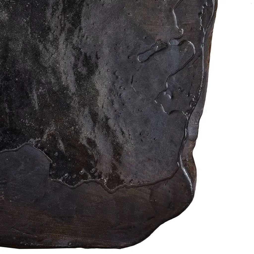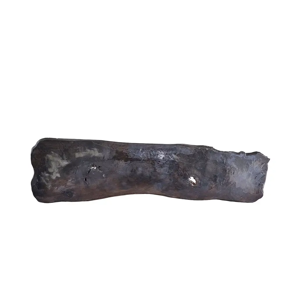 Inspired by dolmens, this table in elm wood with fir wood legs, evokes the timeless presence of ancient stone tables, with oversized legs and a weathered top with natural veins and imperfections that recalls an archaeological artifact. The hand-sculpted legs and multi-layered color and resin finish create a unique rock-like texture, highlighting the beauty of aging and wear. This piece blends prehistory with contemporary craftsmanship. The raw materials used may exhibit natural variations that should not be considered flaws.