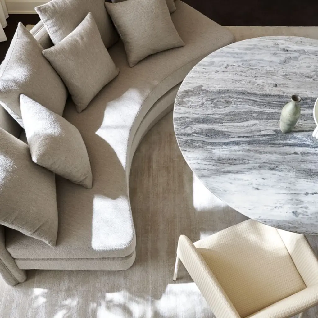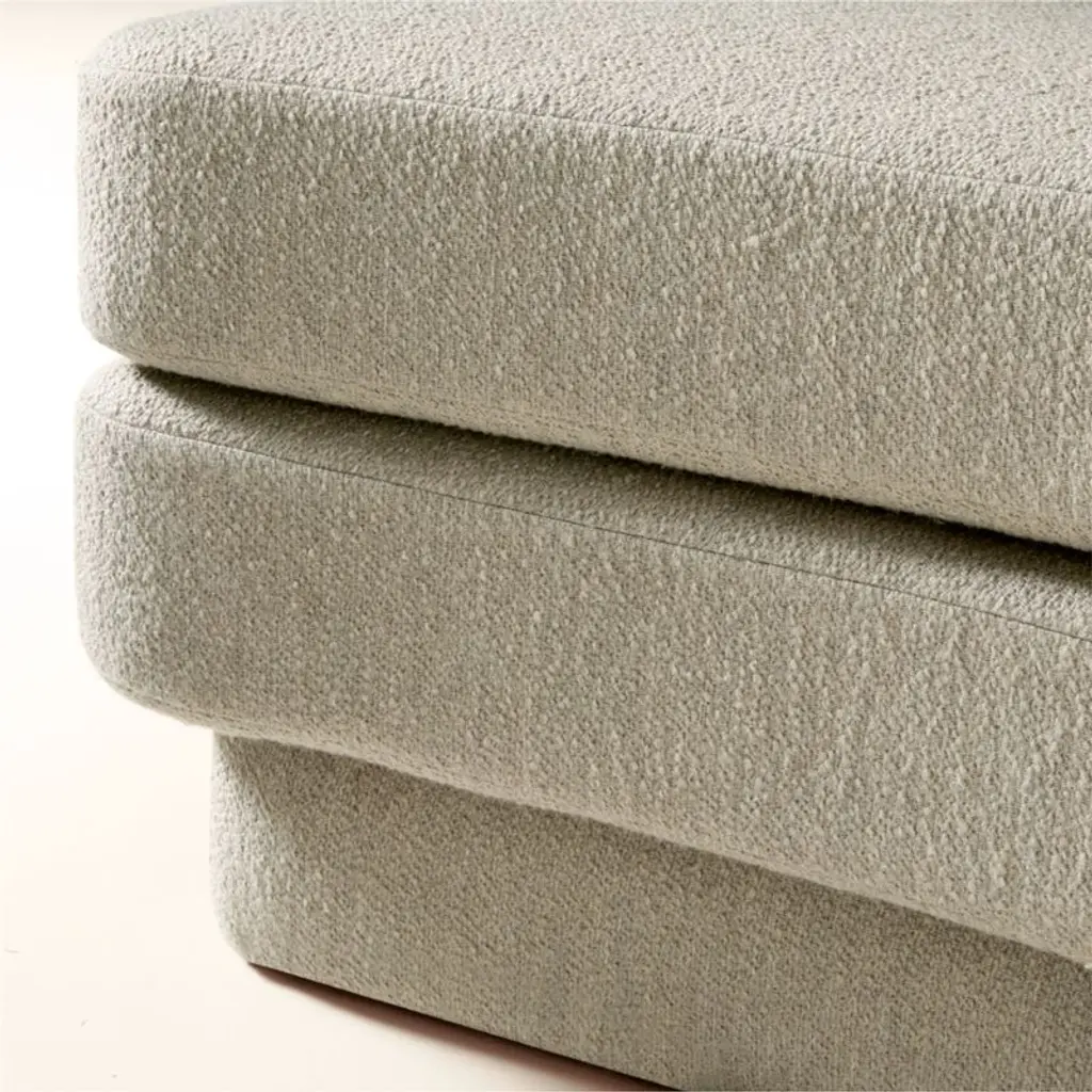 Designed for relaxed gatherings and everyday elegance, curved dining banquette by Studio ANANSI offers generous seating for four. Upholstered in a textured grey boucle, banquette balances sculptural form with inviting comfort. A thick bench-style seat cushion sits atop a fully upholstered plinth base, giving the appearance of a double-stacked silhouette for added visual weight. Finished with four oversized pillows and three smaller accent cushions, banquette pairs effortlessly with a round dining table. CB2 exclusive.