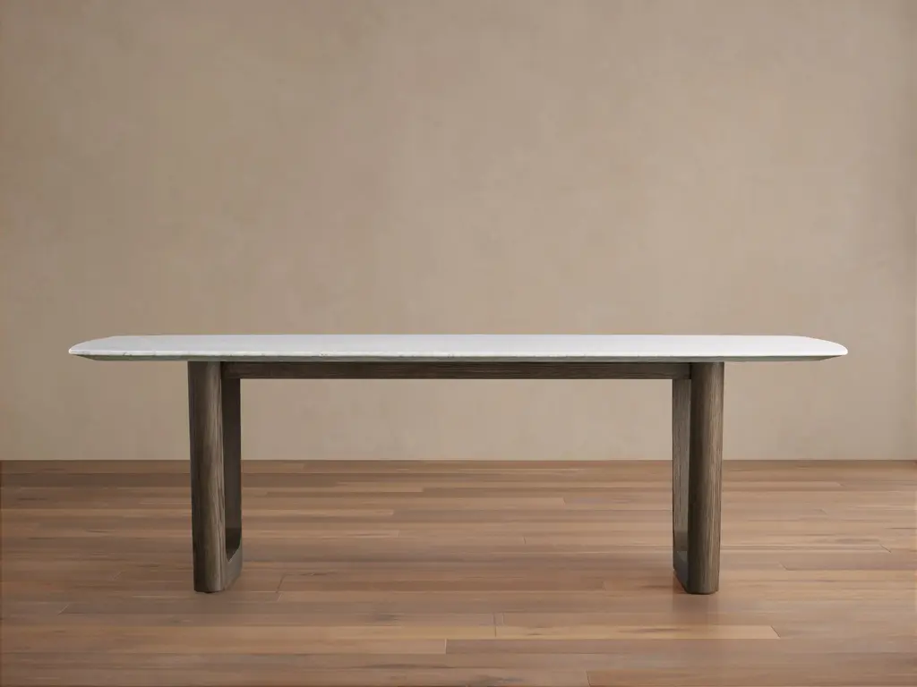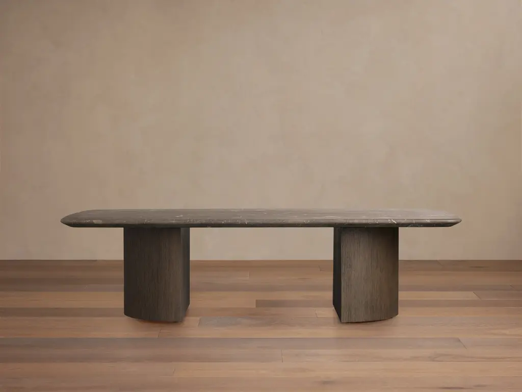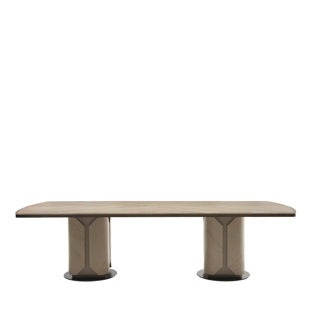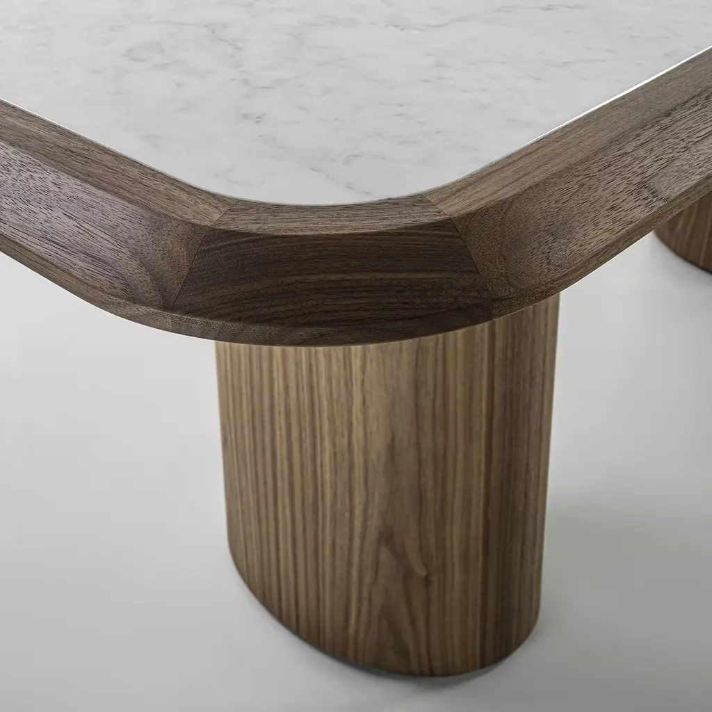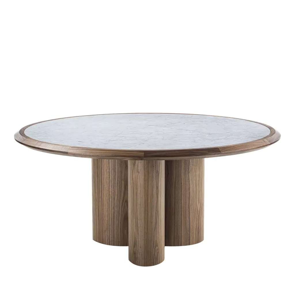 Sophisticated details refusing sharp angularities perfect the already harmonious silhouette of this dining table, crafted of prized Canaletto walnut. Sustained by a couple of column-like legs, the stunning Carrara marble top is set in a refined frame with beveled edges also tracing the contours of rounded corners for a truly welcoming feel.