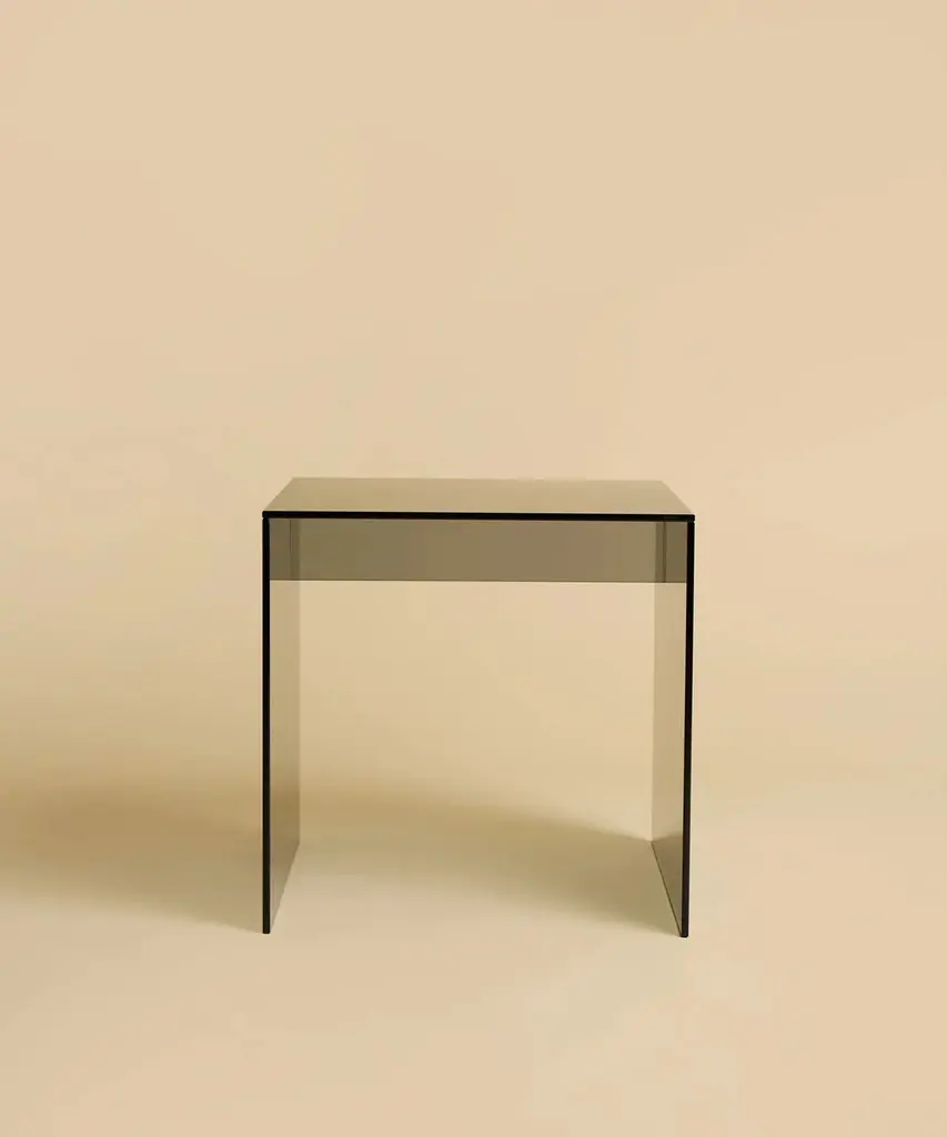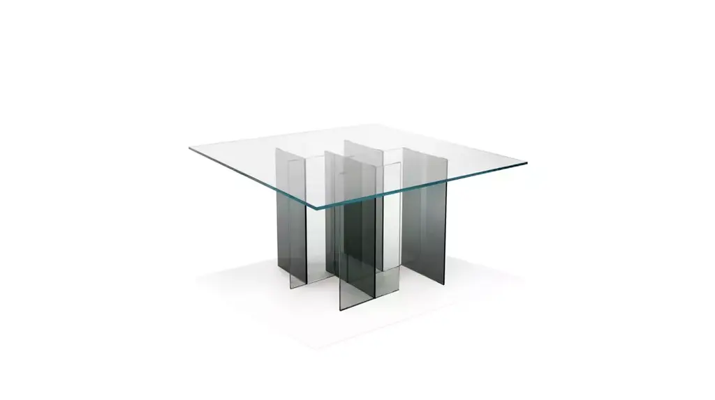 Diapo is an all-glass table designed by Rene Bouchara. The base, which is perfectly visible under the extra-clear top, is created by gluing multiple pieces of glass together to resemble an abstract sculpture. Different combinations of colours, reflections and transparencies are available.
