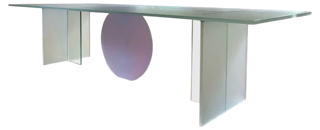 Diapo is an all-glass table designed by Rene Bouchara. The base, which is perfectly visible under the extra-clear top, is created by gluing multiple pieces of glass together to resemble an abstract sculpture. Different combinations of colours, reflections and transparencies are available.