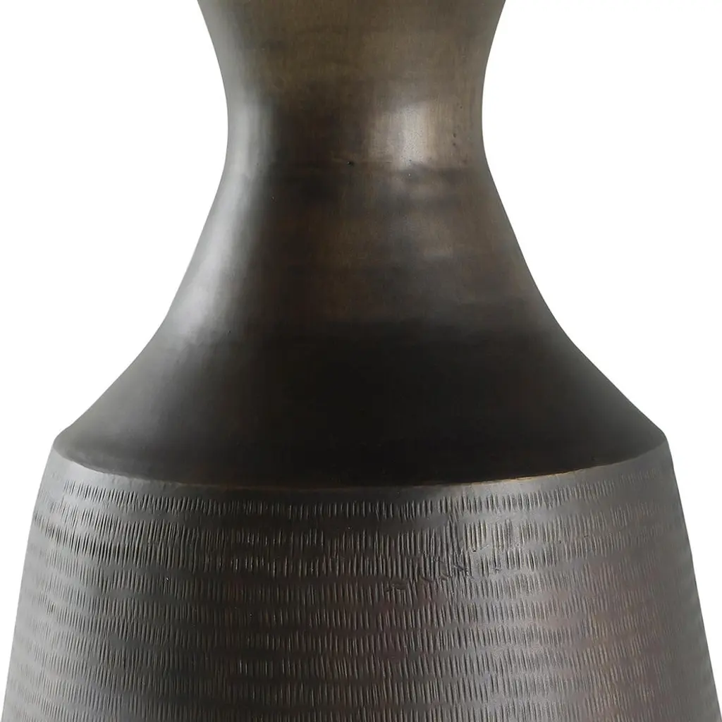 Anchor your dining room design with our Dinalyn Industrial Loft Bronze Pedestal Round Teak Dining Table. Featuring a hand hammered, bronze pedestal base, this teak and brass dining table is perfect for any industrial loft style home.