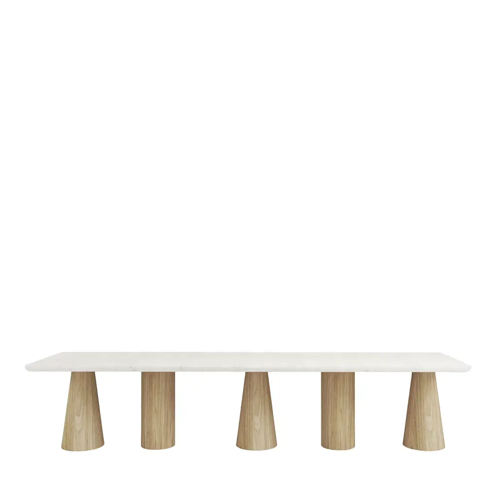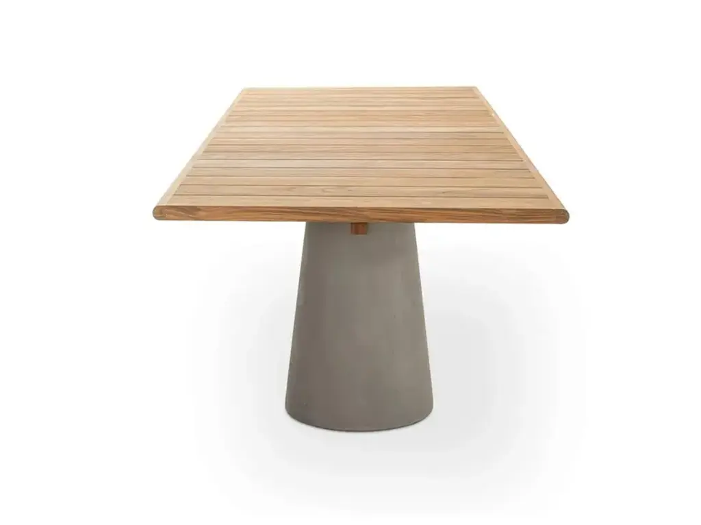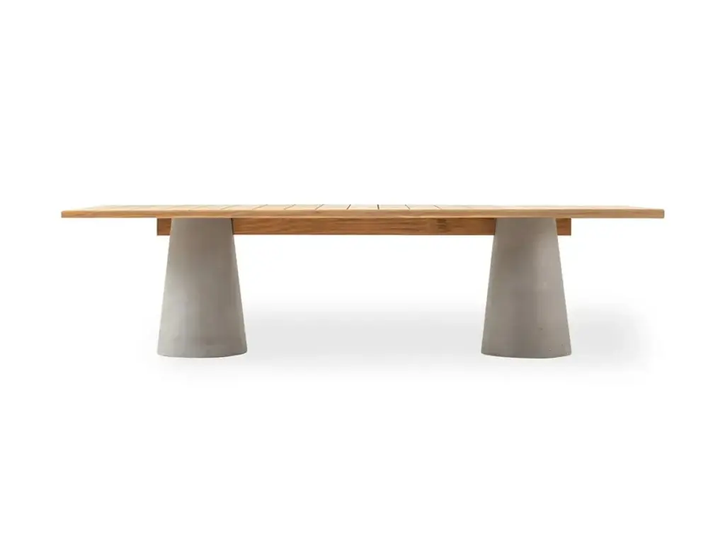Dine Out expands with a new table that embraces the contemporary concept of informal dining, increasingly popular and widespread in the outdoor world. Dine Out can be paired with the small armchairs and poufs from the same collection, the sculptural silhouette of the table is punctuated by the overlapping of the round tabletop on the conical concrete base.MaterialsConical base in natural concrete, yellow/white or green/white terrazzo;Top in natural teak.