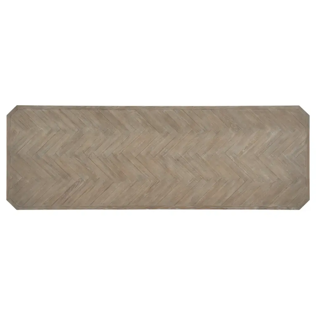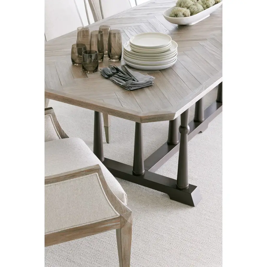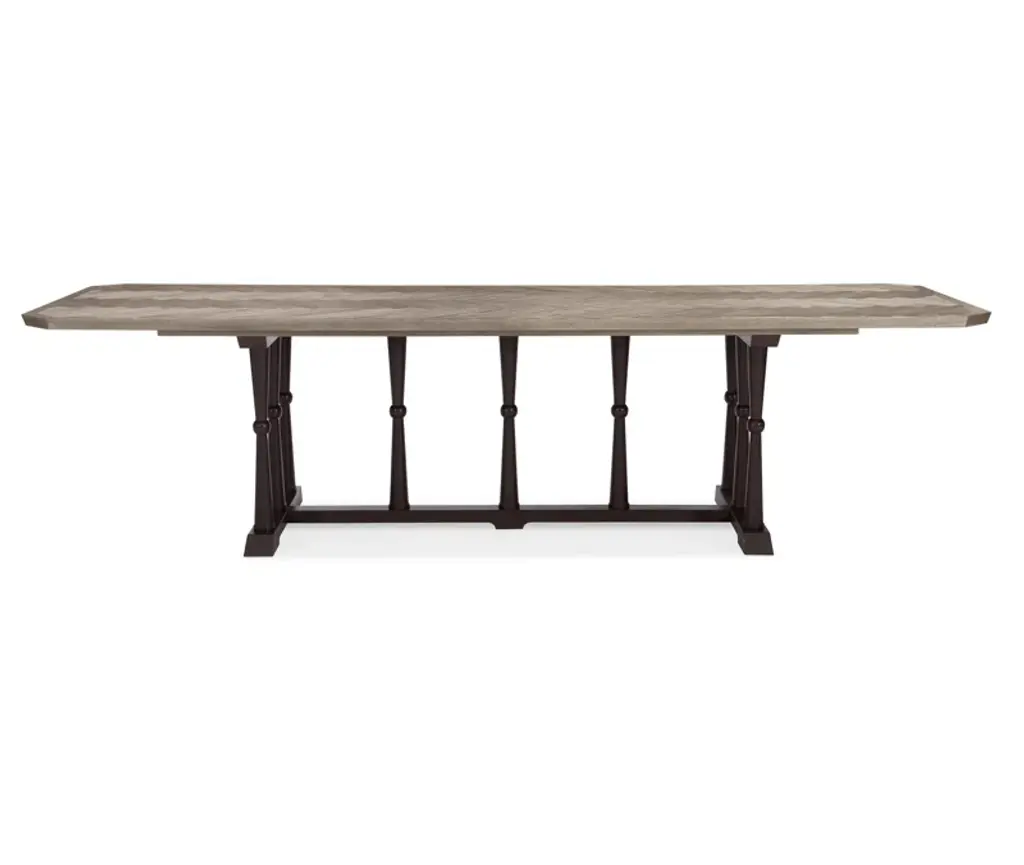 For large dining parties, this Charcoal Anegre table is unmatched. The delicately figured wood, in a bowed rectangular shape, has graceful chamfered corners detailed with outstretched, whisper of gold metal caps. The entire apron is rimmed in a thin whisper of gold bead as it sits on modern cabriole legs tipped in custom gold ferrules. For dining at its best, this piece is all trimmed out.
