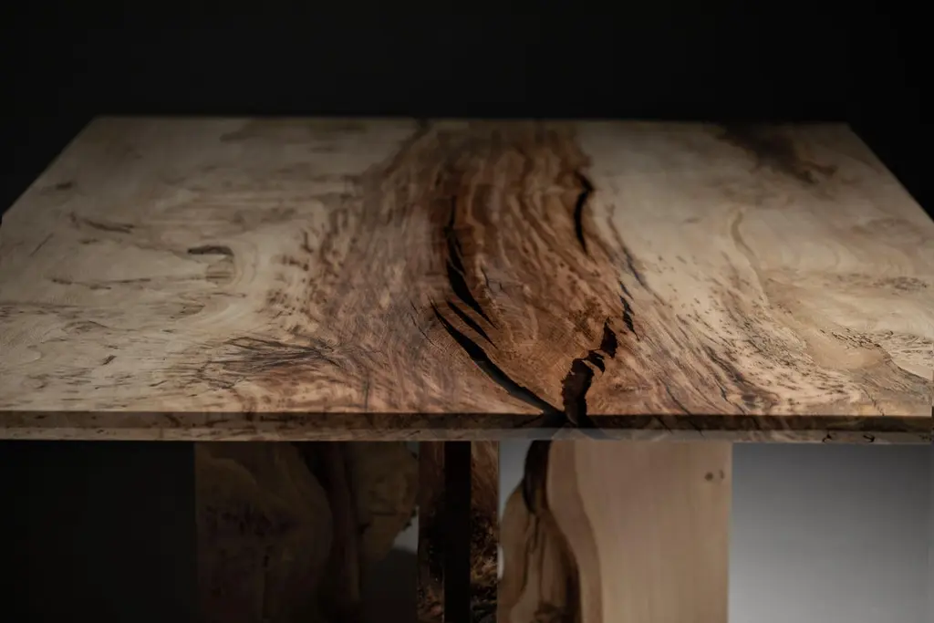 The dining table of solid English oak is made from two slabs of book-matched part brown oak joined in the centre.The drying splits are a feature with clear ebony-tinted resin infill.The central leg pedestal arrangement allows for seating in any position around the table.This table can be made to a bespoke size and in different timbers.For delivery, the table top and legs arrive in separate crates with an instruction video emailed to guide the very simple assembly.