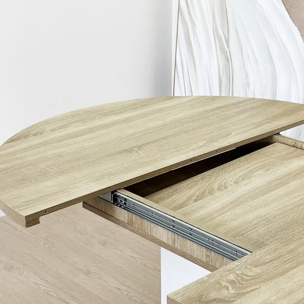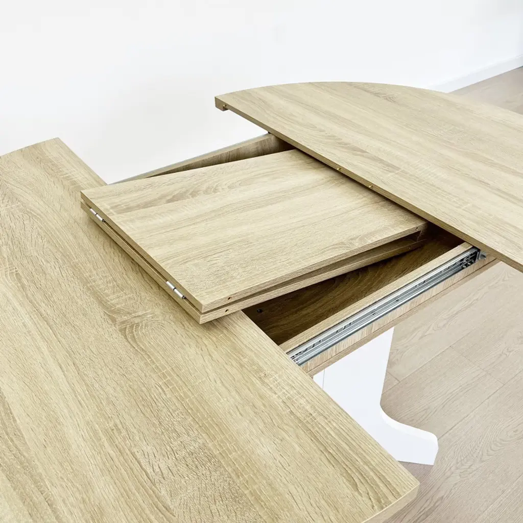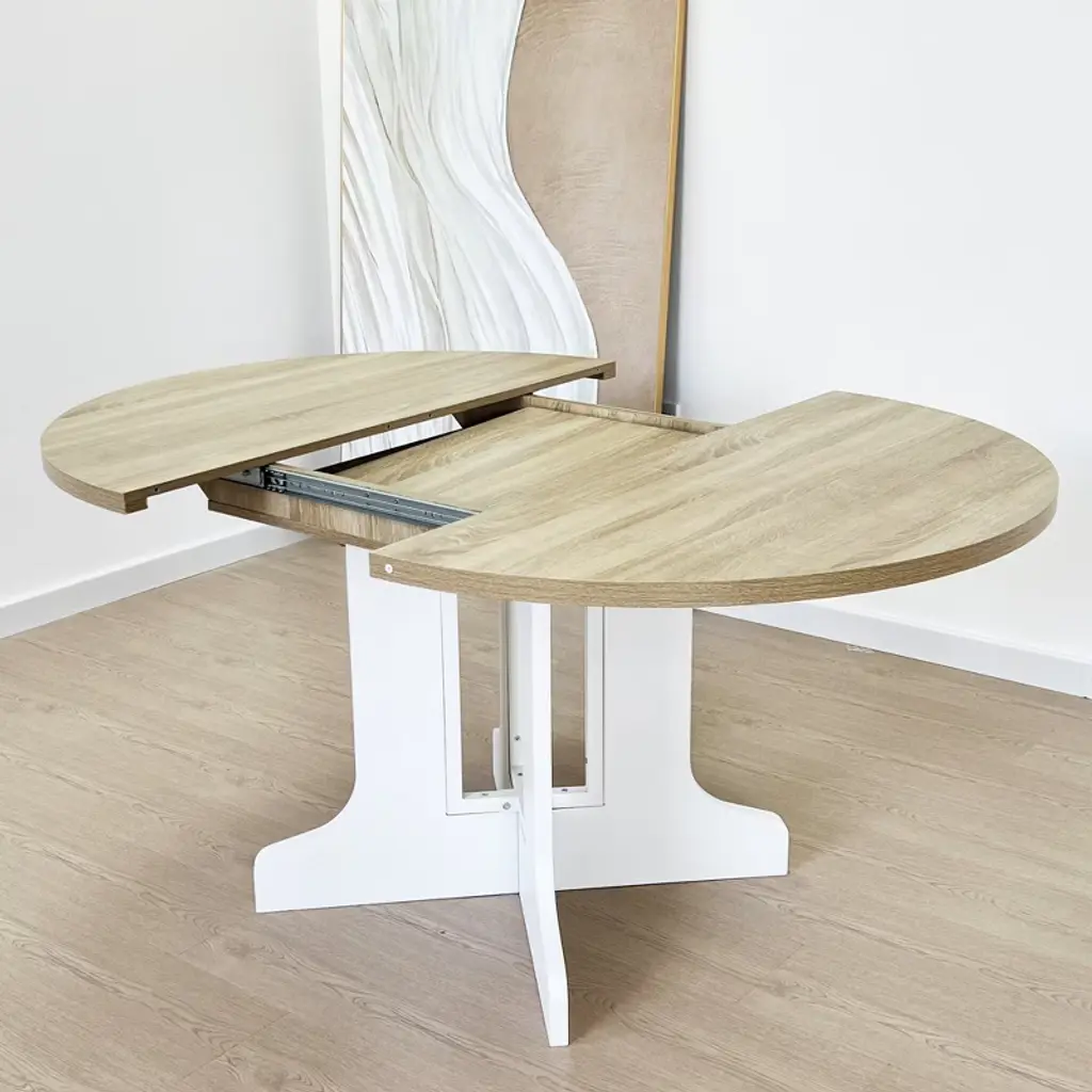 Elegant round dining table: With a round tabletop and X-shaped base, this table represents an elegant and temperament atmosphere. Moreover, the adjustable dining table length makes this dining set suitable for any size room. Stable & Solid Structure: This dining table set is expertly crafted of MDF and rubber wood. The tabletop is finished with oak wood veneers. The use of veneers results in high-quality furniture that has flawless surfaces and consistent color tones that will not be subject to cracking. Adjustable dining table length: Taking into account the use of different scenarios, the table adopts a flexible design and the length can be adjusted. The round table's planked top is eased along the edges, then insert a leaf, and it can extend to accommodate additional guests. Table expands from 43''to 59'', seats up to 6. Exquisite Craftsmanship: The dining table with an X-shaped base and keyed-through tenons, and small wooden blocks on the tabletop edge make this dining table more stable and durable. The graceful natural wood texture on the tabletop is suitable for a farmhouse or modern-style dining room. Install Instructions & Weight Capacity: Full assembly required. Install instruction manual will be shipped with the products, and users can install all the parts of this dining table without any errors as long as they follow the logical and clear instructions. The installation process would be more smooth if users prepare the drill themselves. The load-bearing capacity of the tabletop is 300 lbs.