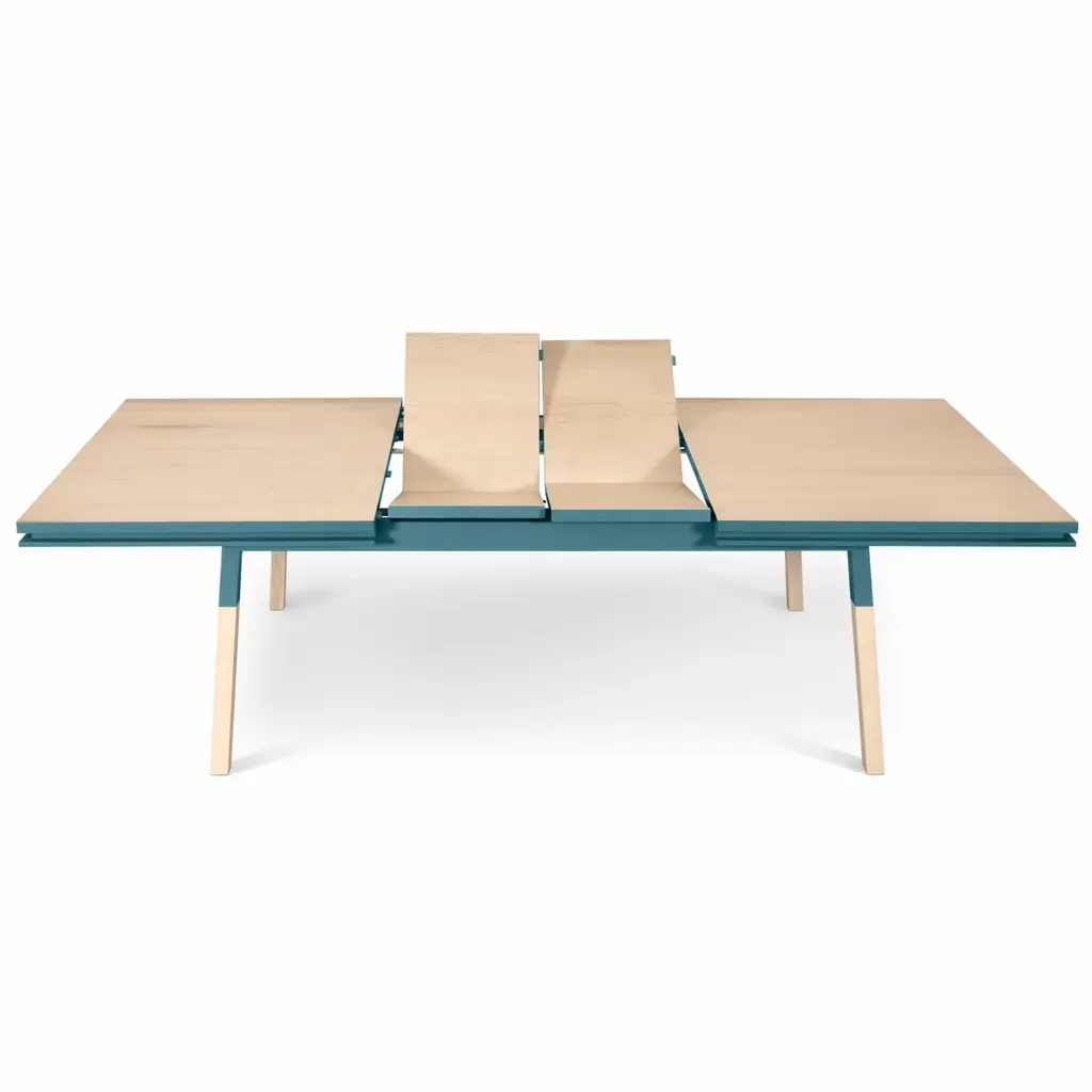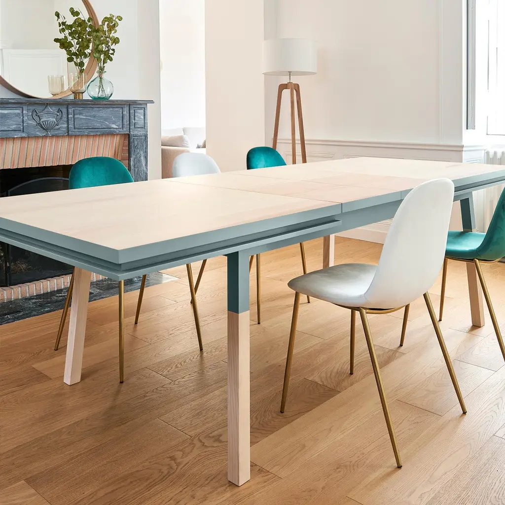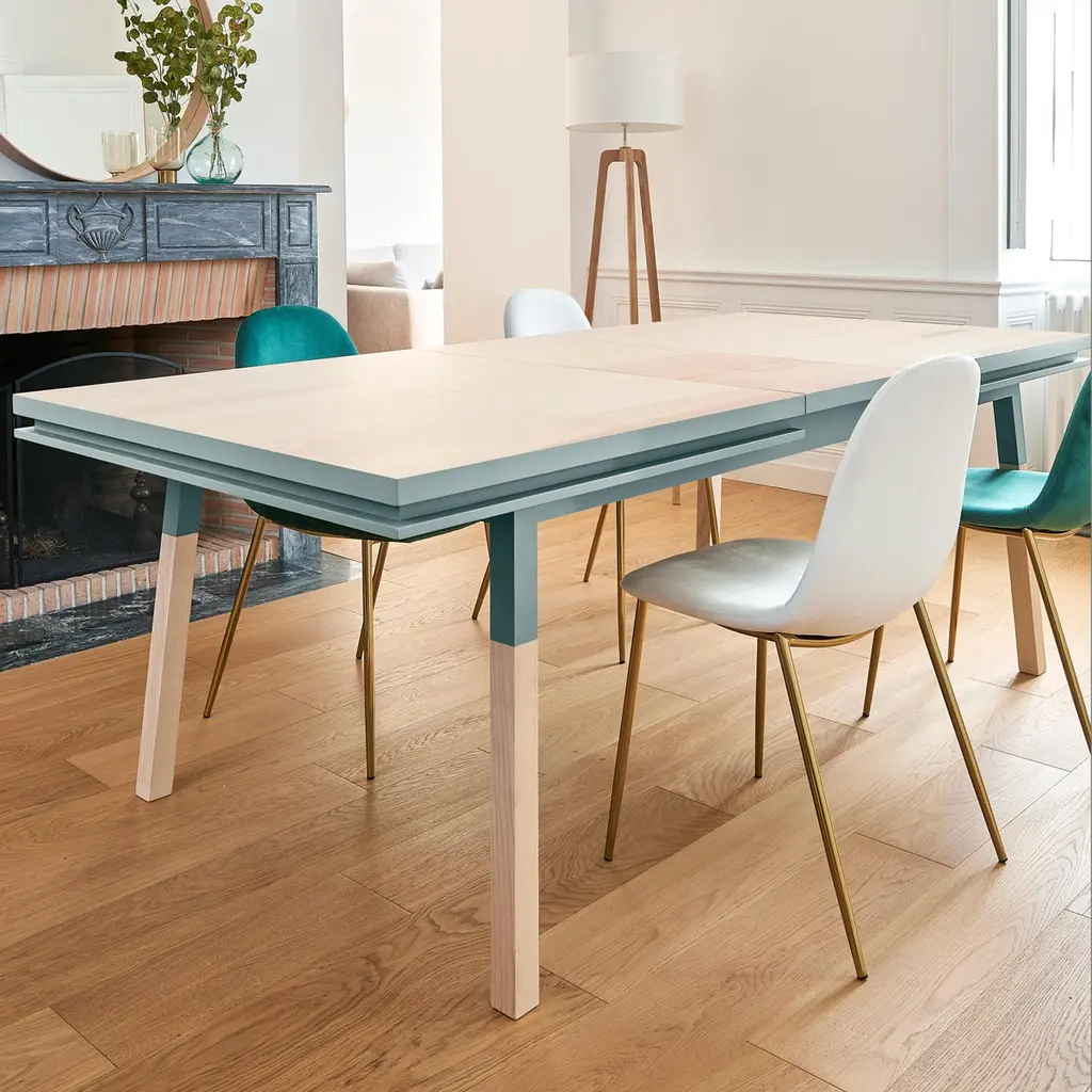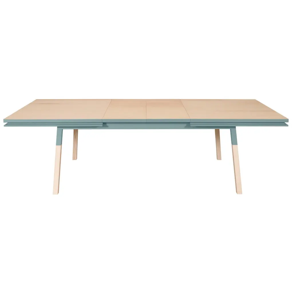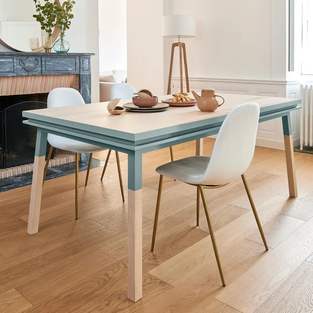 Rectangular dining table designed by Eric Gizard (Paris, France) 100% solid ash wood from French sustainably managed forests.Presented Length: closed 220 cm / 86 .6’’ , 1 unfolded extension 260 cm / 102.4'', 2 unfolded extensions 300 cm / 118.1'' Each extension is also in solid wood and 40 cm / 15.7'' widePresented width is 120 cm / 47.2’’Height 77 cm / 30.3’’Presented Colour is Bleu Briac / Hell BlueRelease of the Extensions is made from the middle of the top, by releasing the brakes under the belt and pulling one part of the tray aside. The other part is moving accordingly and synchroneously. Weight 40 to 90 kg depending on the size and number of extensionsThis piece of furniture is part of the ÉGÉE collection, that combines the sleek and refined codes of Scandinavian design with natural materials and "trendy" colorful lacquers in an unique « short pants » finish.The color displaid on the pictures is a muted blue grey.Mon Petit Meuble Français provides exclusively 100% Made in France Funiture.The manufacture and finishes are of very high quality, carried out by French craft workshops.