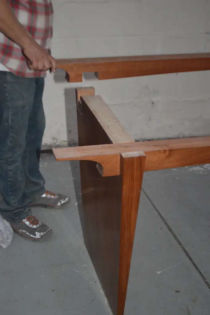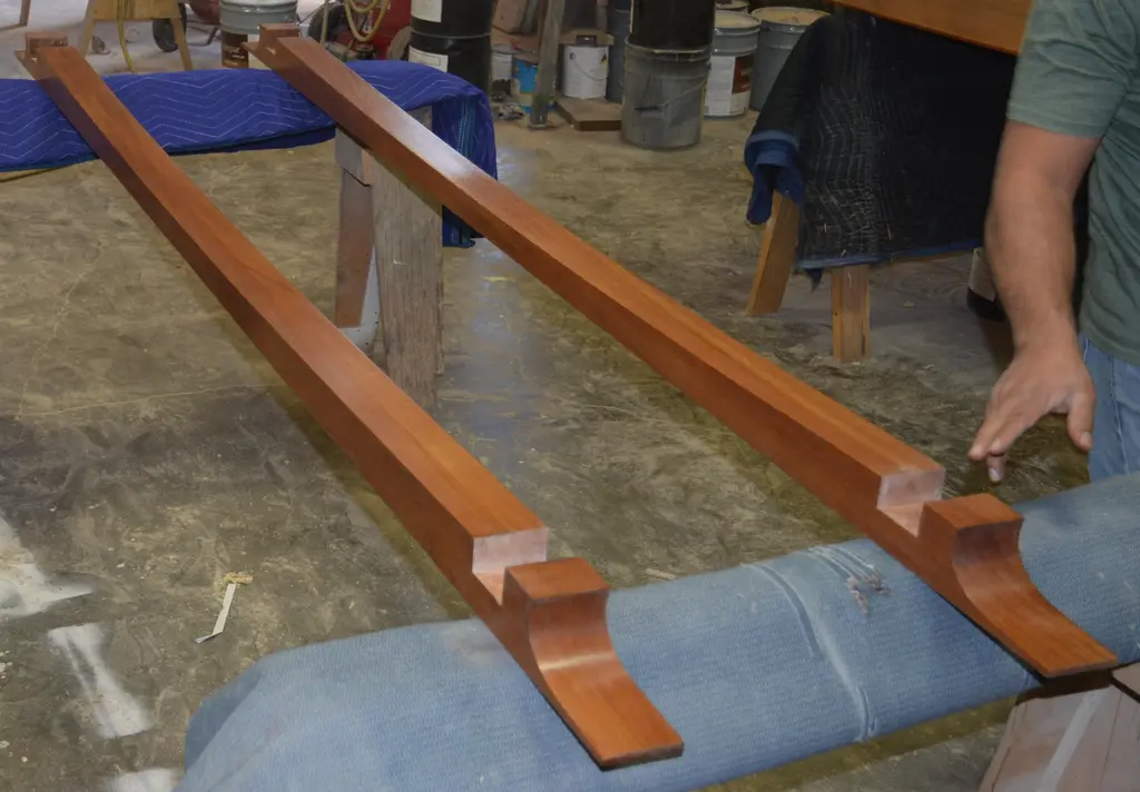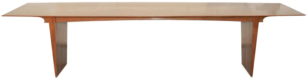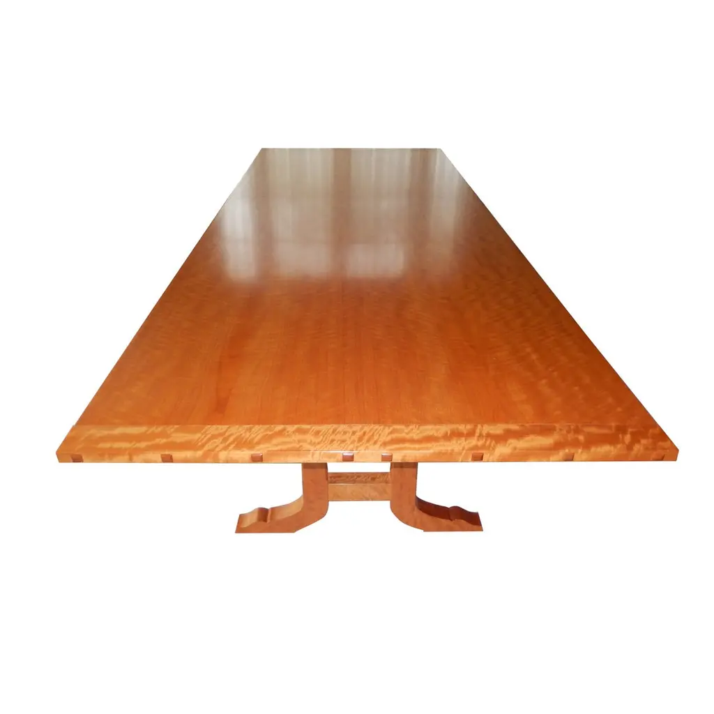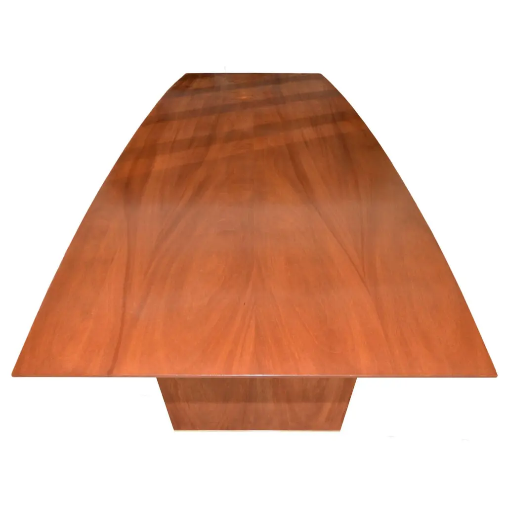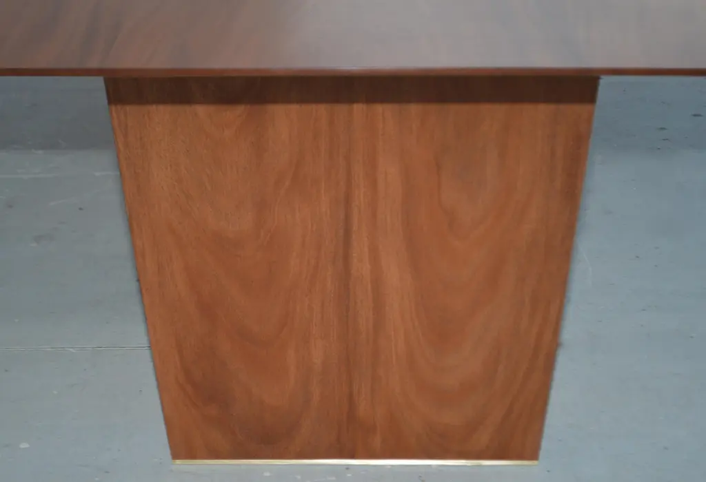This dining table is made from solid, book-matched African mahogany. Both the top and the legs are book-matched to create a perfectly symmetrical pattern in the wood grain. We designed this table in collaboration with Lauren Gurwich, and with a nod to Edward Wormley, our client, a devoted surfer who loves the ocean and wanted his passions reflected in the table. We mimicked the shape of a longboard and the curl of a wave to complete this exquisite beach-side dining room. We named this table the "Lewis Table" in honor of our gracious patron. This table is fully collapsible for easy transport and placement. The two horizontal 'apron' pieces slot into corresponding slots in the top of the legs to complete the base before the top slides into place. No tools, instructions, or effort required. We generally avoid the use of veneers and metal fasteners, particularly in close proximity to the ocean. The only metal we used is the marine grade brass in the feet. The table shown here is 126 in. x 42 in. x 30 in. H., The legs taper down to a 3/4 in. wide, 3/4 in. high brass footing. It is finished in a maintenance free, low sheen, lacquer.