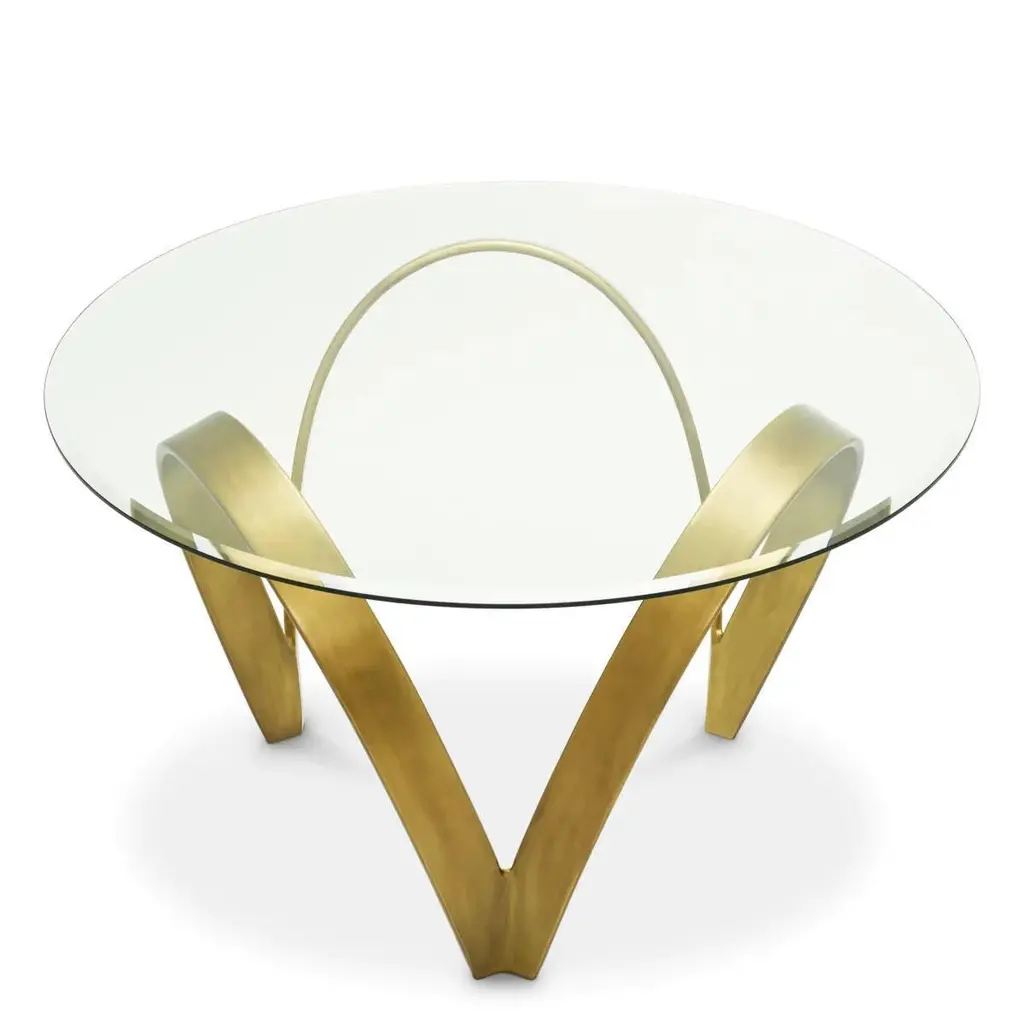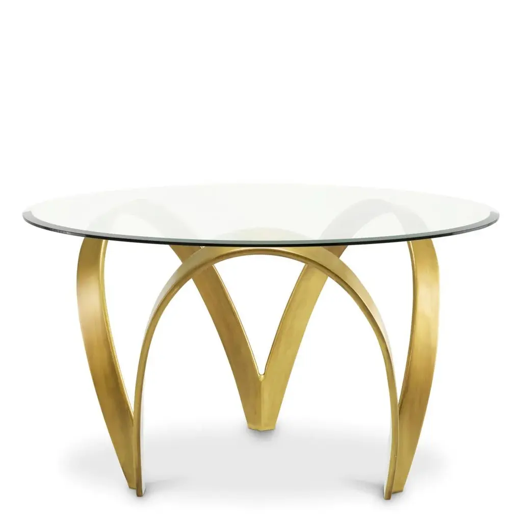 Dining table, vintage brass finish, clear bevelled glass.Add a touch of timeless elegance to your dining room with this table.Its sculptural base adds architectural interest while maintaining a sense of space and openness, perfect for formal dinners and everyday gatherings alike. The warm hue of the brass enhances the timeless charm of the table, which stands out in any interior. Also available as a coffee table, it brings the same elegant design and versatility to your living room.Ø 130 H. 76 cm
