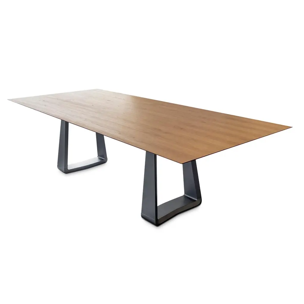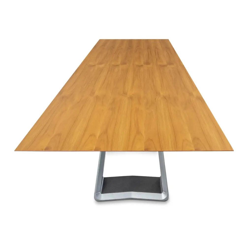 A Wing dining table designed by Sérgio Batista for Uultis with 98-inch teak veneer top and graphite metallic painted base. Please check availability prior to purchase.The Wing dining table brings an air of sophistication and timeless design to any dining space. With its expansive 98-inch teak veneer top featuring chamfered accents on the underside, this table effortlessly combines elegance and practicality. The warm tones and natural variations in the teak veneer create a unique and inviting surface, ensuring that each piece is truly one-of-a-kind. The minimalist base, crafted with a durable graphite metallic painted finish, provides a striking contrast while adding stability and strength to the design.Perfect for both residential and commercial settings, the Wing dining table is ideal for hosting memorable meals, meetings, or creative work sessions. Its generous dimensions accommodate large gatherings, making it a centerpiece for social interaction and functionality. Pair it with a set of sleek dining chairs to complete the look, or contrast it with upholstered seating for a touch of contemporary luxury.Designed by Sérgio Batista for Uultis, this table reflects the brand’s dedication to sustainability and superior craftsmanship. The chamfered accents on the tabletop and the sculptural design of the base highlight the meticulous attention to detail, ensuring the piece is as visually captivating as it is durable. Delivered with easy-to-follow assembly instructions, the Wing dining table allows you to effortlessly elevate your dining room or workspace with a touch of modern sophistication.Embrace the balance of form and function with this exquisite table, a versatile addition to both traditional and modern interiors.