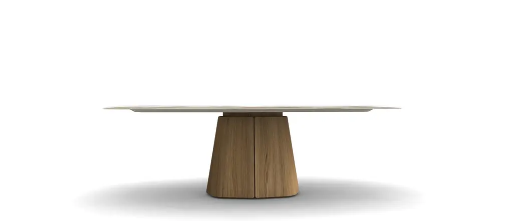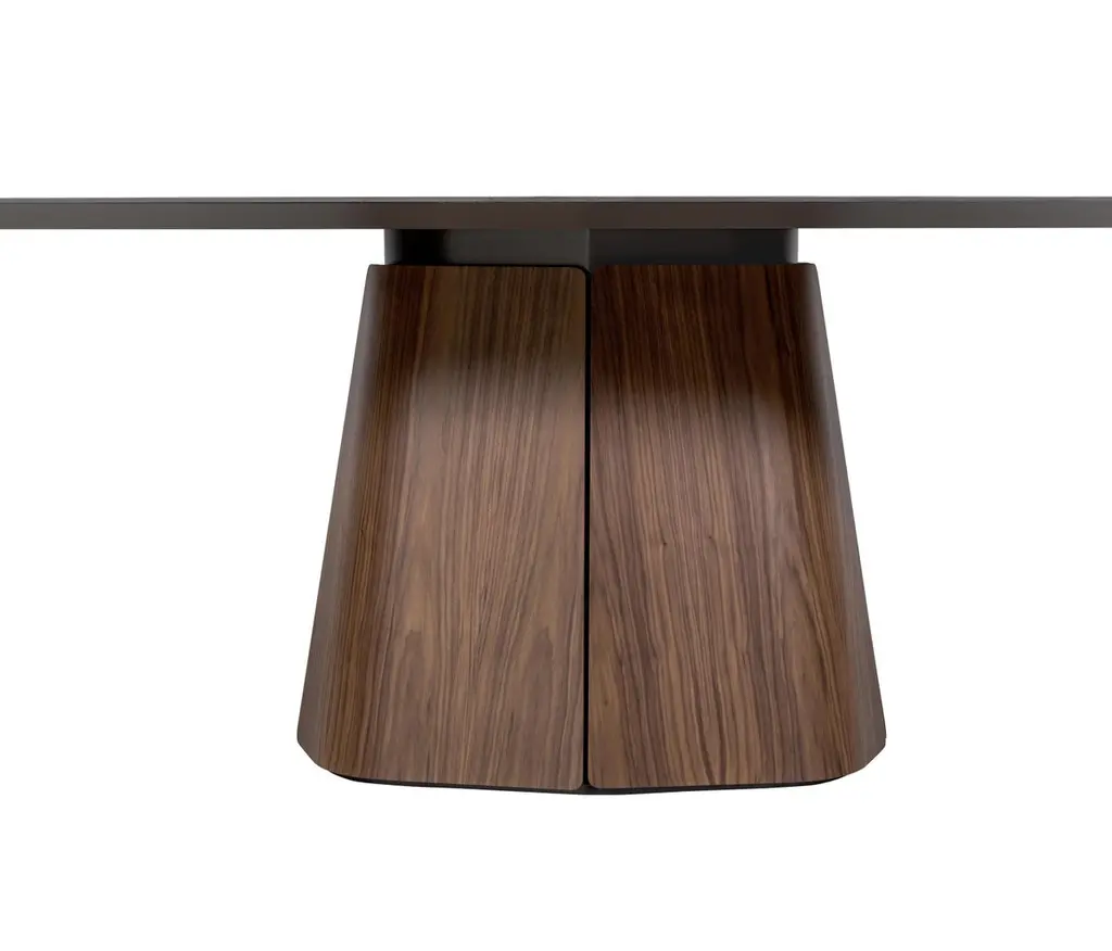 A refined statement piece, this sculptural dining table features a softly contoured rectangular top resting on a bold, tapered plinth base. Crafted in rich walnut, the table showcases a continuous grain flow and seamless transitions between surfaces, emphasizing craftsmanship and materiality. The pedestal-style base offers generous legroom and creates a clean, architectural silhouette from every angle. Ideal for contemporary interiors, this table blends organic elegance with modern simplicity, making it a striking centerpiece for dining rooms or design-forward spaces.Note: Pricing reflects the finish and material shown in the primary image. Alternate finishes and customizations are available upon request.Customization:The tabletop is offered in wood, marble, or combination.The customizable nature of the tabletop and base materials ensures that it can complement a wide range of interior styles and color schemes.Whether used in a formal dining room or a more casual setting, the table's design and quality construction make it a versatile addition to any home.Quality and Craftsmanship:Handcrafted with attention to detail and a commitment to high-quality materials and construction techniques.Please contact us if you have any questions about customization and pricing. We will be glad to check with the factory’s technical team if sizes, finishes, and colors can be customized. We do our best to expedite production and to ship and deliver product within the listed lead time, however current lead times might be longer due to global shipping backlog and delays. These delays are out of our control and cannot be a reason to cancel an order.