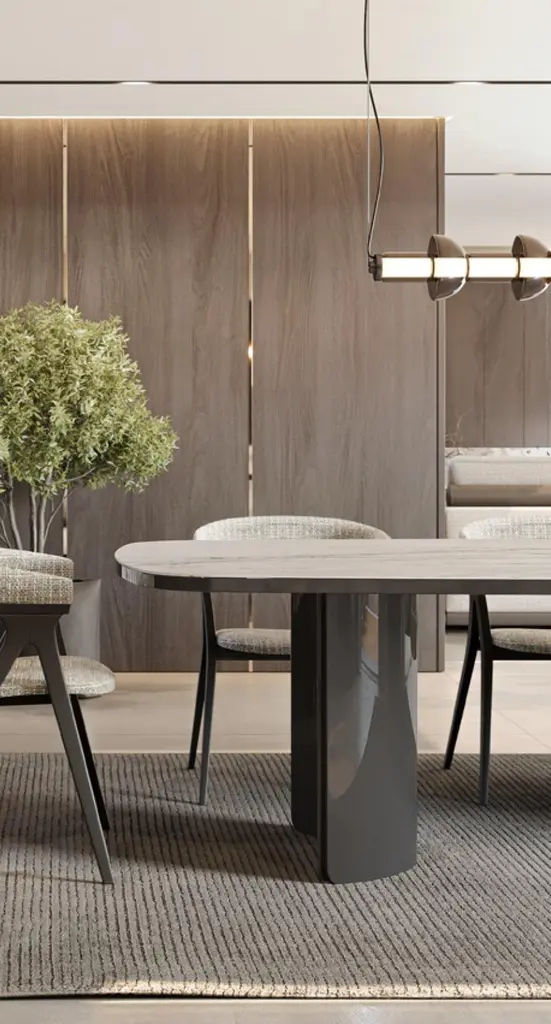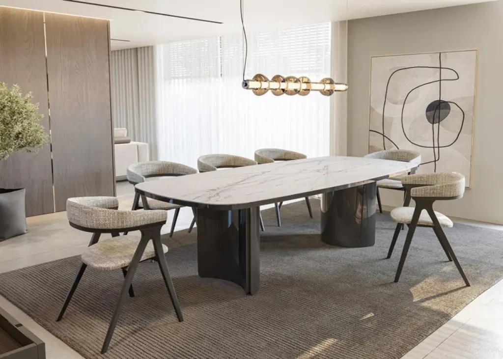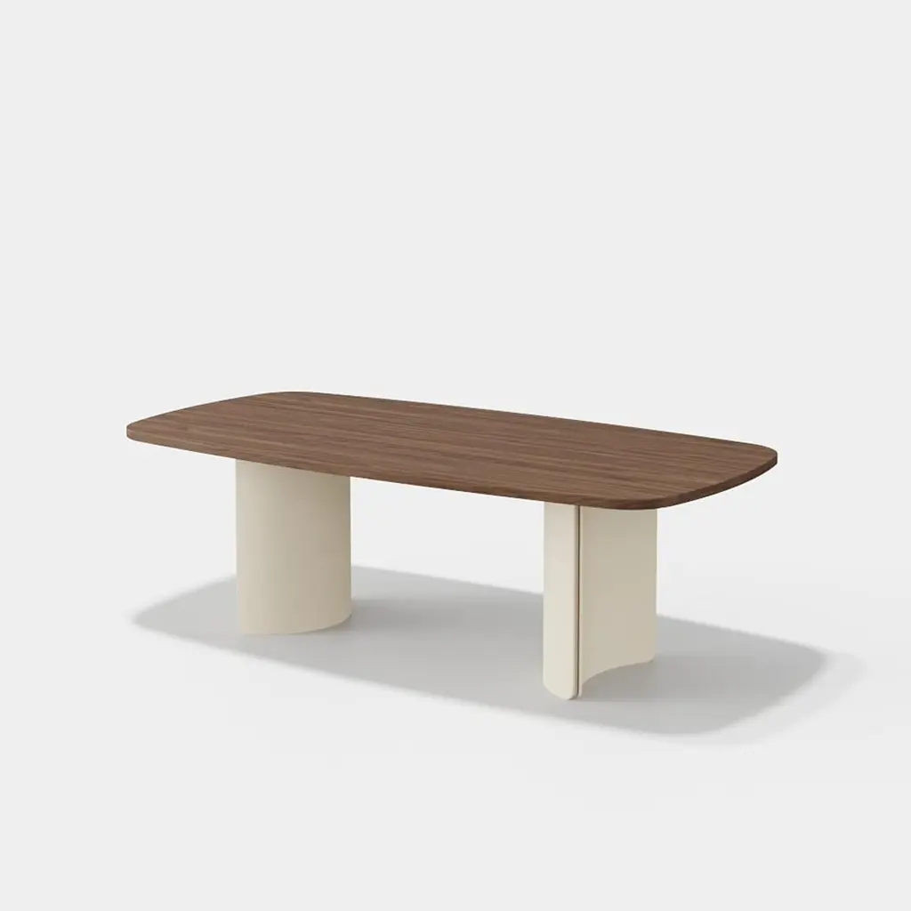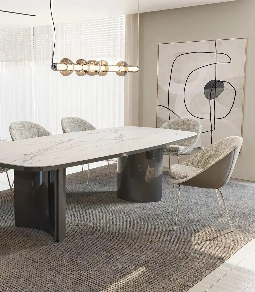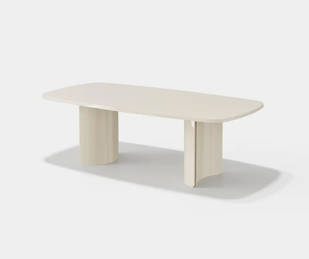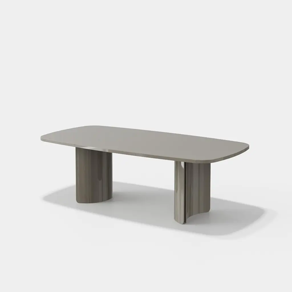An expression of contemporary sophistication, this dining table balances architectural form with understated elegance. Defined by its softly contoured rectangular top, the design prioritizes seamless functionality while maintaining a refined presence in high-end interiors.The dual-pedestal base introduces a sculptural element, featuring a juxtaposition of curved and linear profiles that enhance the table’s structural integrity while contributing to its modern aesthetic. Finished in a high-gloss beige lacquer, the surface reflects light subtly, enriching spatial depth and complementing a range of interior palettes.Engineered for both residential and hospitality environments, this piece embodies timeless craftsmanship and material refinement, making it a versatile foundation for curated dining spaces.We do our best to expedite production and to ship and deliver product within the listed lead time, however current lead times might be longer due to global shipping backlog and delays. These delays are out of our control and cannot be a reason to cancel an order.Note: Our pricing includes all shipping and custom