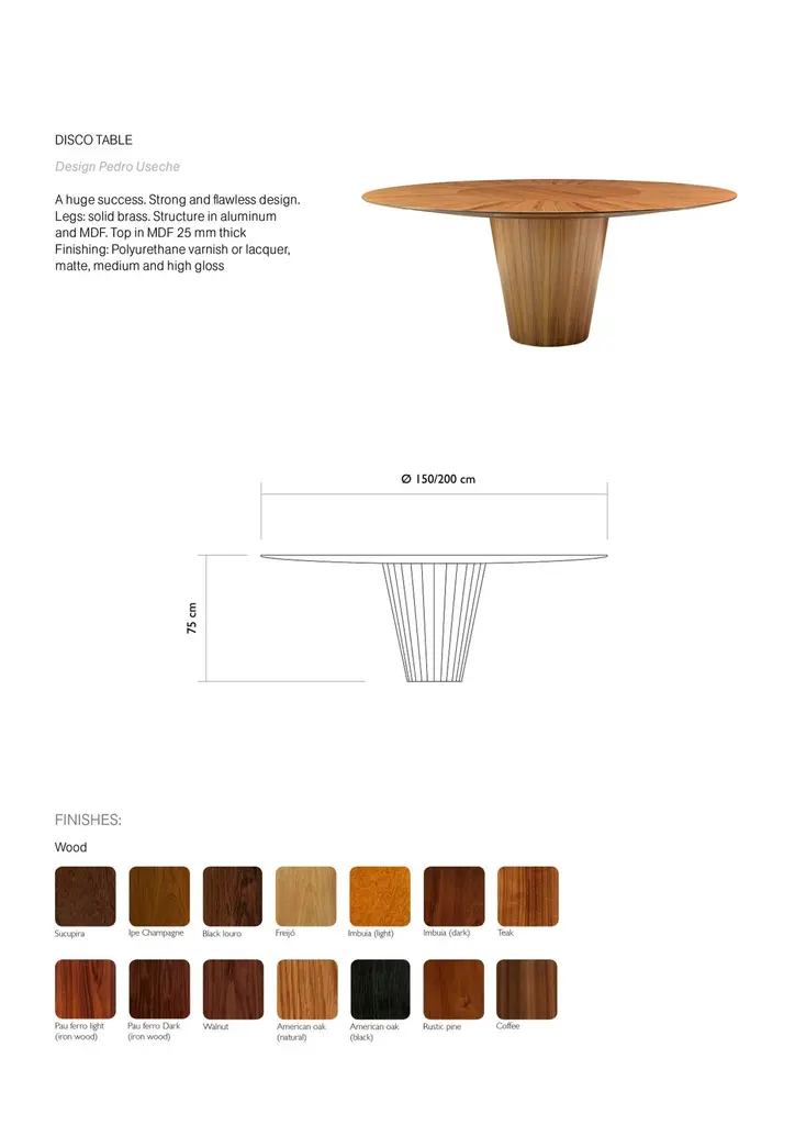 A very useful lazy susan on top and carved wood details makes it a best seller piece.The conic inverted shape of the base gives it a confortable space for the legsVeneered MDF structure.Rotating centre is optional! Ask us for detailsFinishing: Polyurethane varnish or lacquer, matte, medium and high glossConditions - please read carefullyPlease note that these are reference pictures. All items sold by Vermeil are made to order, unique and customizable. Some fabrics shown in the pictures may not be available in the moment of purchase.Since we use only natural solid woods and veneers, a considerable variation in color and design is expected. Please consider that before placing the order. Vermeil is at your complete disposal to show you an image of the sample of the wood and fabric/leather that will be used in your product. However, for natural reasons, Vermeil will not be able to show you the whole image of the final product since it will be produced after the purchase and it is not possible to see the final design of the wood pattern.We will make sure to provide the client a piece most similar to the one shown in the pictures.