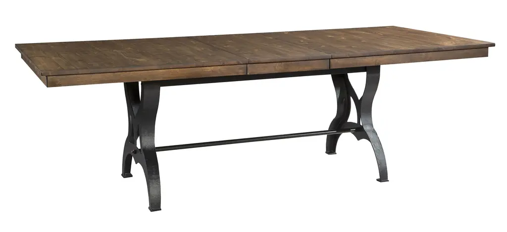 Industrial styling with cast metal accents and beautiful hardwood, the District Dining Table will stand out in your dining room. This table features unique designs including table legs fashioned after an antique sewing machine!