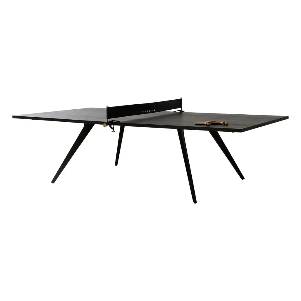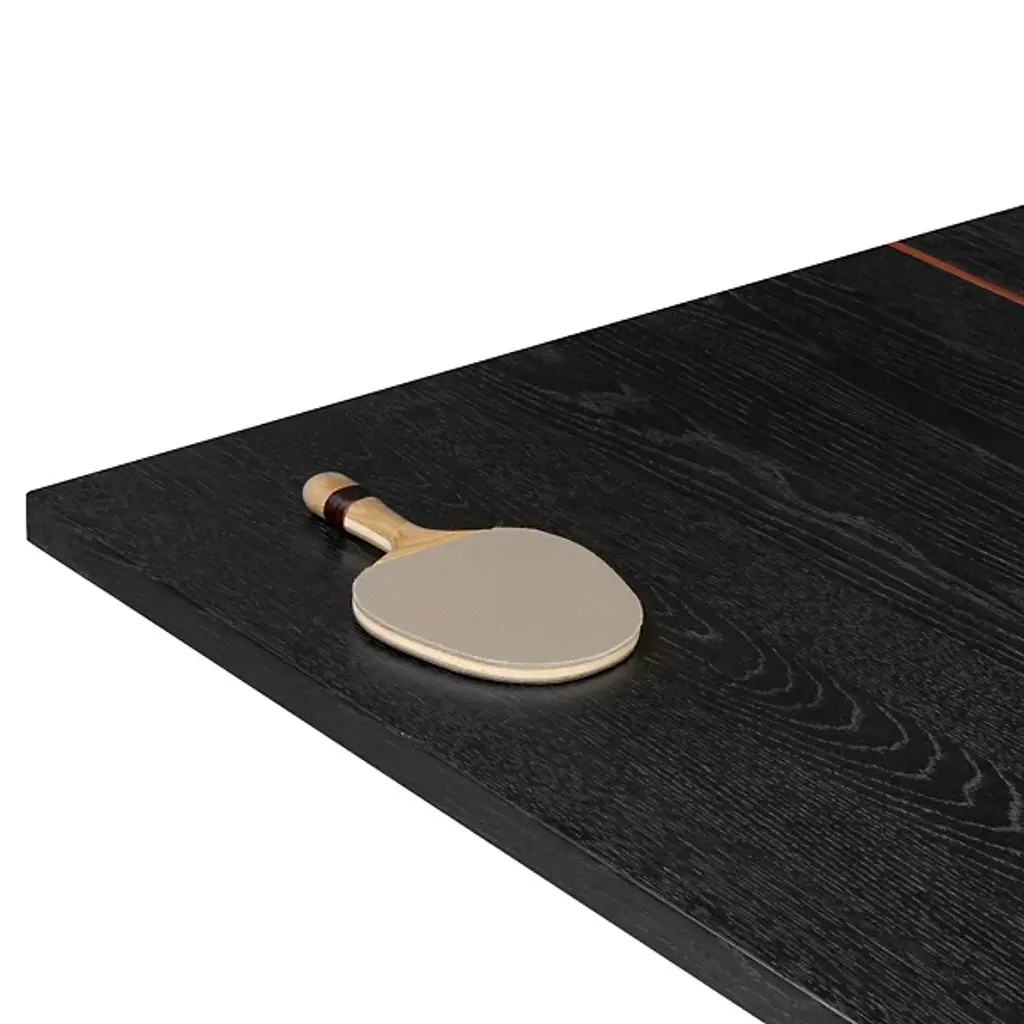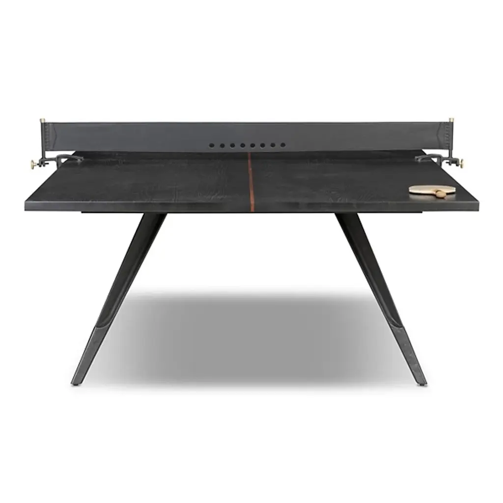 The District Eight x Four Hands Convertible Ping Pong Table features an oak plank top supported by cast iron legs that provide the weight and stability needed for serious gameplay. A leather sling net attaches with steel clamps for authentic play, then can be removed completely to convert the surface into a dining table that seats twelve people. The oak top develops character through use, while the cast iron base ensures the table remains level during both recreation and dining. Wooden paddles with leather band handles complete the set for game rooms or entertainment areas where function changes with the occasion.