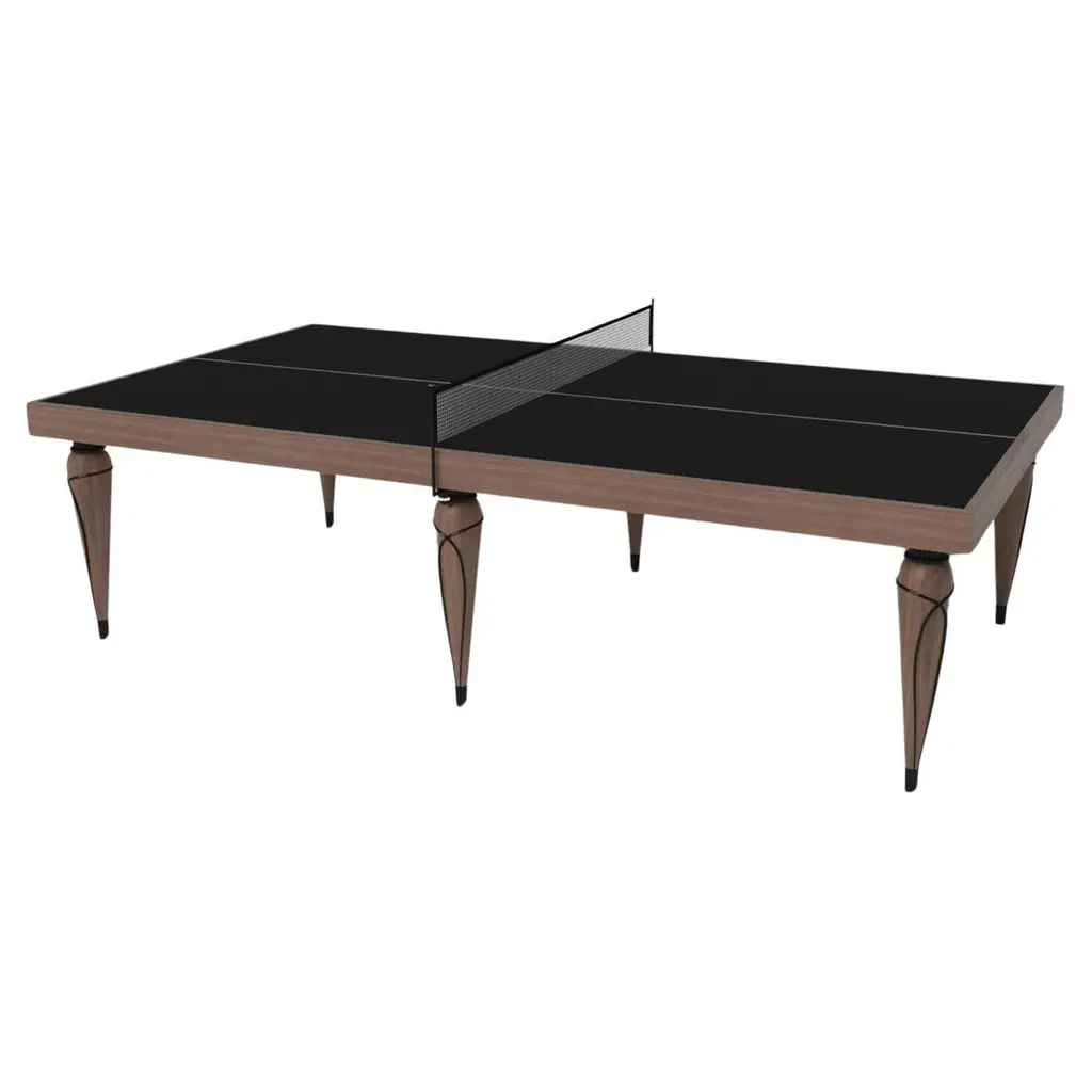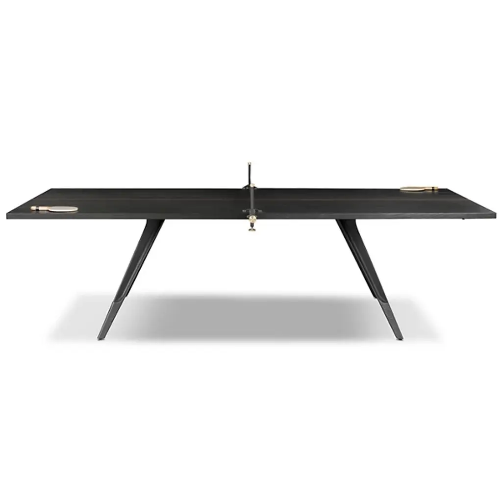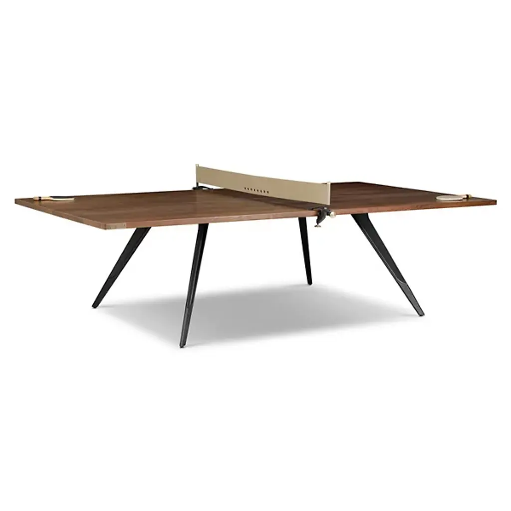 The District Eight x Four Hands Convertible Ping Pong Table features an oak plank top supported by cast iron legs that provide the weight and stability needed for serious gameplay. A leather sling net attaches with steel clamps for authentic play, then can be removed completely to convert the surface into a dining table that seats twelve people. The oak top develops character through use, while the cast iron base ensures the table remains level during both recreation and dining. Wooden paddles with leather band handles complete the set for game rooms or entertainment areas where function changes with the occasion.