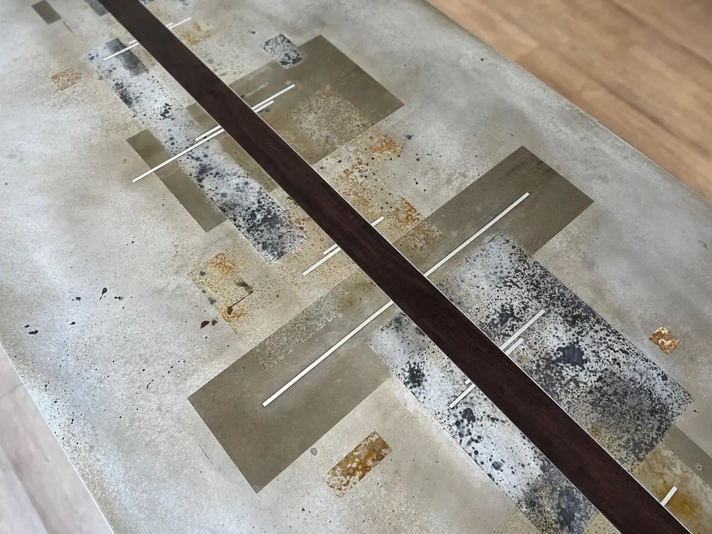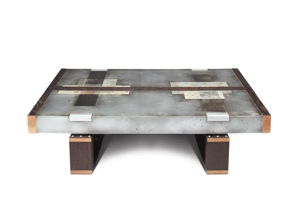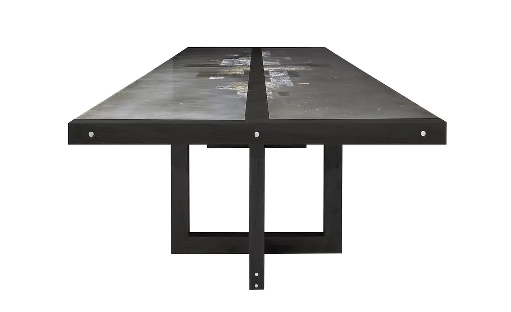 When I designed the DIVIDED LANDS table in 2004, I had no idea that it would become one of the defining pieces of my collection and of my career. It’s popularity spans across multiple continents with commissions by Louis Vuitton, celebrated designers and private collectors in cities such as Vienna, Paris, Riyadh, Hong Kong and New York.The fabrication of this piece is a form of art and technically very difficult- the signature patinas of Roeper are created with a proprietary technique using acids to etch multiple layers and colors into the zinc. This application is unique and cannot be replicated anywhere else in the world, making these tables very rare and collectible. The surface is sealed with a very durable clear lacquer which protects the patinas from spills and daily use.In conversations with my clients who have purchased this piece over the years, I’ve noticed a recurring reaction of them being deeply touched in an inexplicable way and I often hear them say: “I have been looking for the right table for a very long time and as soon as I saw this, I knew it was the one!”I believe that all people who are drawn to this piece in a special kind of way share this in common: an appreciation for patina, texture and geometric shapes, and on a deeper level, an understanding of the powerful concepts of “home” and “place” which shape our past, present and future into a world of divided lands.Shown in Etched Zinc and Ebonized Walnut. 120”x42”x29”. Custom sizes available.