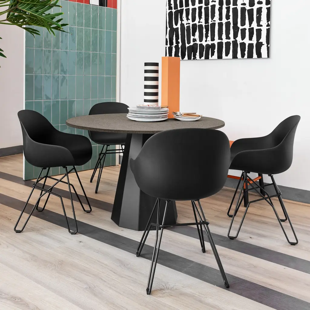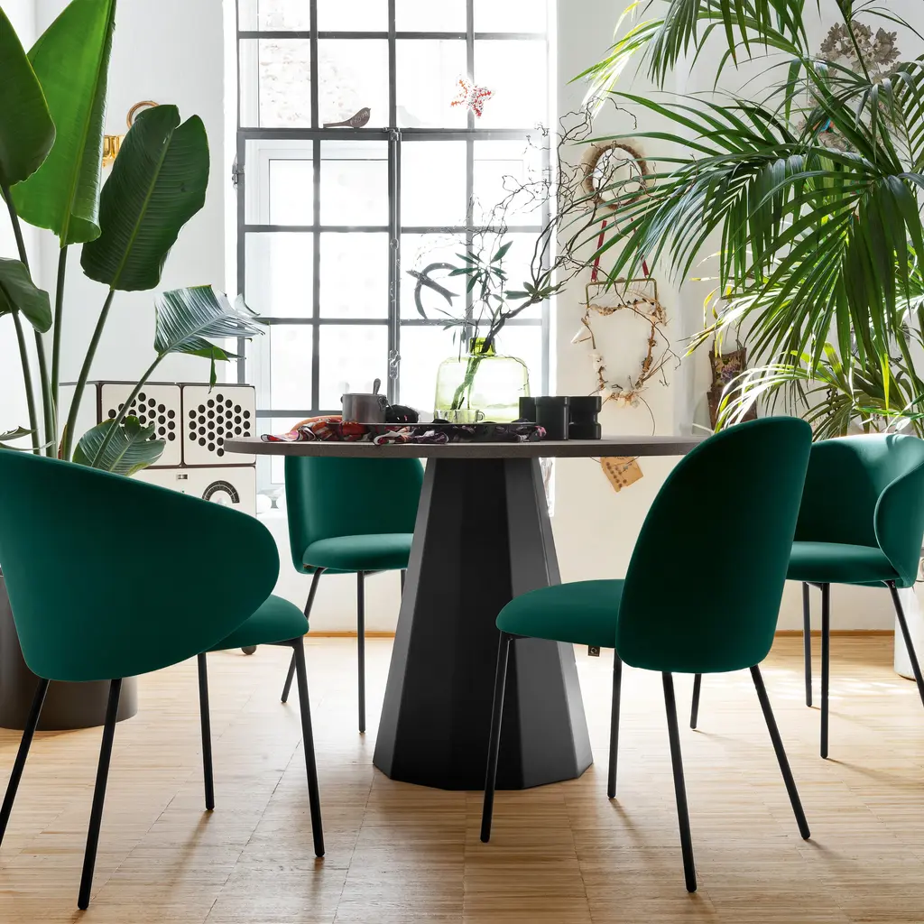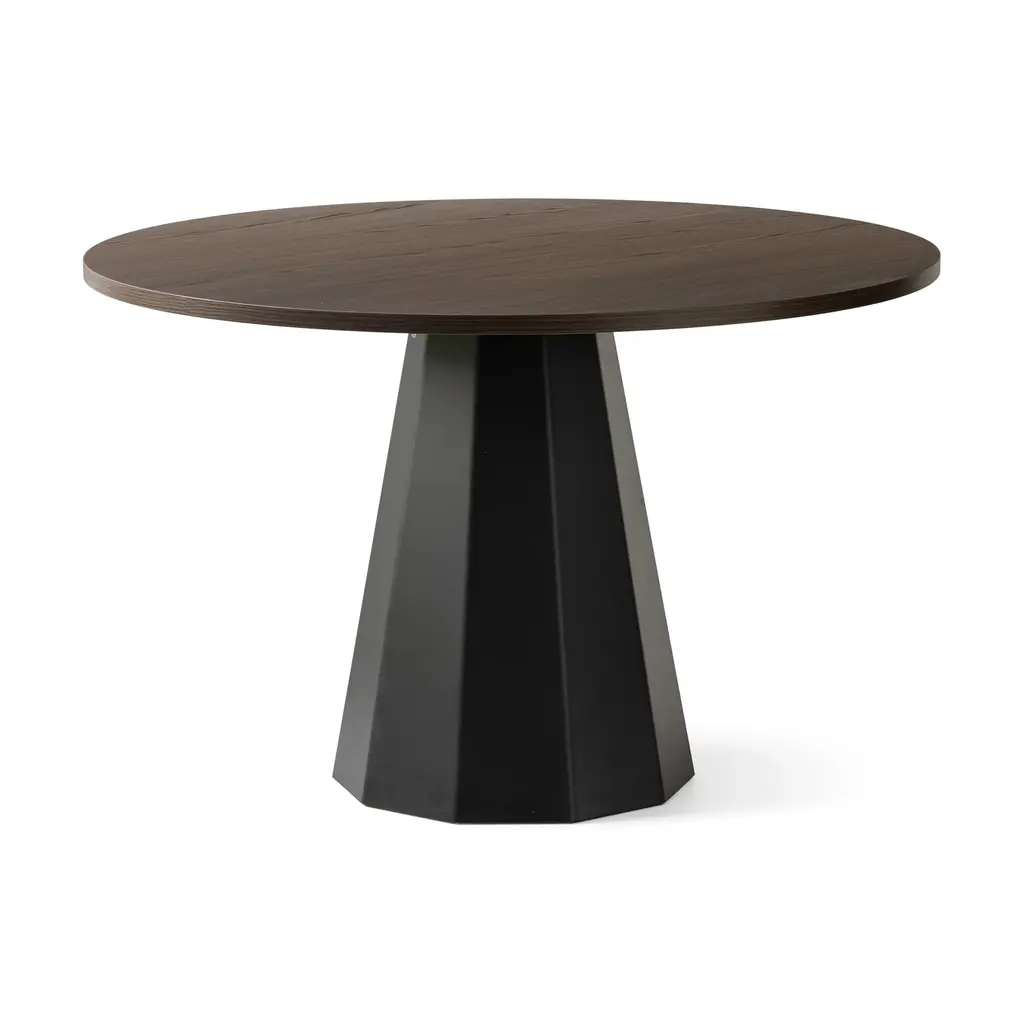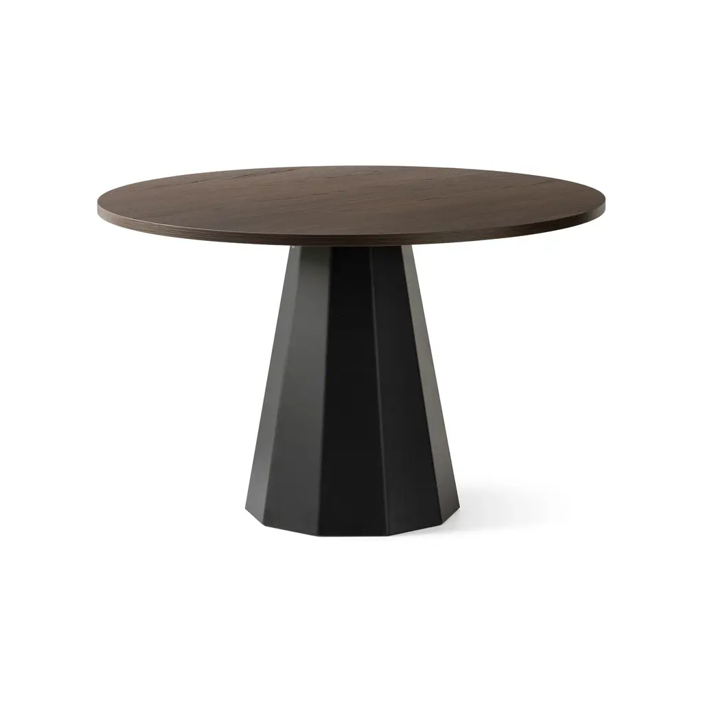 The Dix Table by Connubia is a non-extending round table, perfectly suited for a wide variety of uses in the modern home. This modern table features a ten-sided conical pedestal base made from coated faceted sheet metal, ensuring durability and stability. From the straight-edge, wooden top to the leveling feet, this table boasts delightful craftsmanship. Features